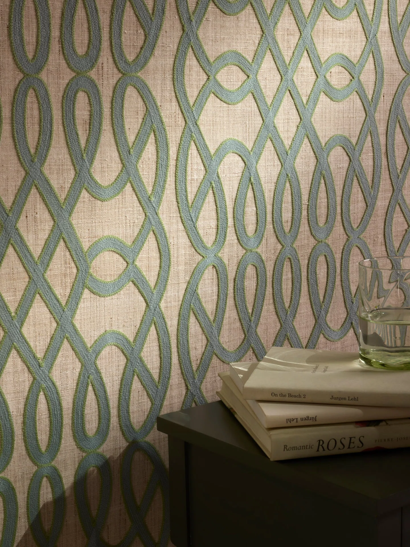 Embroidered wallcovering.Irregular appearance due to handcrafting