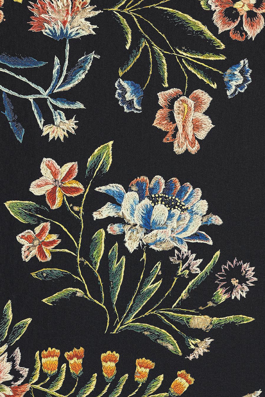 Delicate and surprising trompe l'oeil made in 3D printing. ROSELIA reinterprets a woolen embroidery with a floral motif, handmade at the beginning of the 18th century in a French workshop and preserved in the archives of the Maison Pierre Frey. Printed in wide width on satin-finish non-woven backing. Coordinated with fabric F3685 ROSELIA.