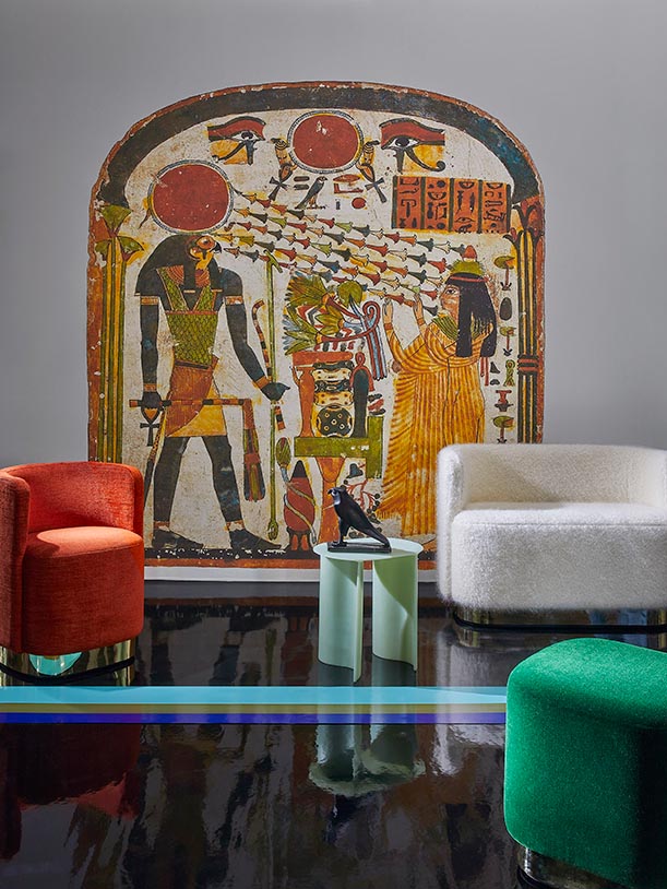 The collections of textiles, wallpapers and rugs " Merveilles d'Egypte " resonate with the sacred art, materialized by the pyramids and their decorations with a form of celebration of life on the Nile. They pay tribute to an Egyptomania born at the end of the 18th century with the Egyptian campaign, whose civilization, power, mystery and refinement have never ceased to fascinate scientists, historians and artists.