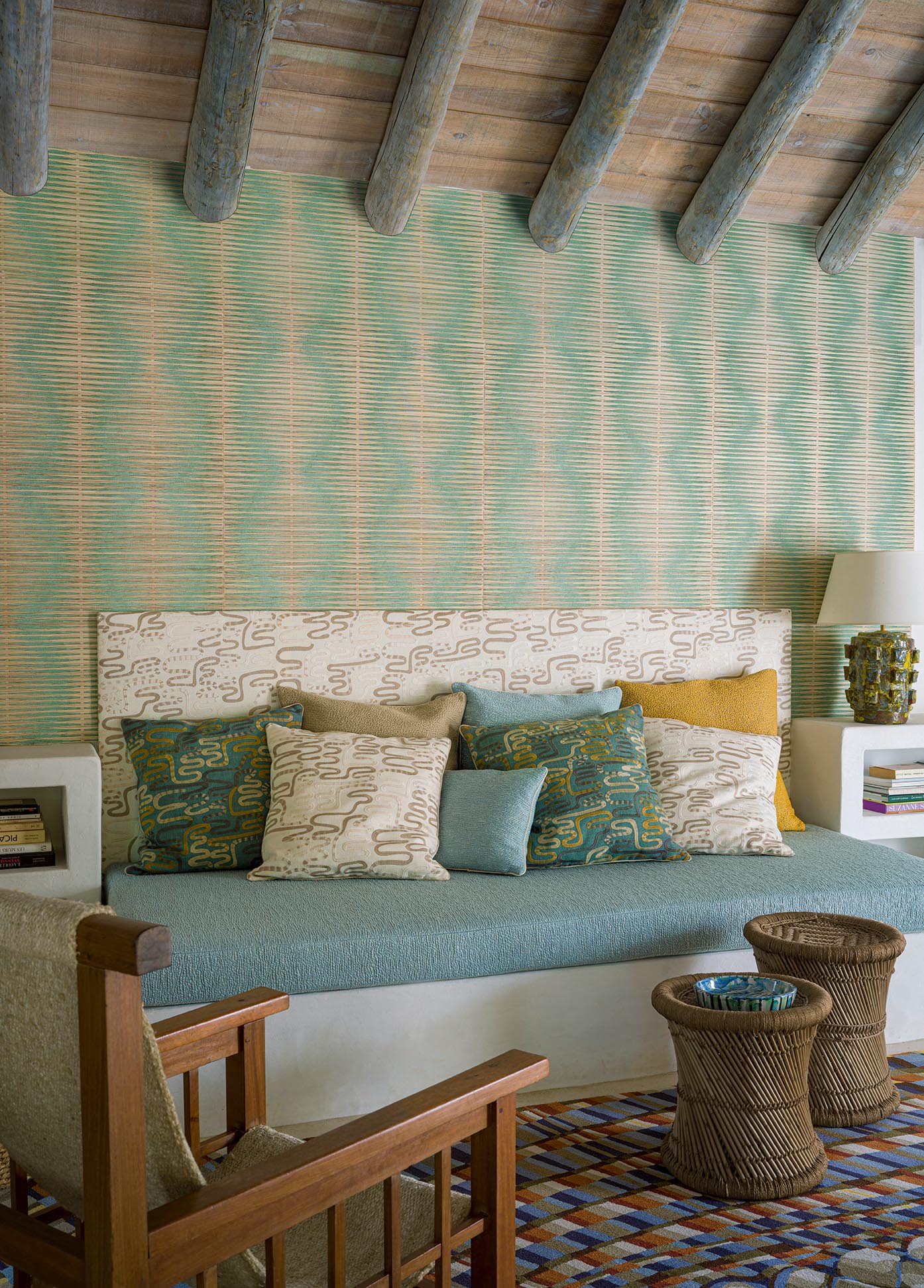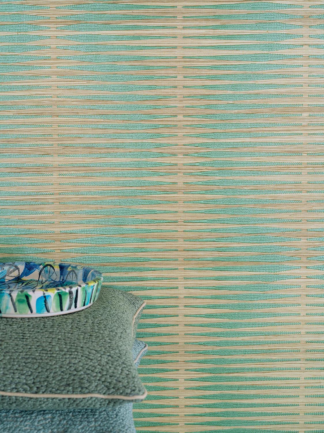 Stopover on the beach for this magnificent drawing embroidered on straw and backed on paper evoking a geometrical vision of the sea with reflections of the sun on the paradisiacal oceans.