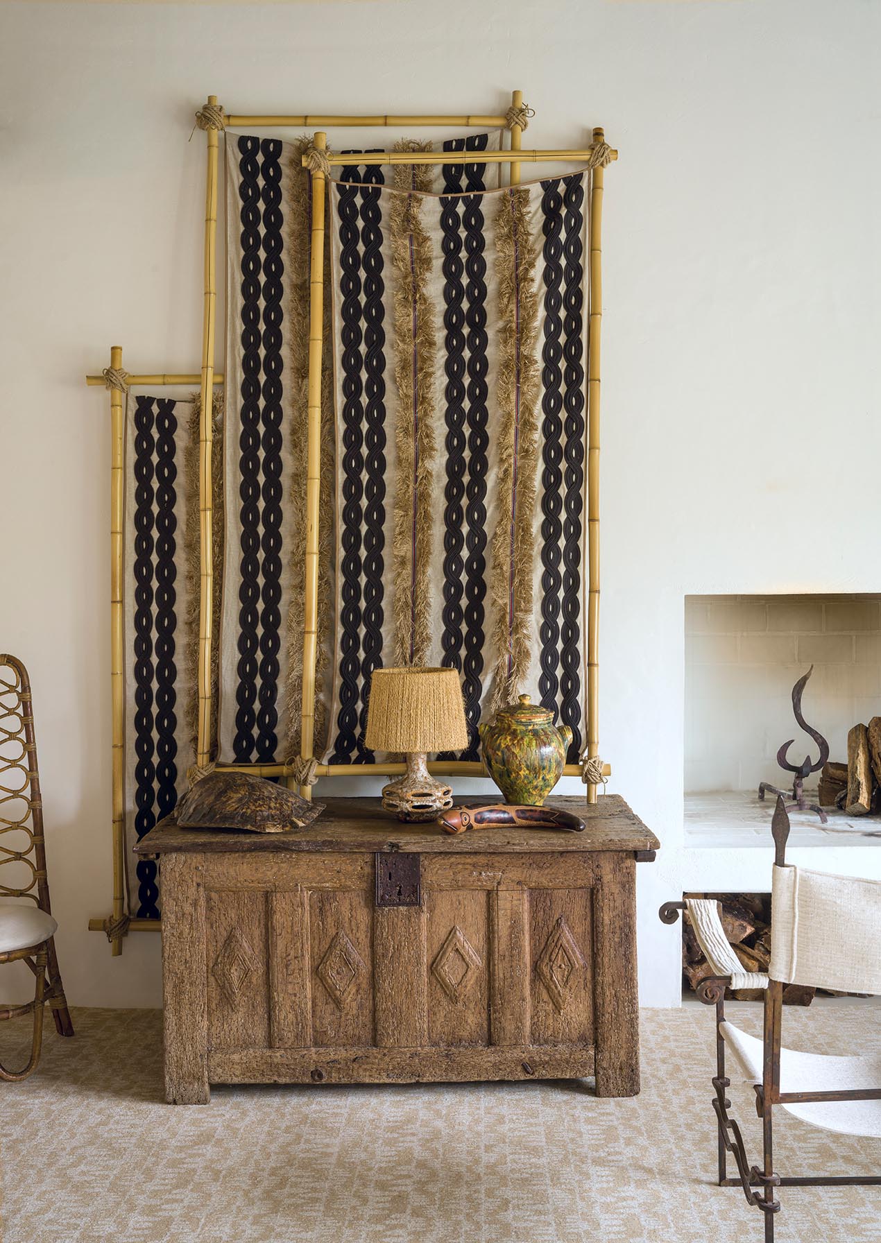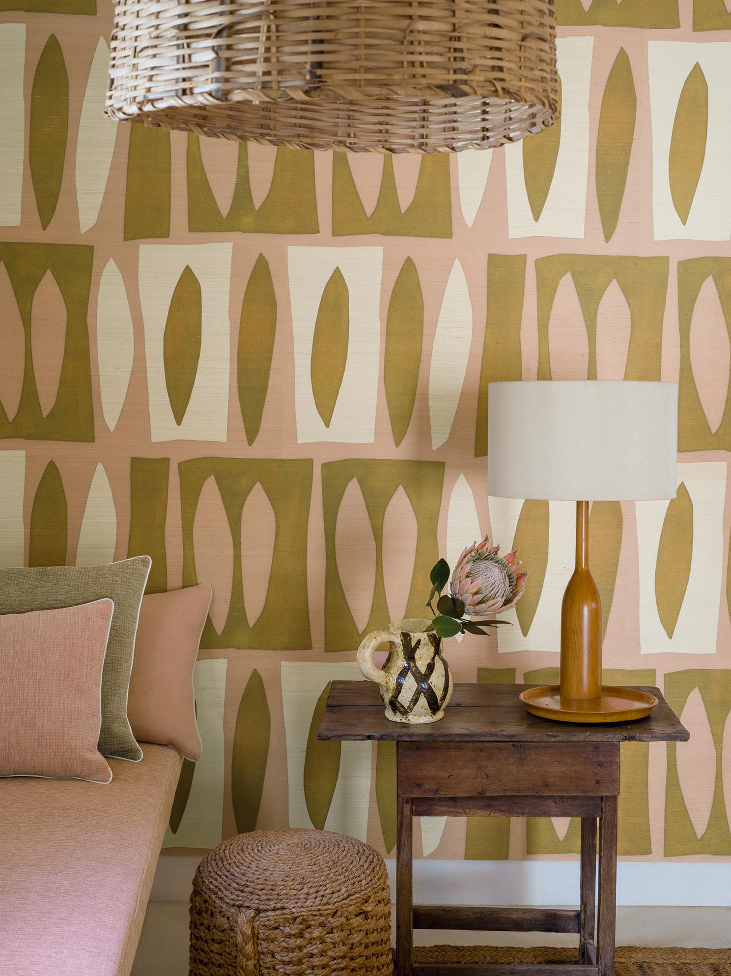 Contemporary drawing realized with ink illustrating an abstration of the elegant and fascinating silhouettes of the islands of the Tuamotu archipelago. The printing on a straw support backed on non-woven fabric gives the wallpaper a natural originality.
