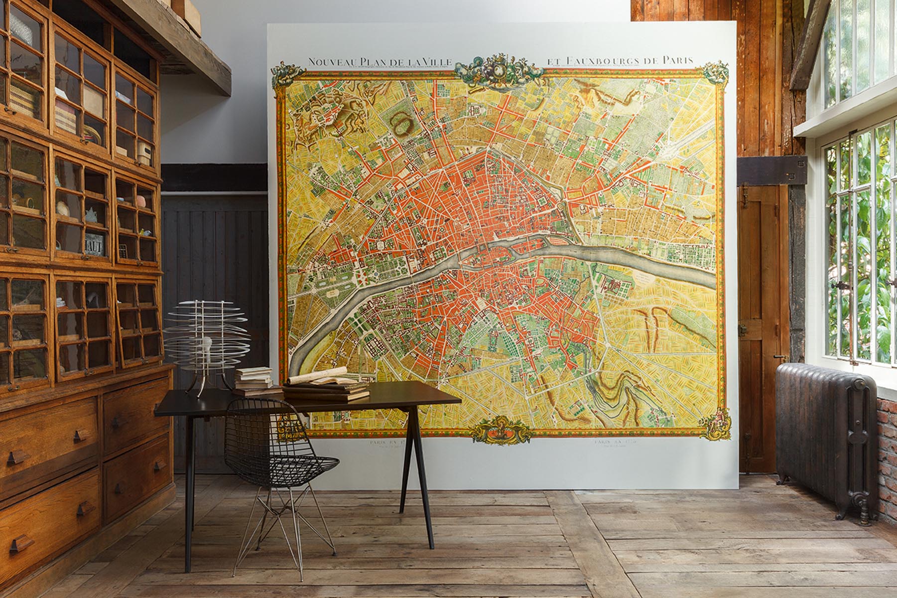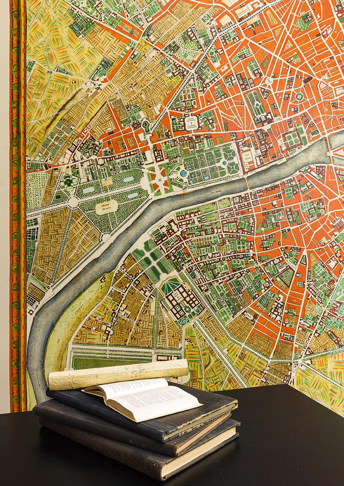 Reproduction of a map of the city and suburbs of Paris made by Jean-Baptiste-Michel Renou de Chauvigné, known as Jaillot, in 1775 and preserved in the archives of the Maison Pierre Frey. It shows the main districts and monuments of Paris, including the rue des Petits-Champs, called rue Neuve des Petits-Champs at the time, which was dear to the Maison. Printed on a non-woven backing with a glazed effect.