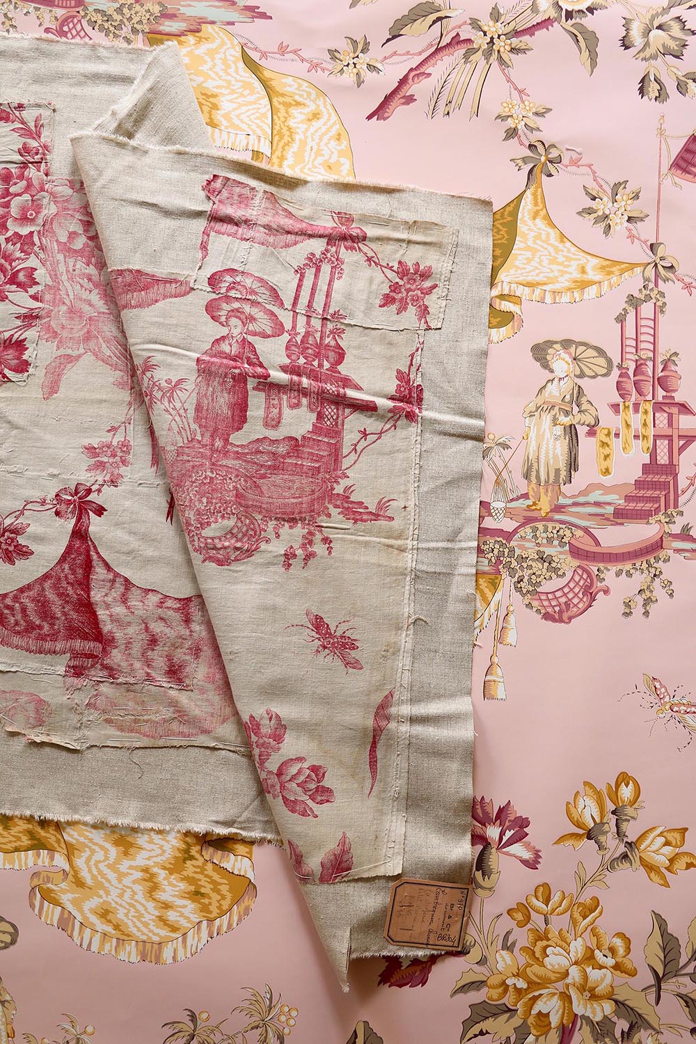 This wallpaper reproduces a motif known as "The Drapery" and is printed on cotton with the copper plate technique around 1795 by the Nantes-based manufacturer Favre, Petitpierre and Cie. It harmoniously unites a Chinese figure with a parasol and a bouquet embellished with a drapery in a theatrical style. Perfect illustration of French chinoiserie art where the iconographic European and Chinese elements are mixed together. Screen printing by hand.