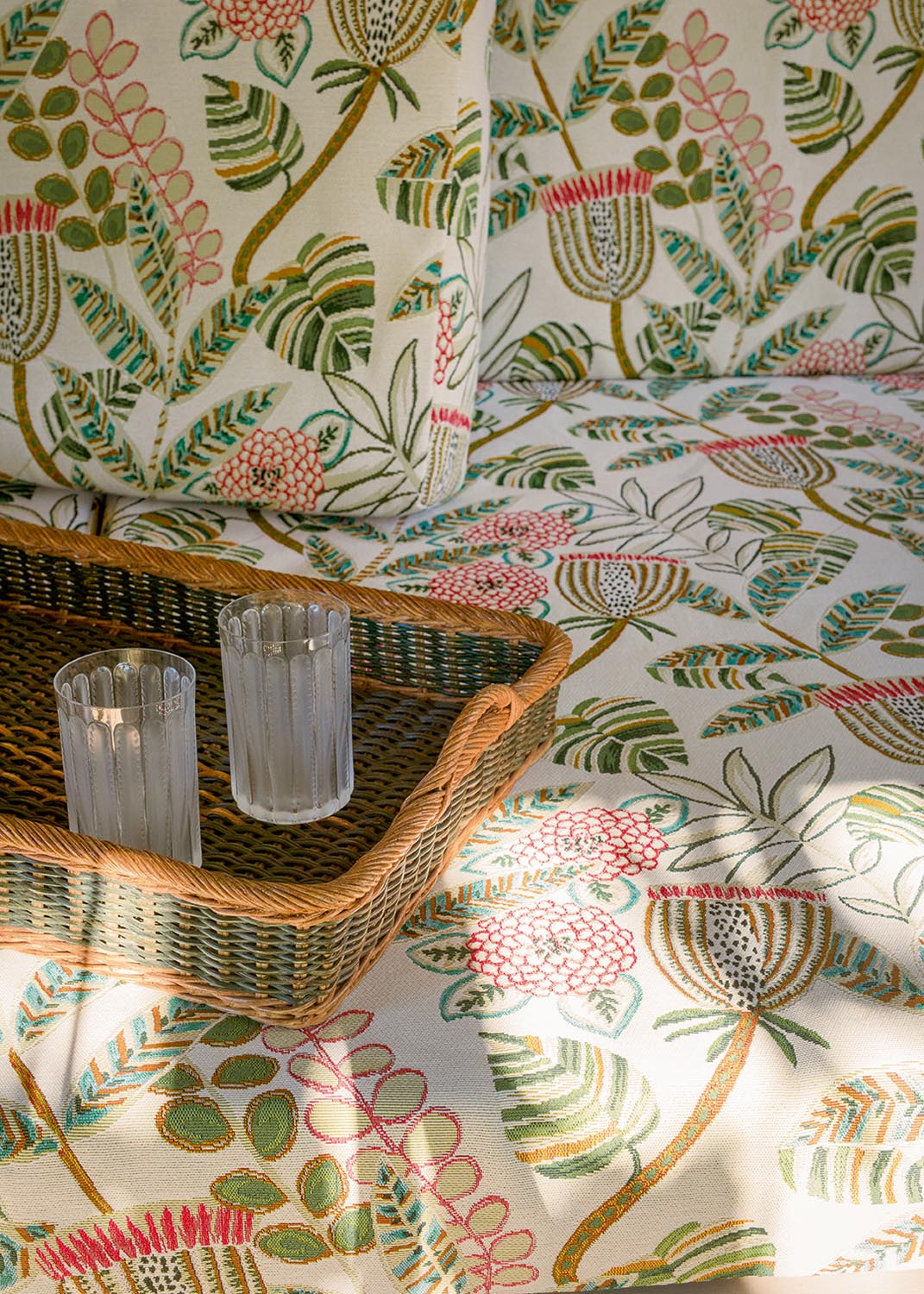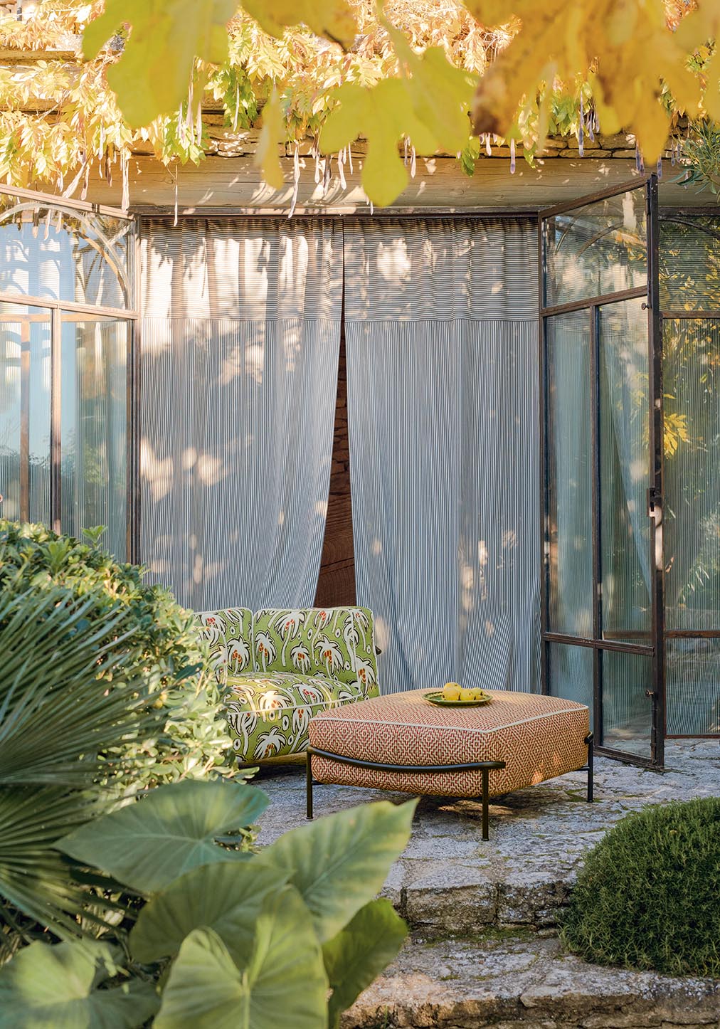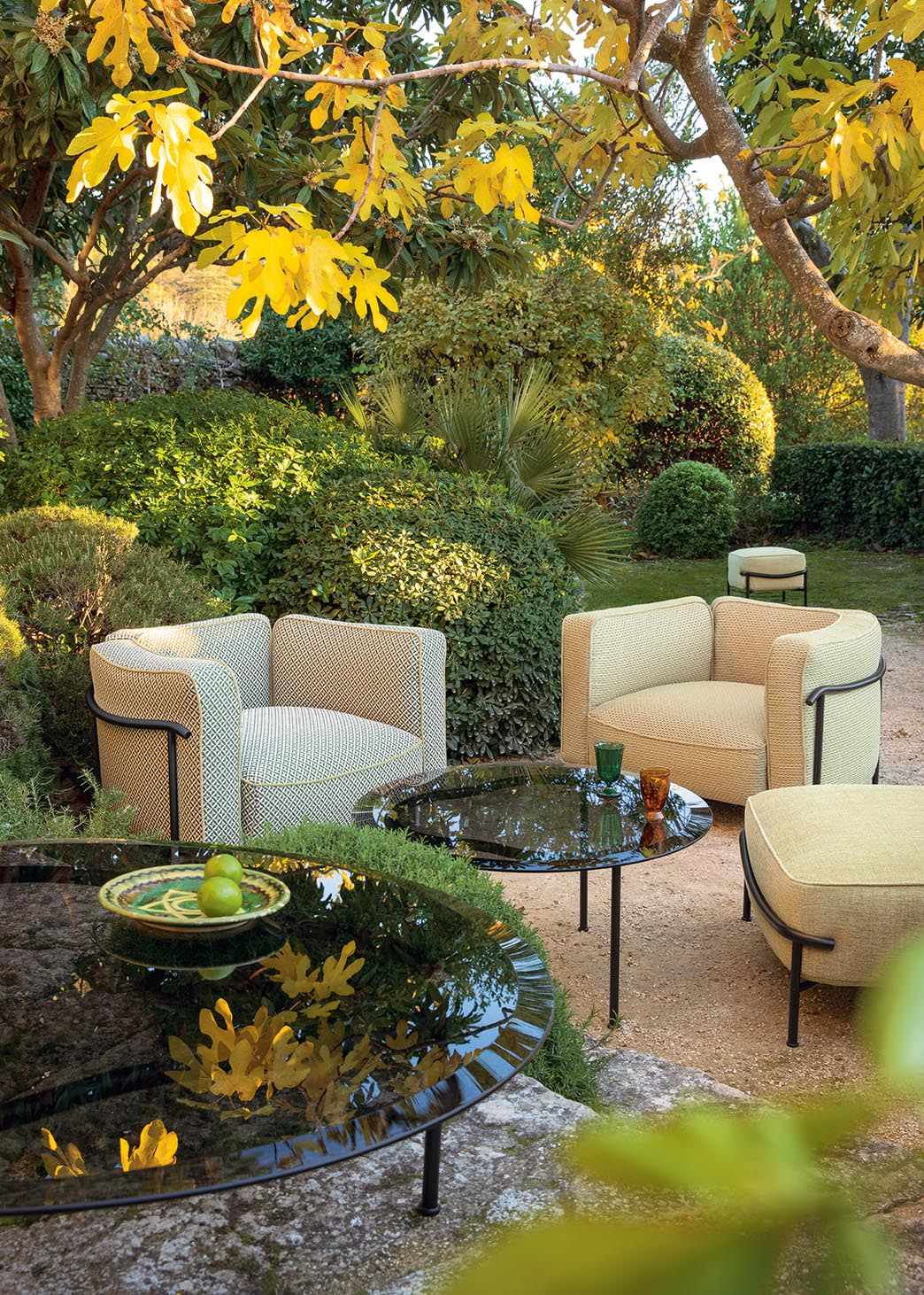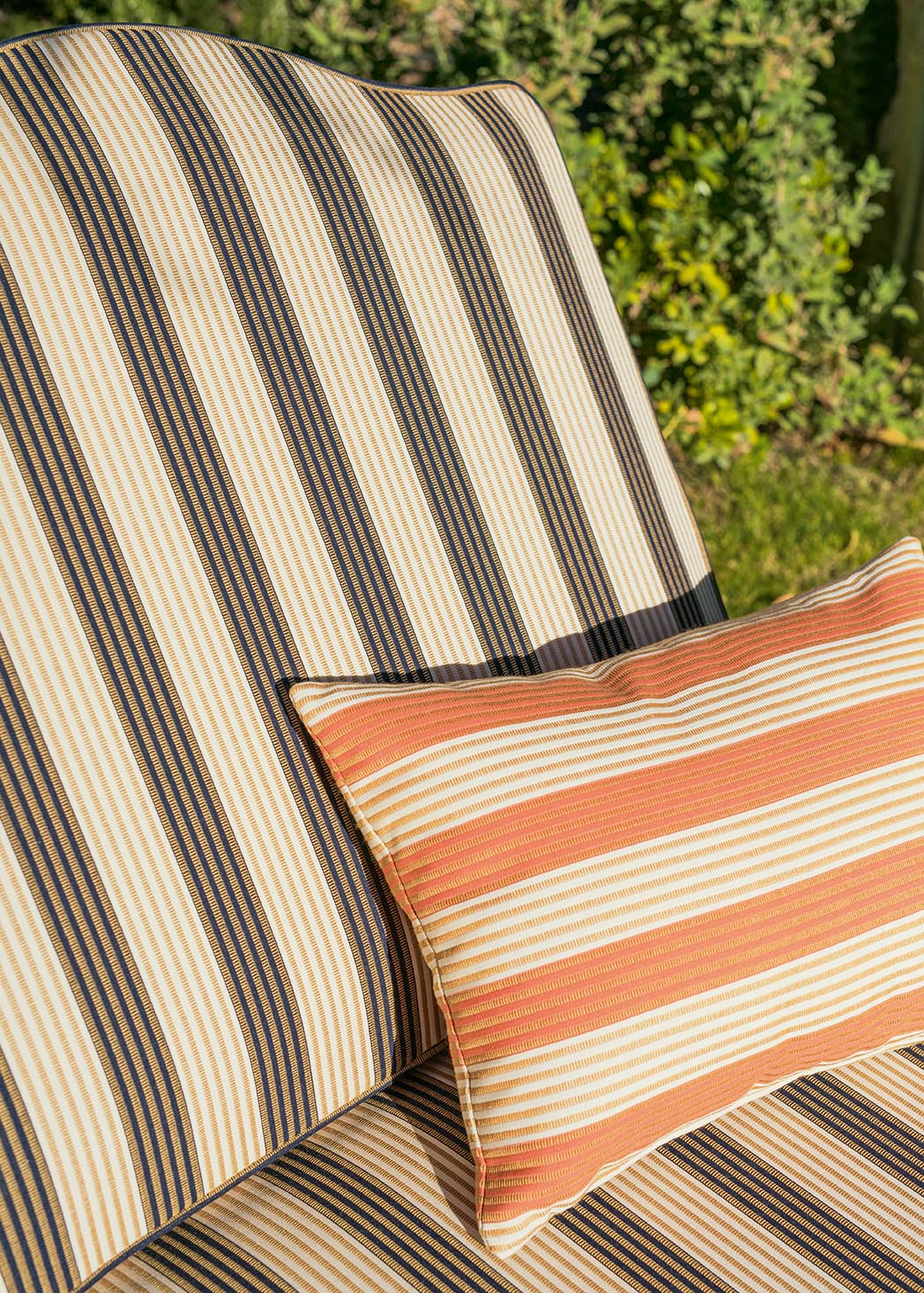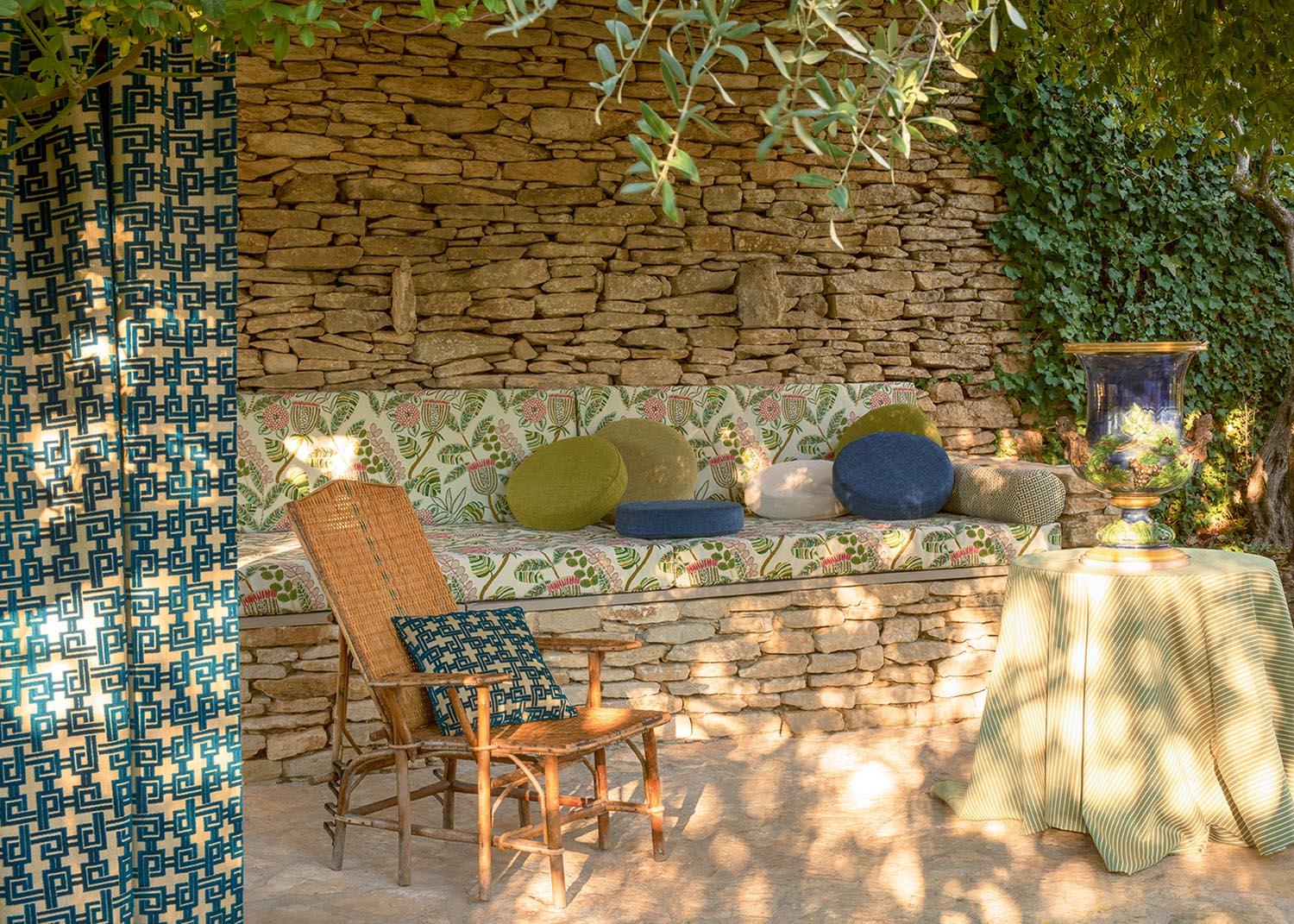 Collection In et Outdoor inspirée des plus belles plages italiennes, BELLAGIO revisite les feuillages et la palmeraie sans oublier les dessins géométriques et rayures intemporelles, dans un esprit et une gamme graphique et joyeuse. Tous les tissus sont Haute Performance, adaptés à une utilisation siège et rideau Outdoor et conservent une main particulièrement souple.