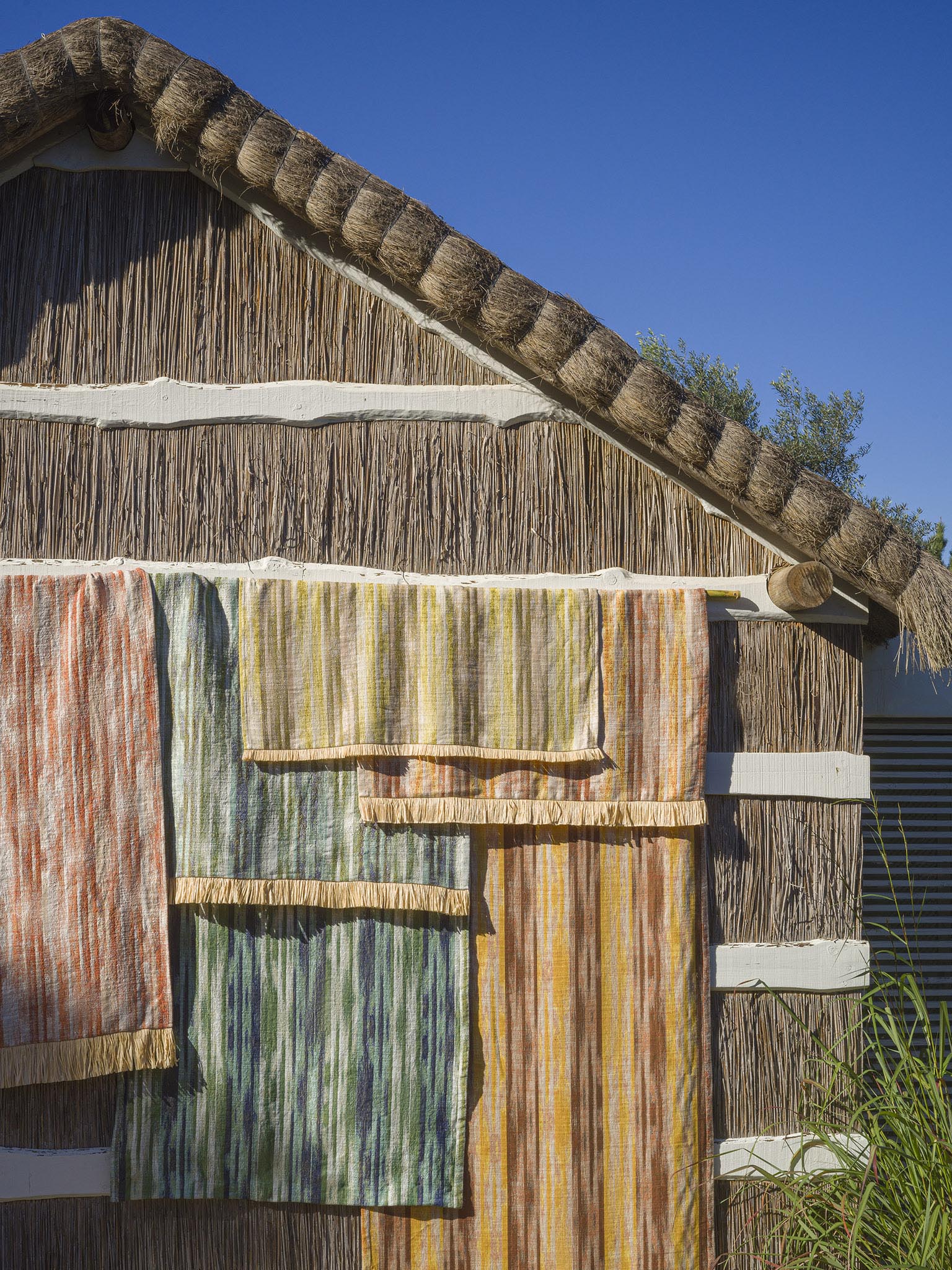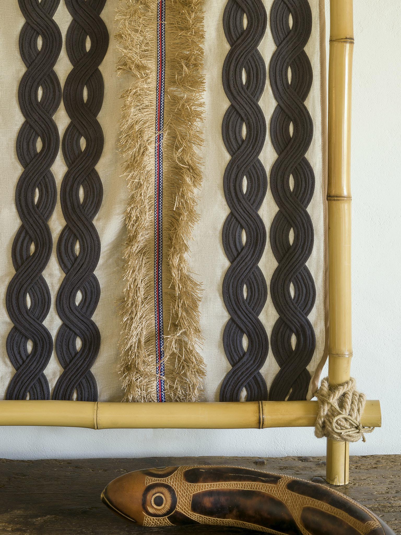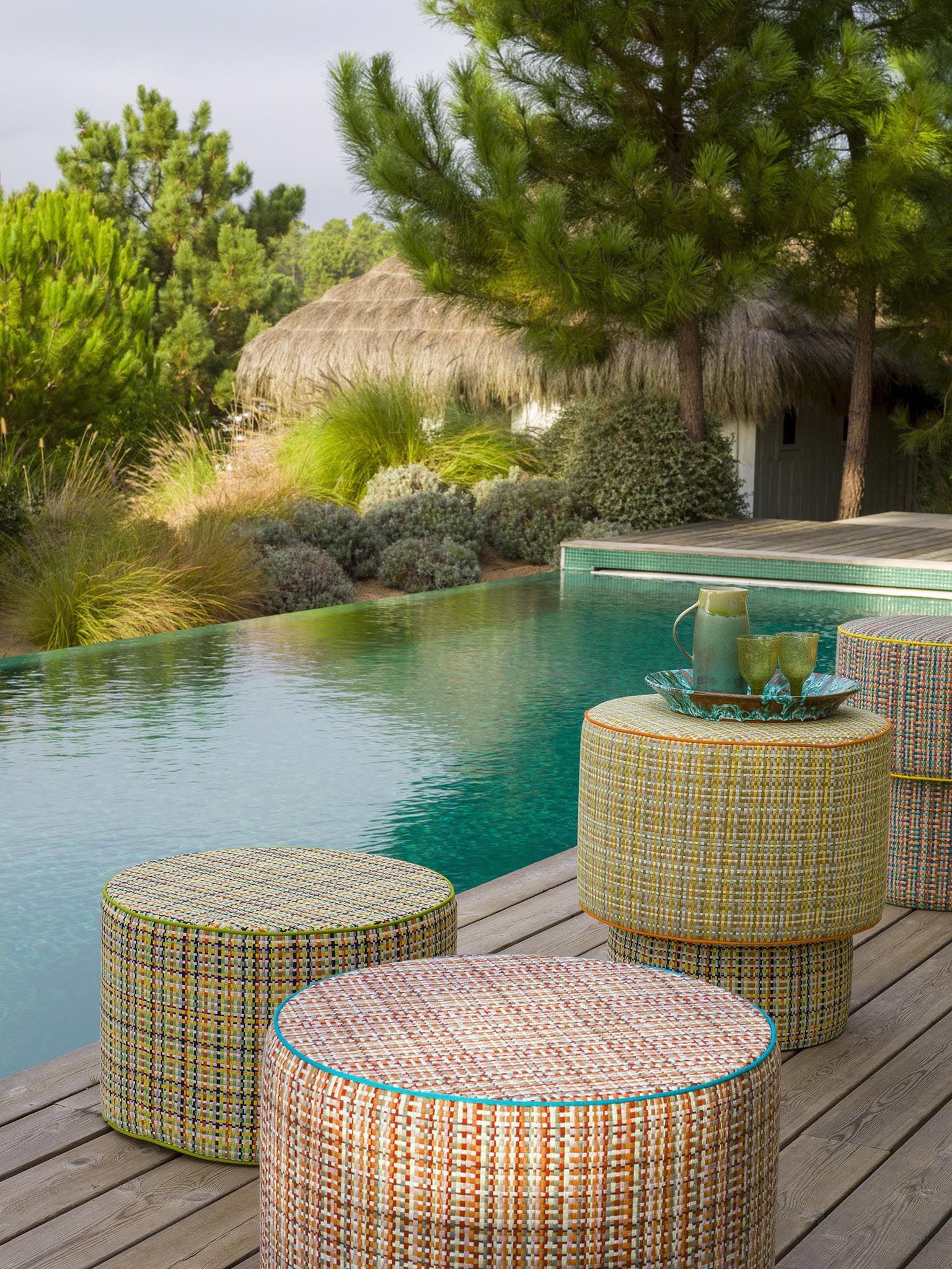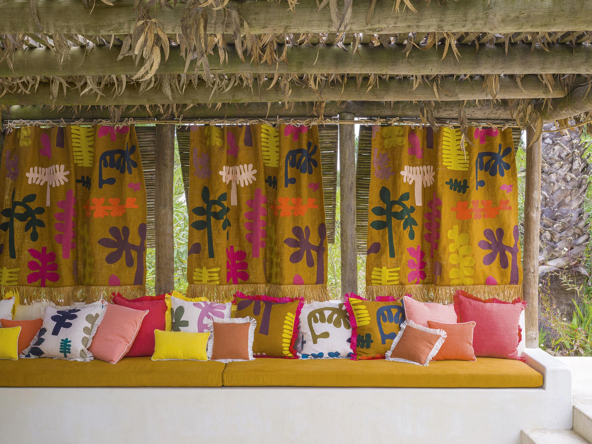 Cette collection invite à l'évasion et à la douceur de vivre où la nature sauvage et généreuse éveille nos sens. Les motifs végétaux et minéraux se déclinent dans des teintes naturelles et ocres qui nous relient à la terre, aux nacres des coquillages, mais aussi aux pailles des habitations. Les dessins, ondulant au rythme des chants et danses traditionnelles, reflètent les coloris bleu et vert des lagons infinis. La chaleur dorée des rayons du soleil illumine et sublime les motifs aux accents exotiques. Ouverte vers l'extérieur, la maison devient paysage.