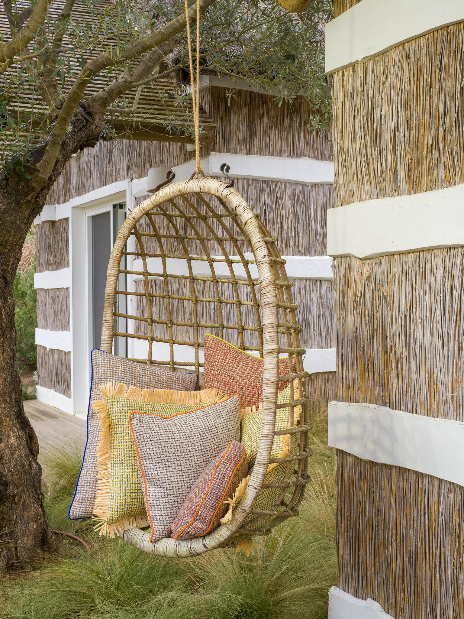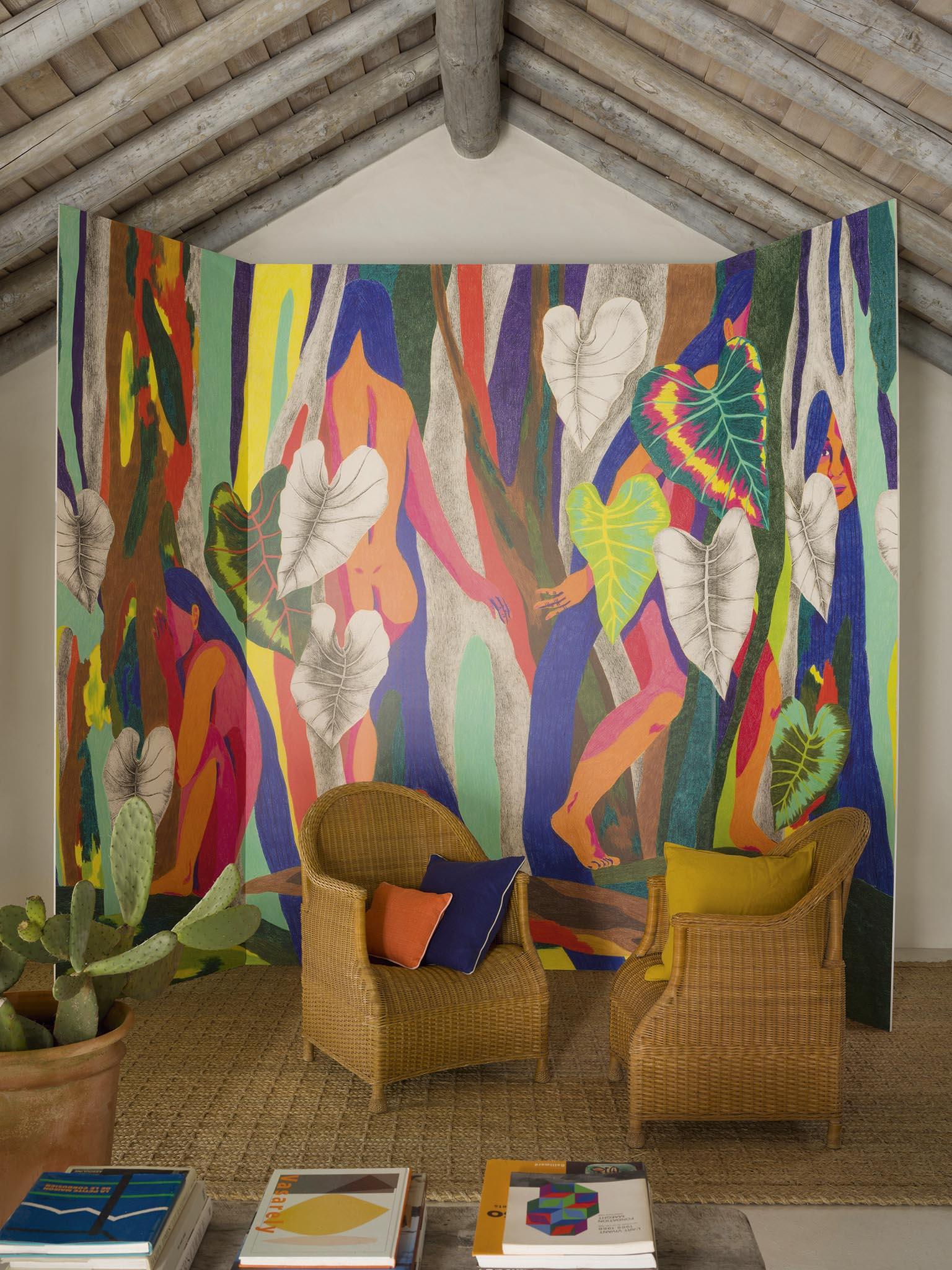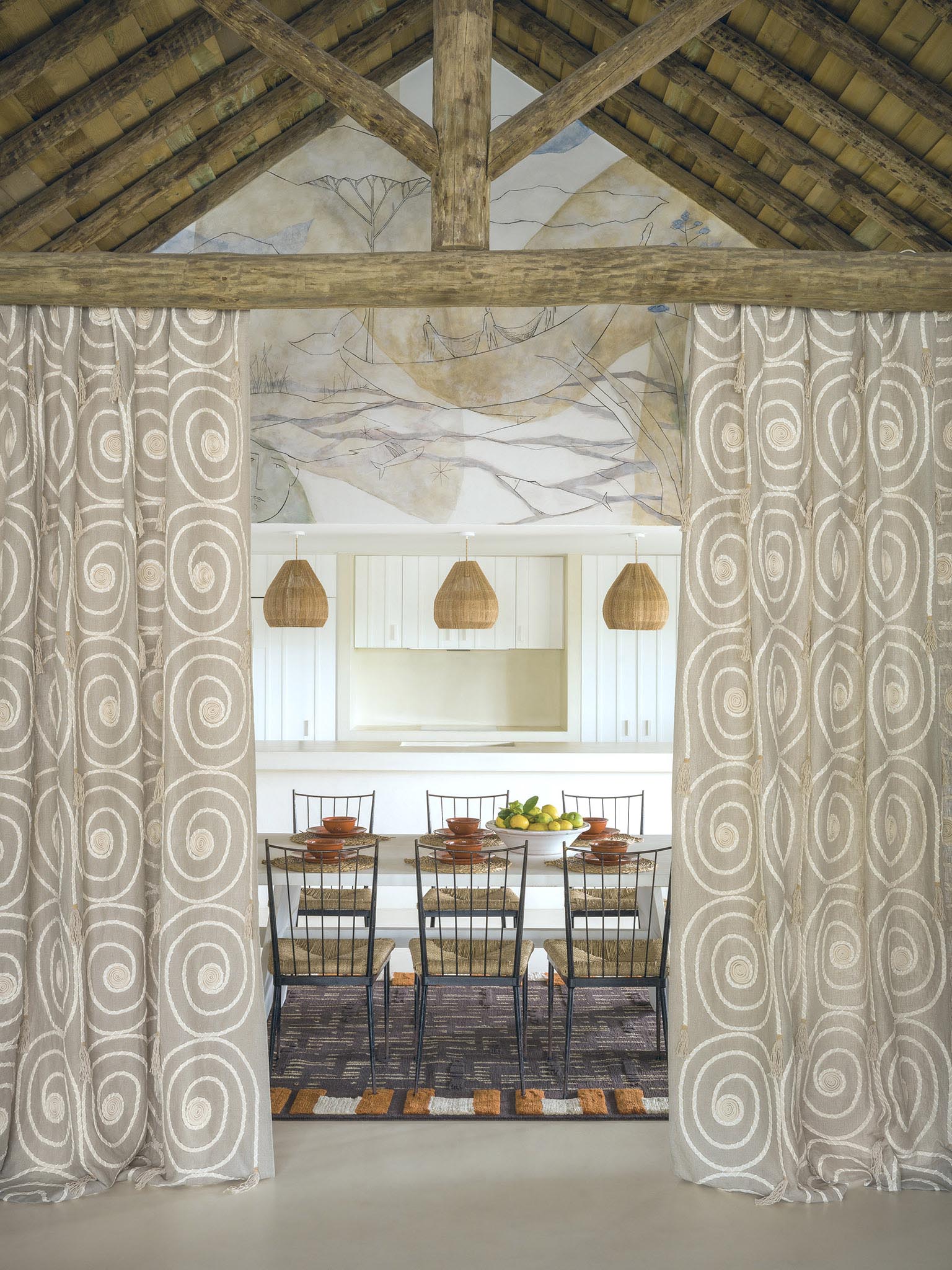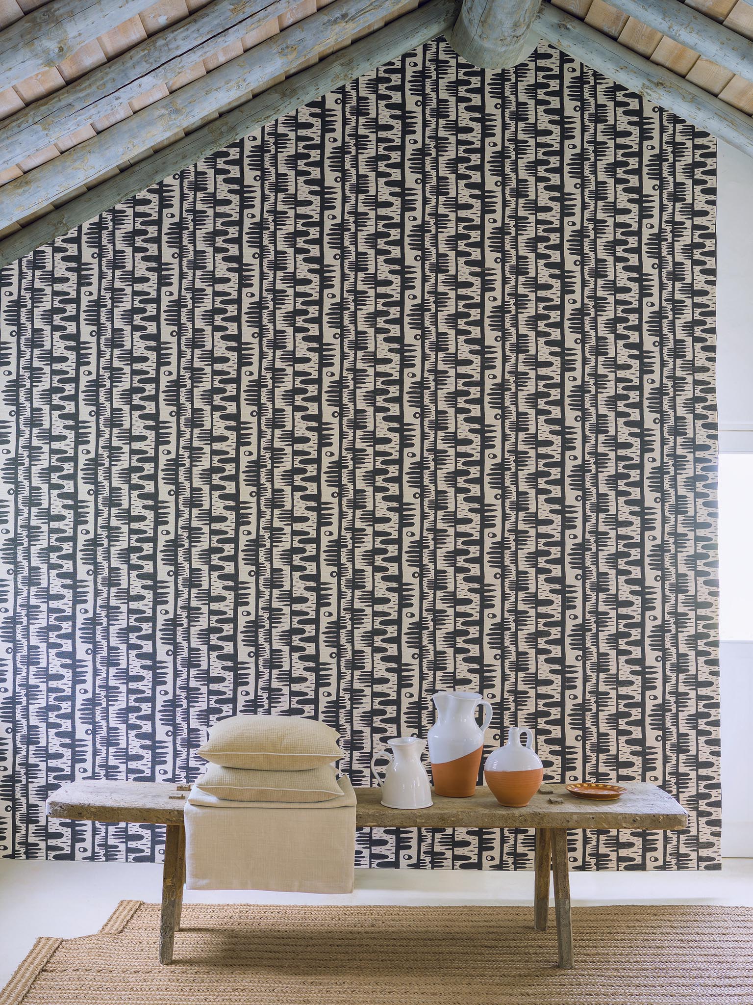 Cette collection invite à l'évasion et à la douceur de vivre où la nature sauvage et généreuse éveille nos sens. Les motifs végétaux et minéraux se déclinent dans des teintes naturelles et ocres qui nous relient à la terre, aux nacres des coquillages, mais aussi aux pailles des habitations. Les dessins, ondulant au rythme des chants et danses traditionnelles, reflètent les coloris bleu et vert des lagons infinis. La chaleur dorée des rayons du soleil illumine et sublime les motifs aux accents exotiques. Ouverte vers l'extérieur, la maison devient paysage.