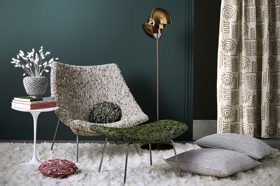 Composée de jacquards, de broderies, de tissages et d’imprimés non figuratifs, elle laisse la part belle aux motifs géométriques et aux imprimés influencés par l’expressionisme abstrait. Le jeu des belles matières naturelles, lin, coton, laine, soie végétale et raphia, traduit une quête d’essentiel et de douceur.