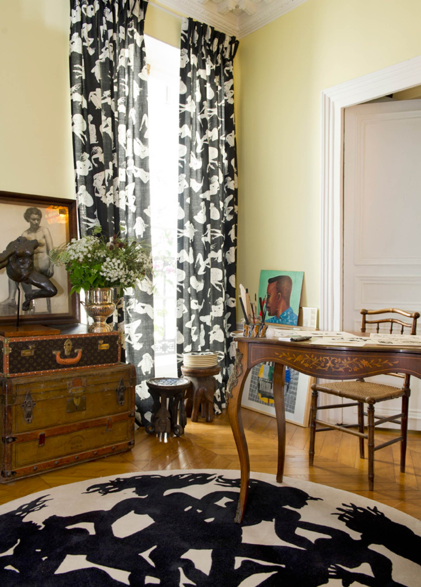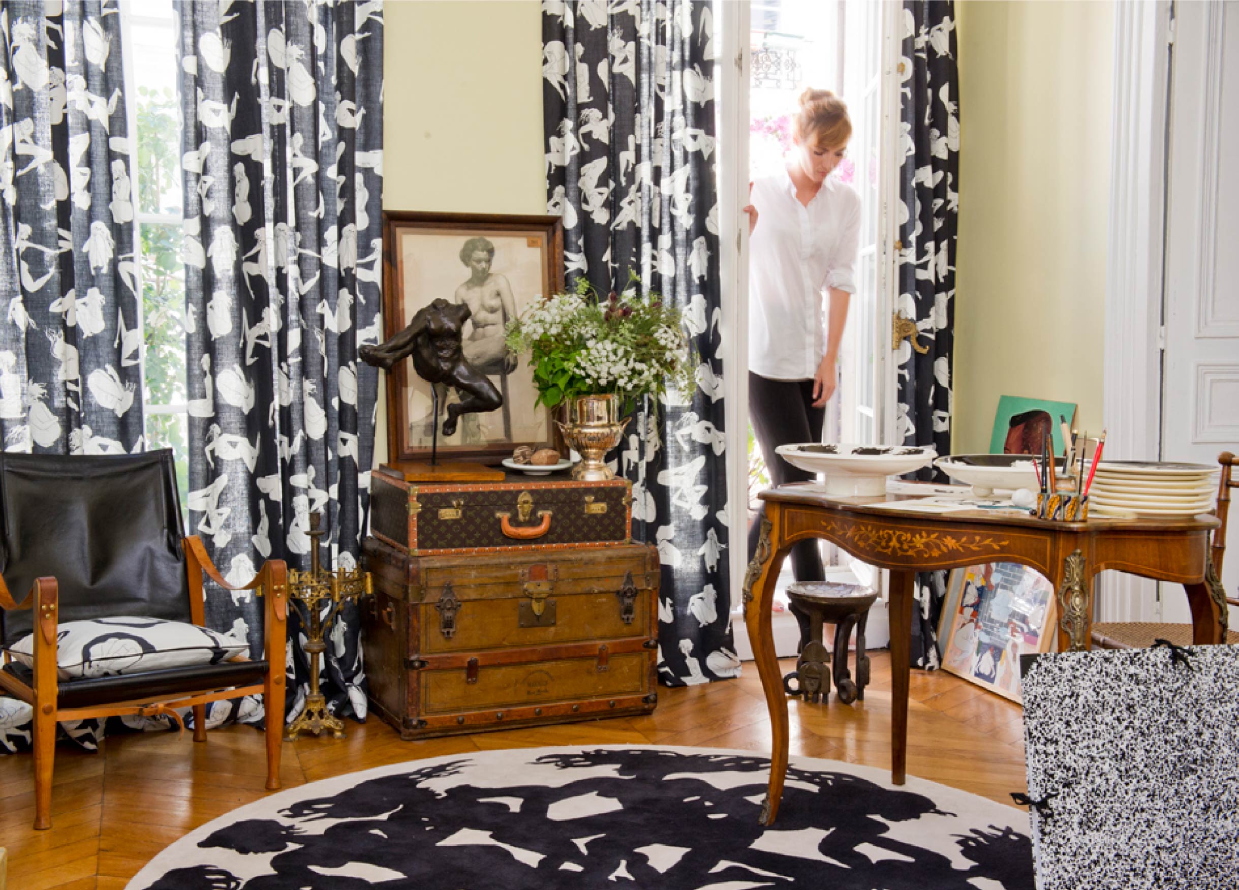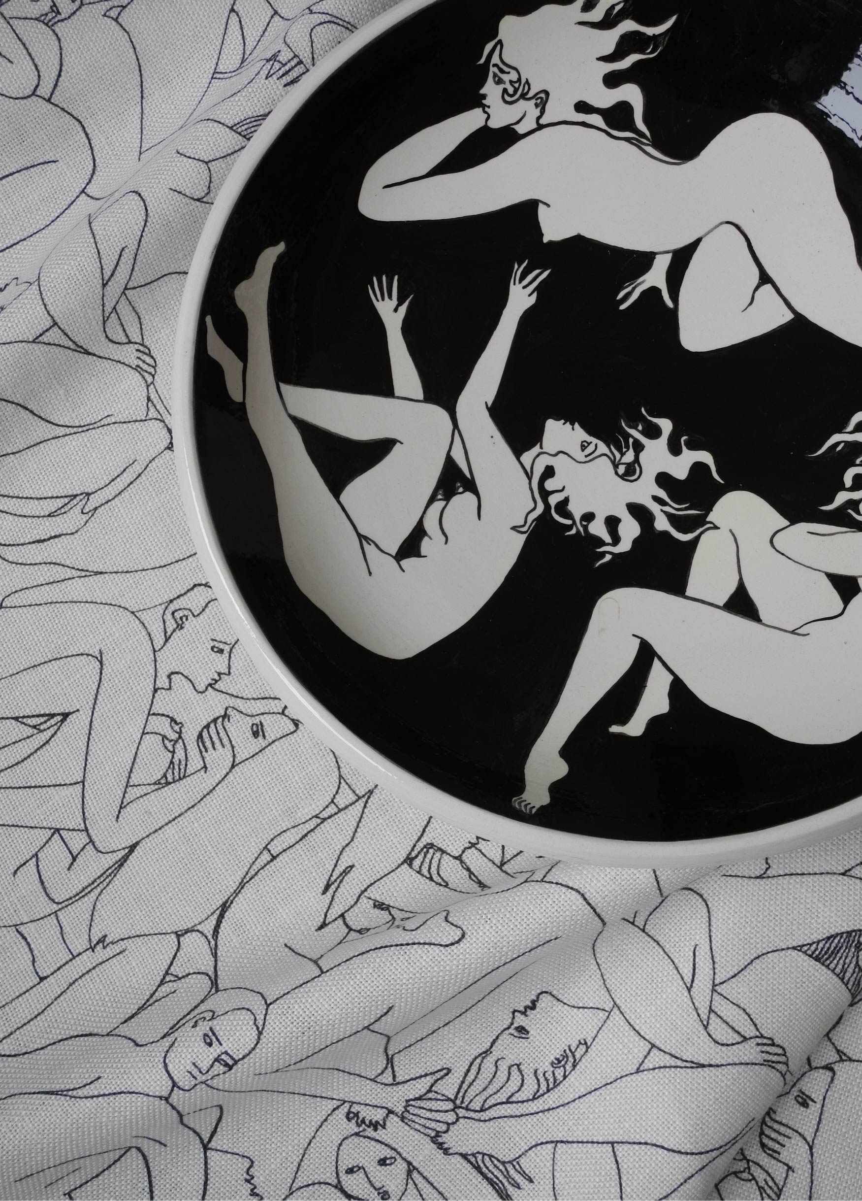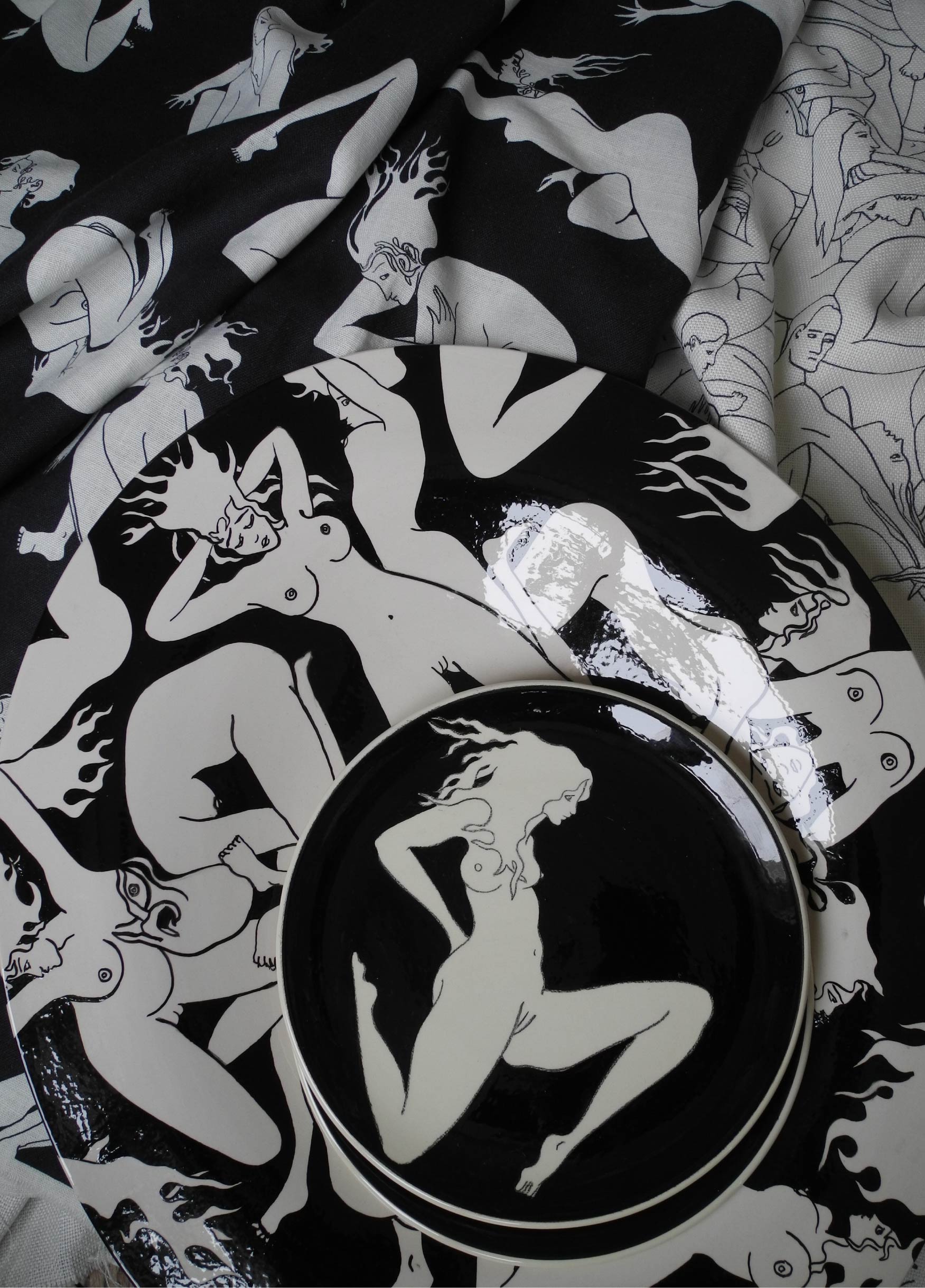 Cette collection, entièrement noire et blanche est composée de trois imprimés sur lin, un imprimé sur voile de coton, un papier peint, trois tapis ainsi que des assiettes et plats en céramique en série limitée à 8 exemplaires par modèle.