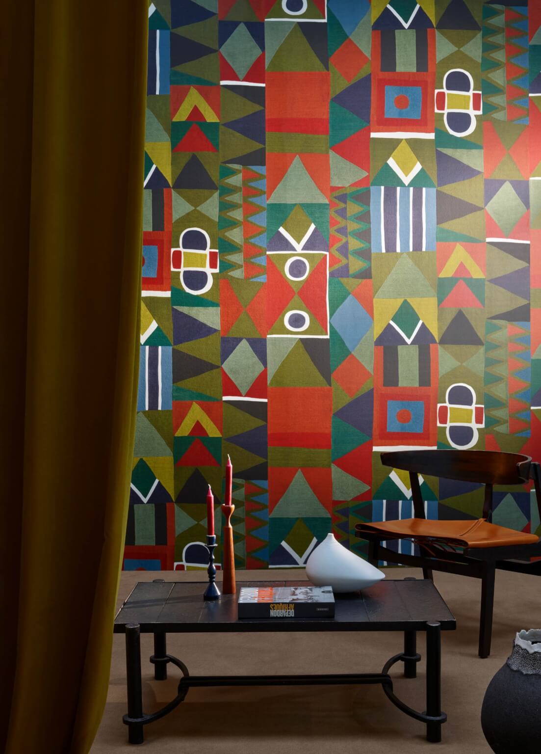 La collection RITUEL a pour point de départ l’Afrique du Sud. Dans le bush, le peuple N’débélé a développé un art non figuratif basé sur des motifs géométriques colorés. Celui-ci s’exprime sur les murs extérieurs des maisons, délivrant ainsi un message fort et puissant qui contraste fortement dans le paysage. Cet art graphique, vecteur principal de leur identité, est l’apanage des femmes. Séduite par cette double caractéristique, la Maison Pierre Frey souhaite écrire un langage pictural en adéquation avec nos modes de vie.