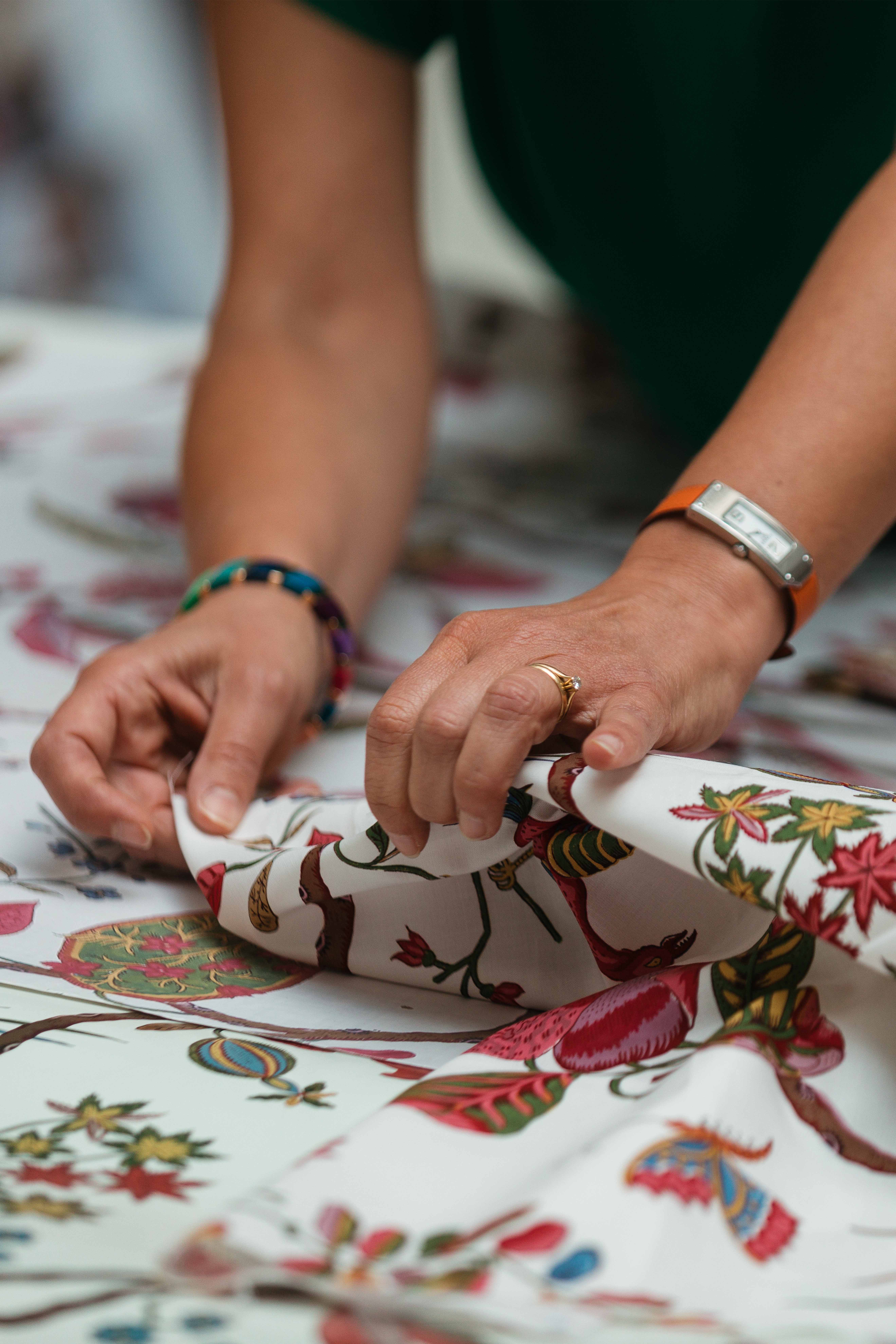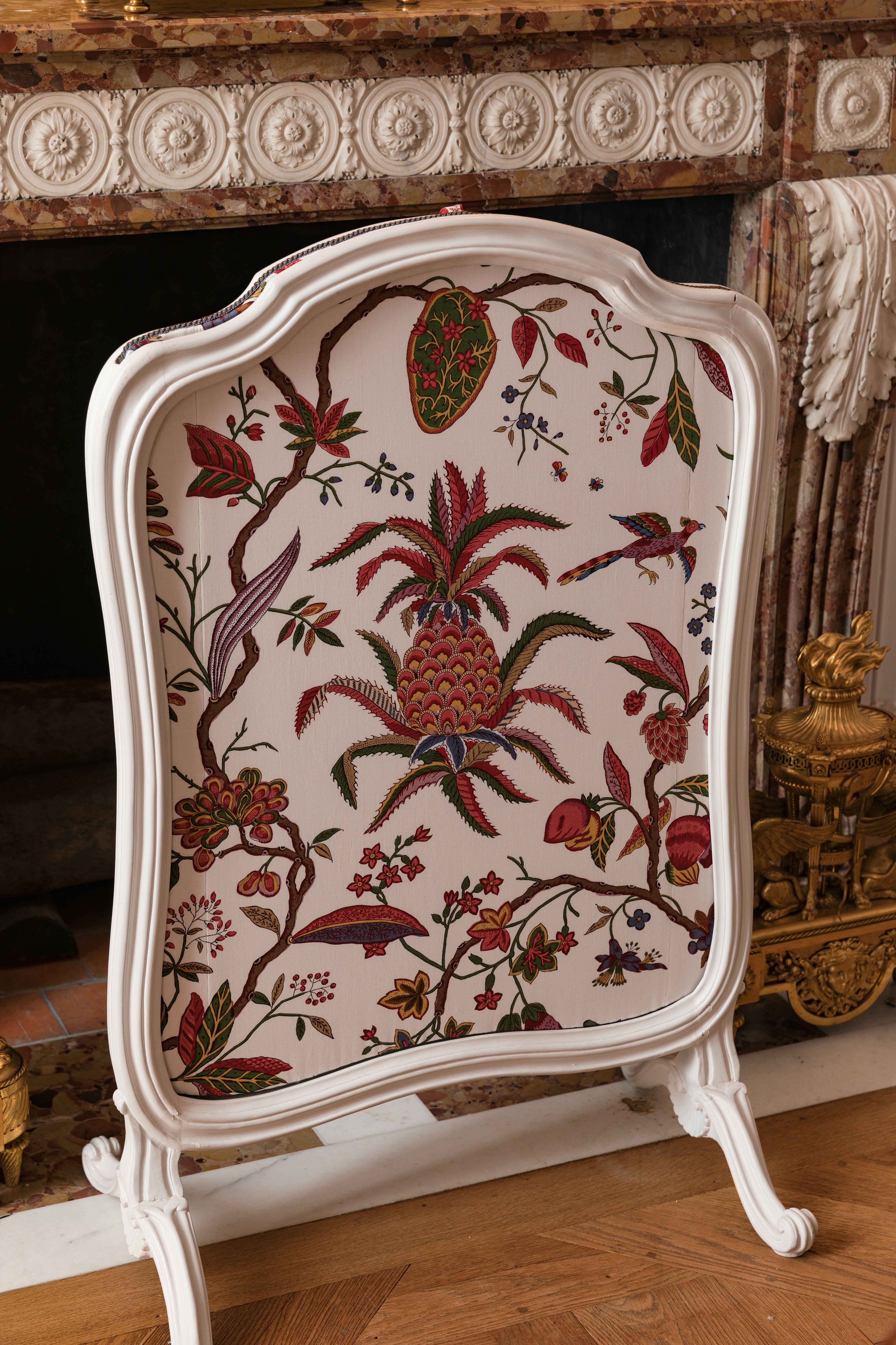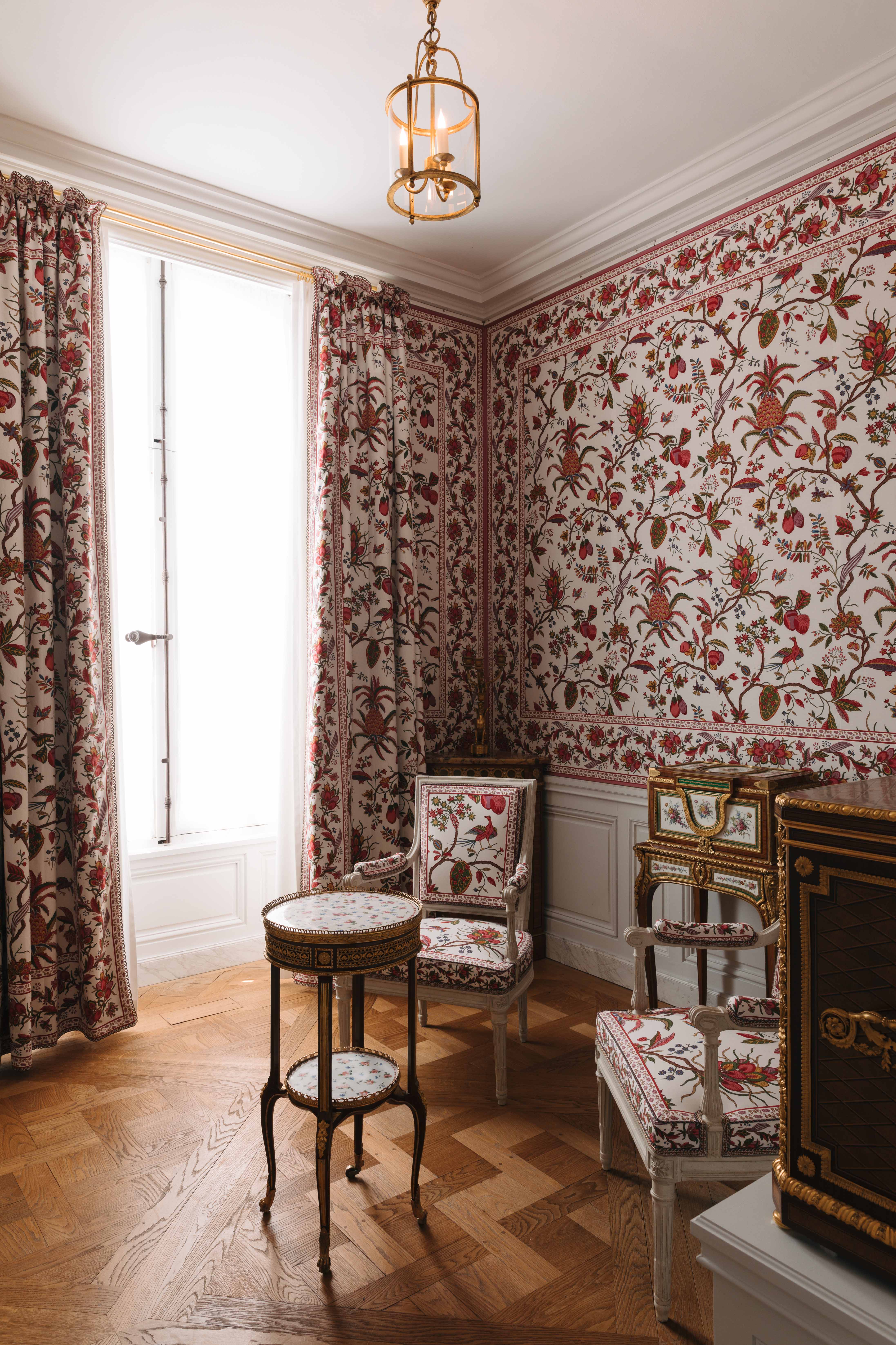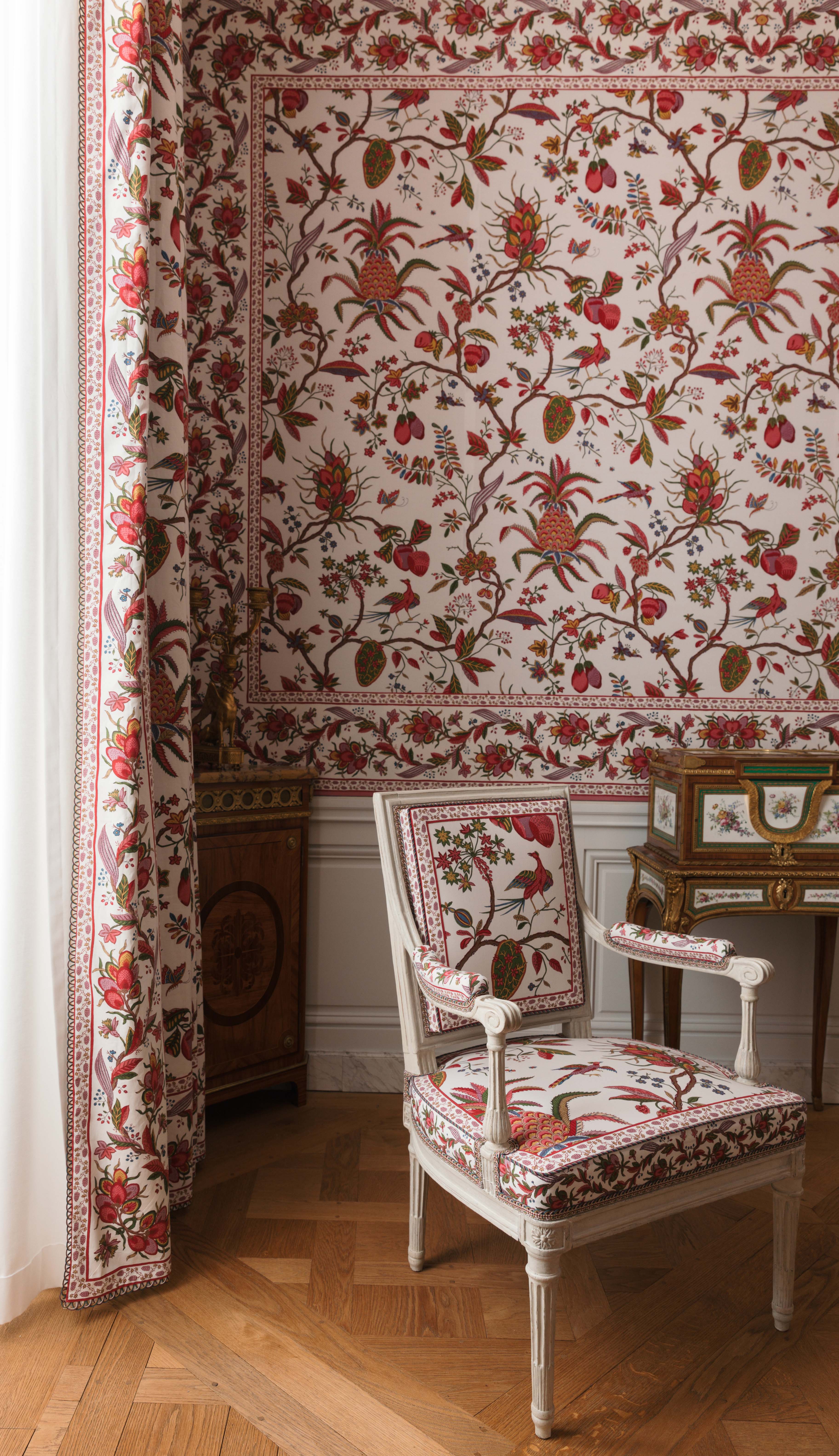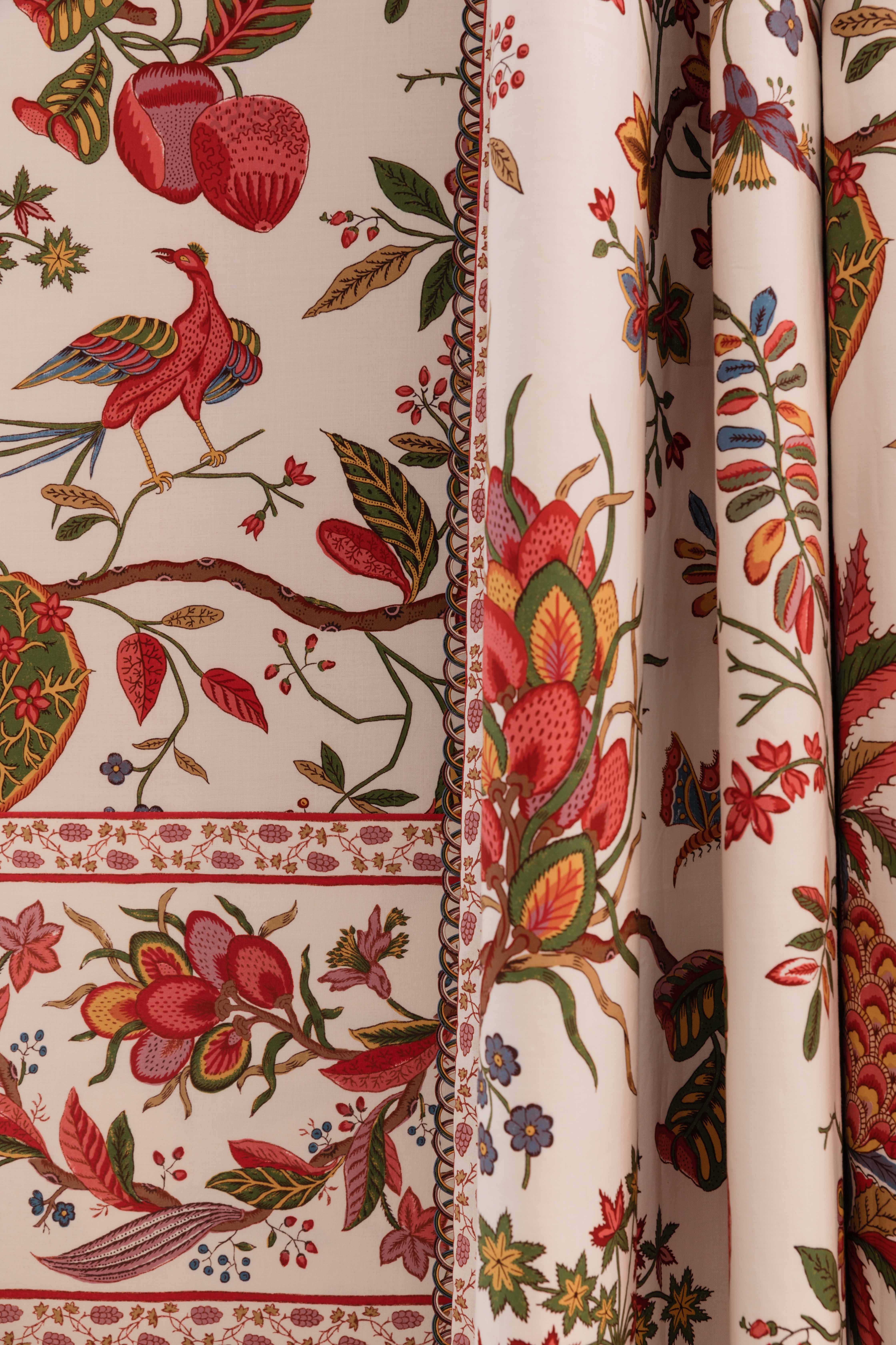 Le document original, créé en 1784, révèle 25 nuances de couleurs imprimées à la planche de bois et pinceautées. Véritable chef d’oeuvre de la Manufacture d’Oberkampf par la richesse de son dessin et sa réalisation, il a été entièrement redessiné à la main et imprimé de façon traditionnelle au cadre plat.