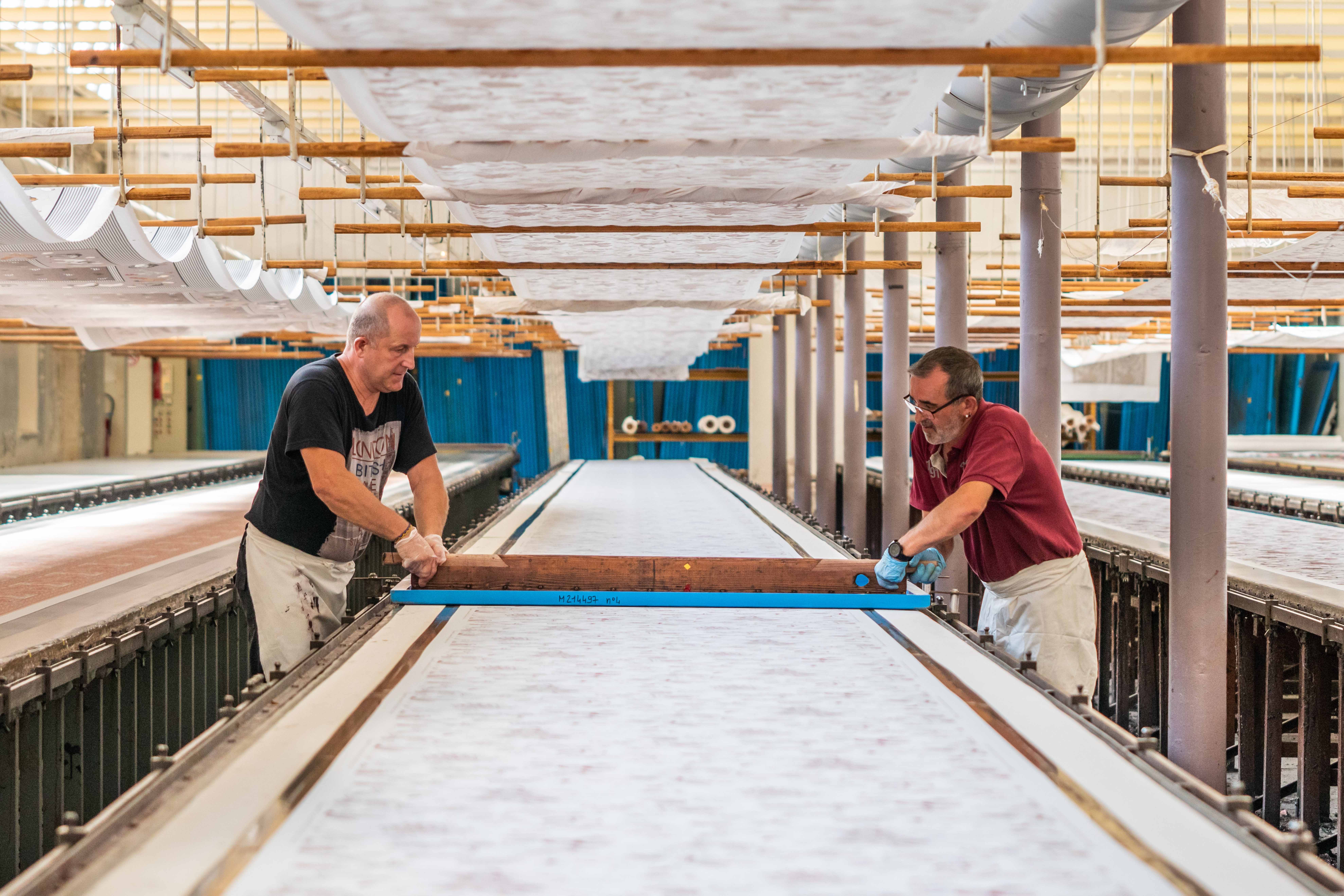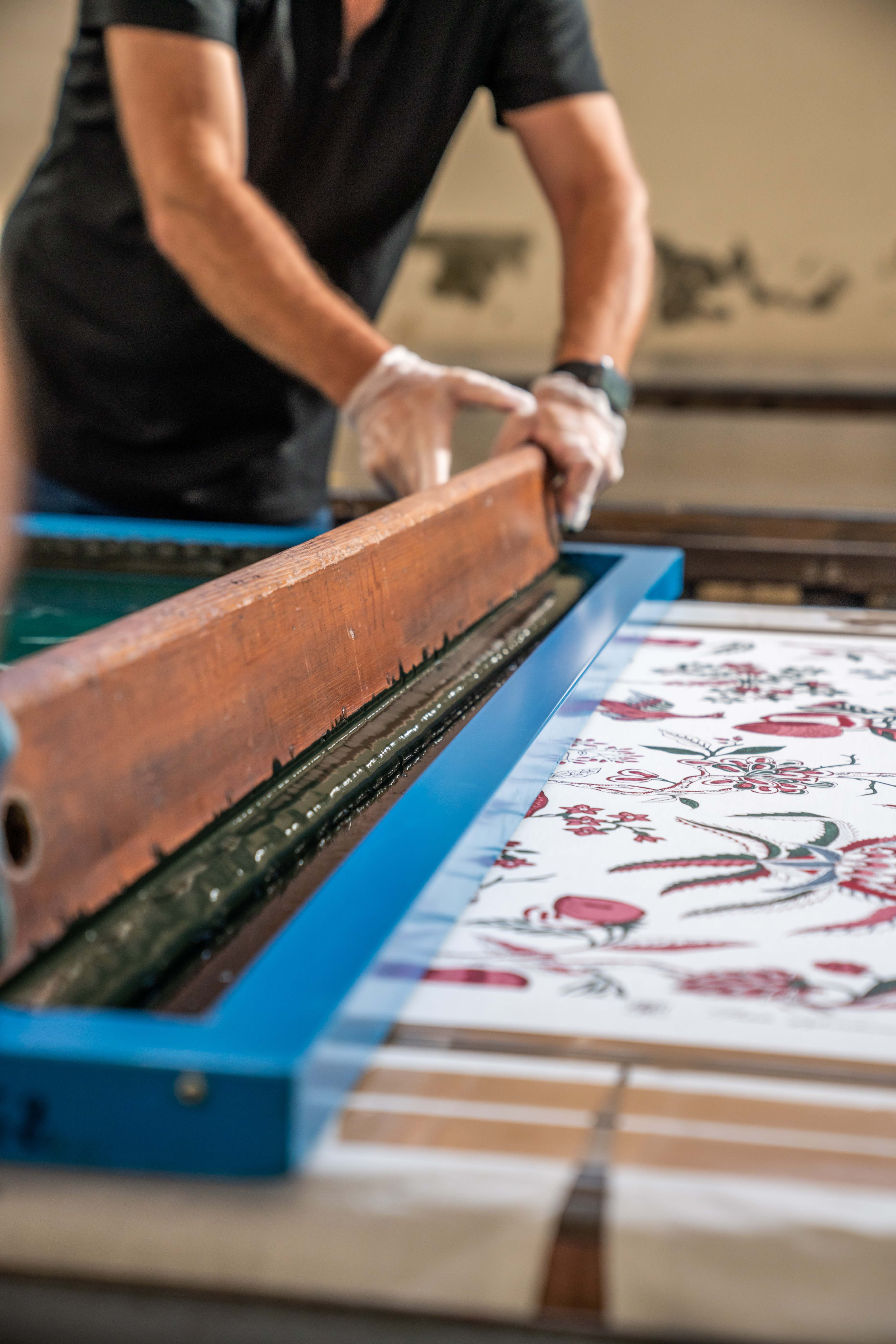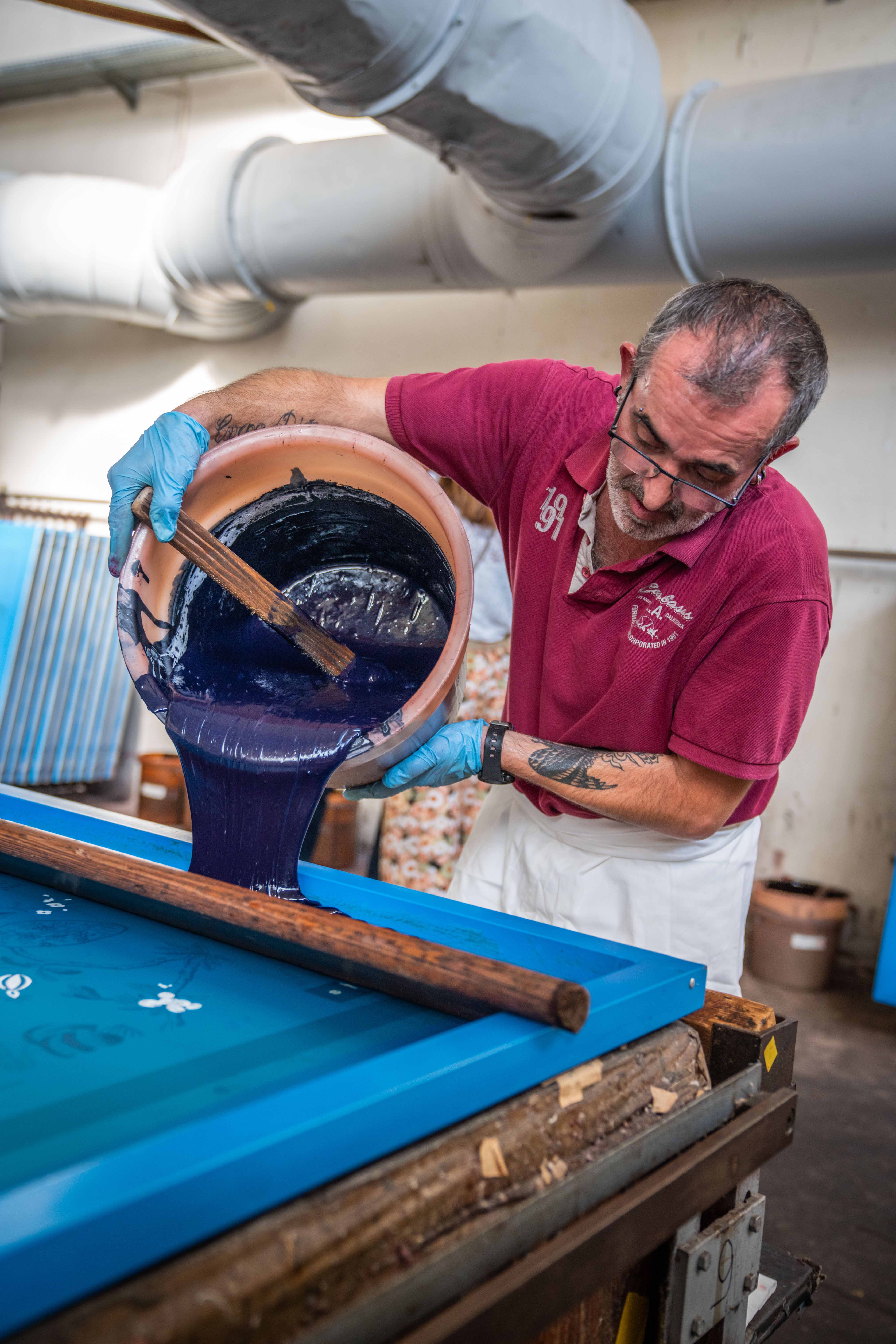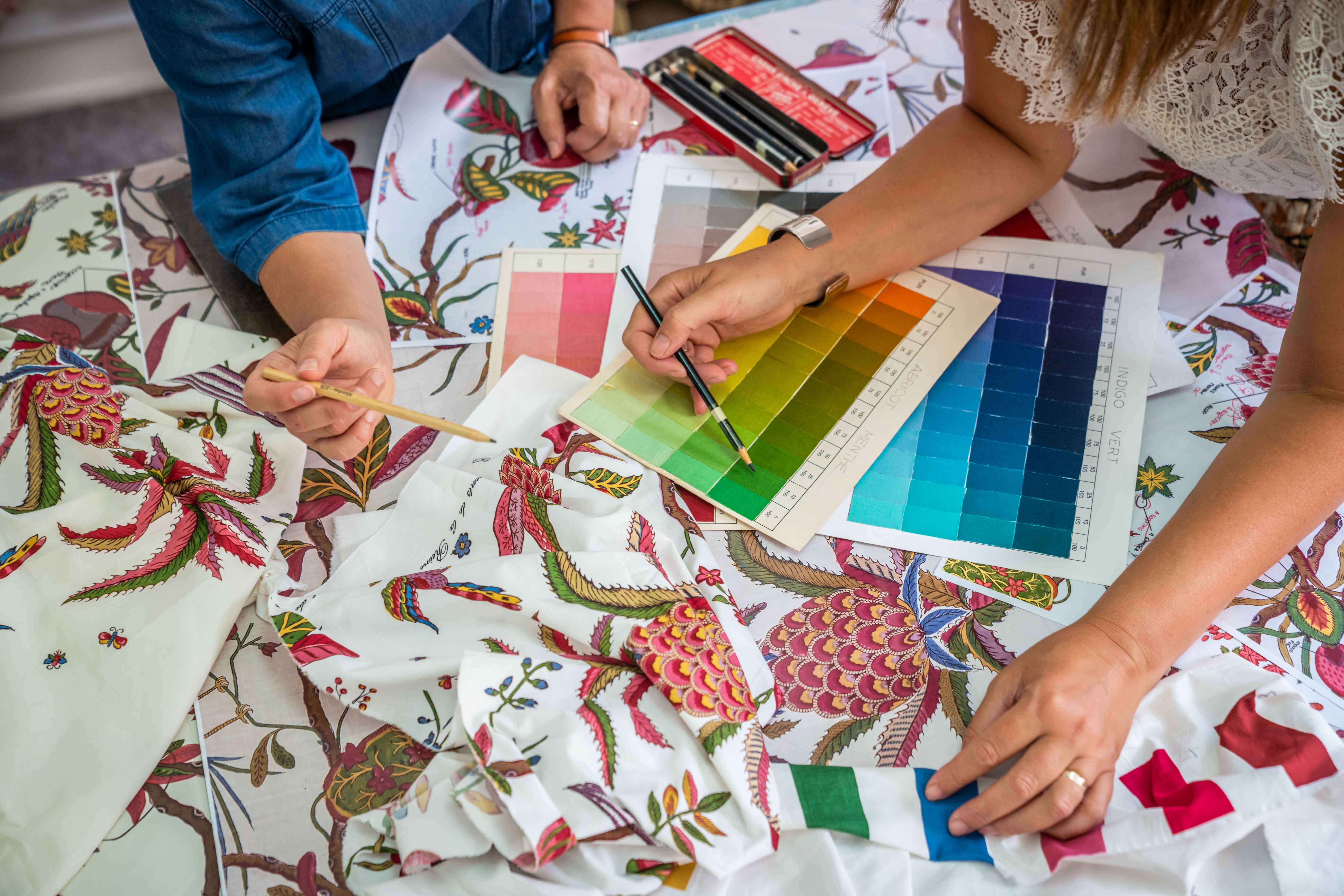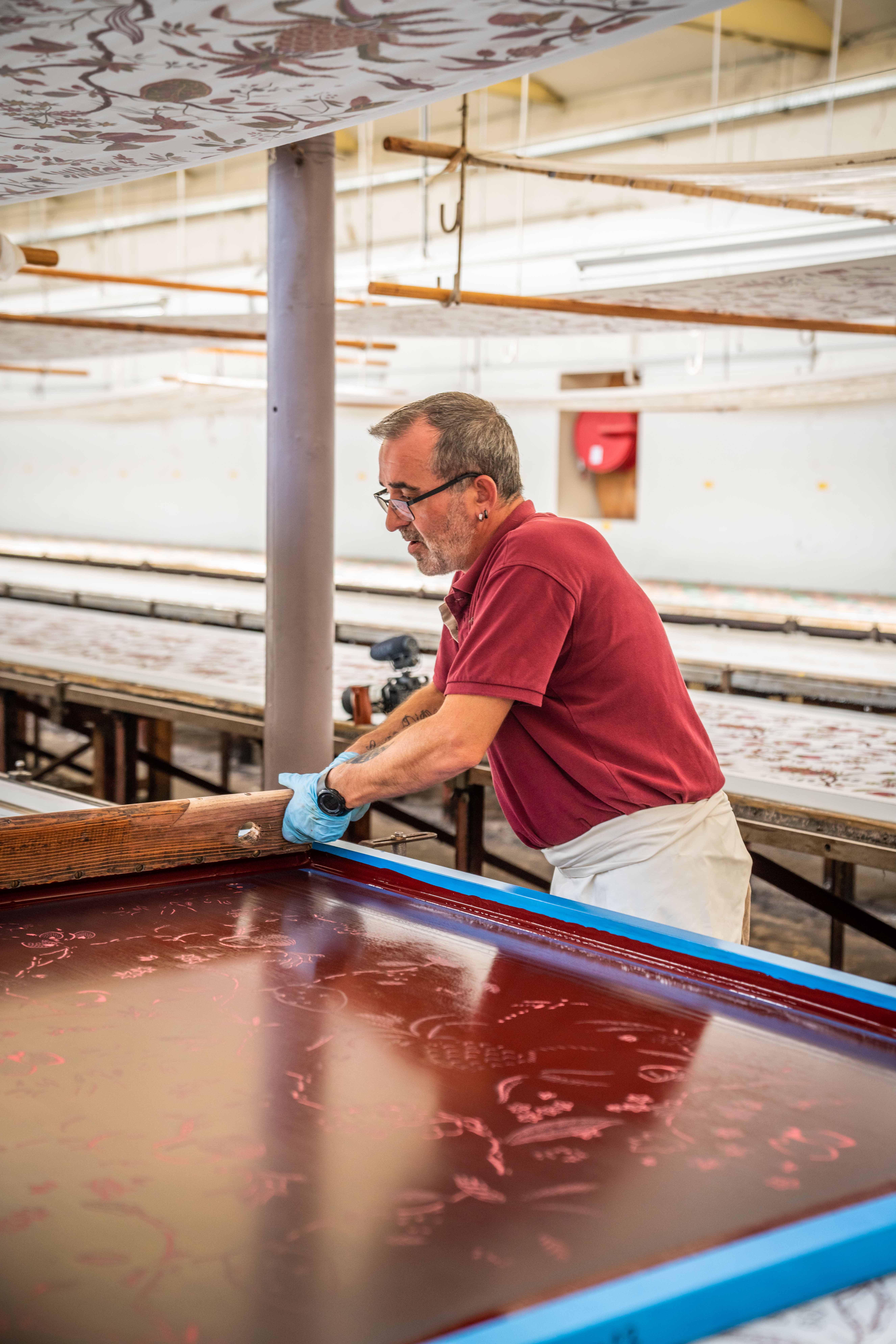 Le document original, créé en 1784, révèle 25 nuances de couleurs imprimées à la planche de bois et pinceautées. Véritable chef d’oeuvre de la Manufacture d’Oberkampf par la richesse de son dessin et sa réalisation, il a été entièrement redessiné à la main et imprimé de façon traditionnelle au cadre plat.
