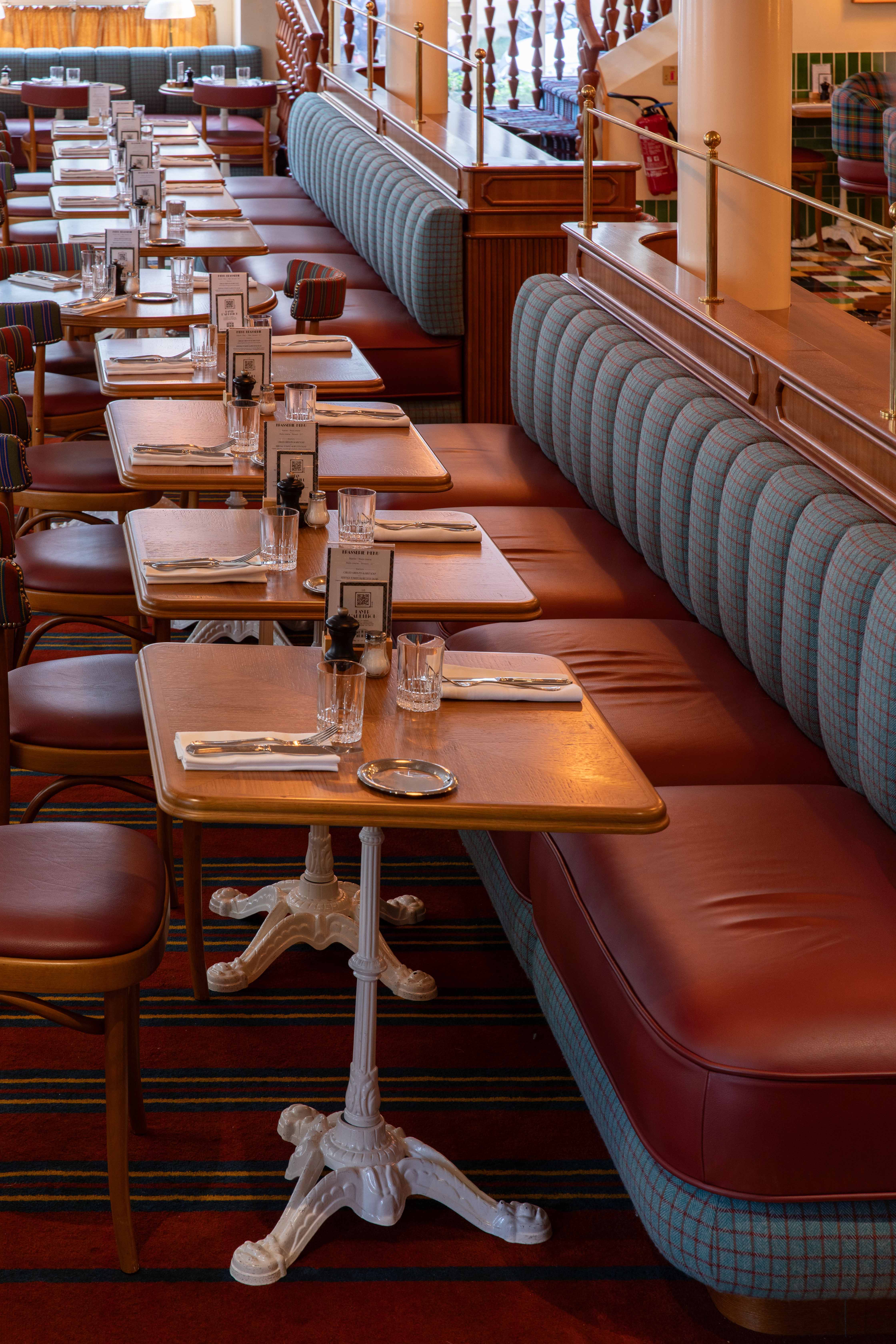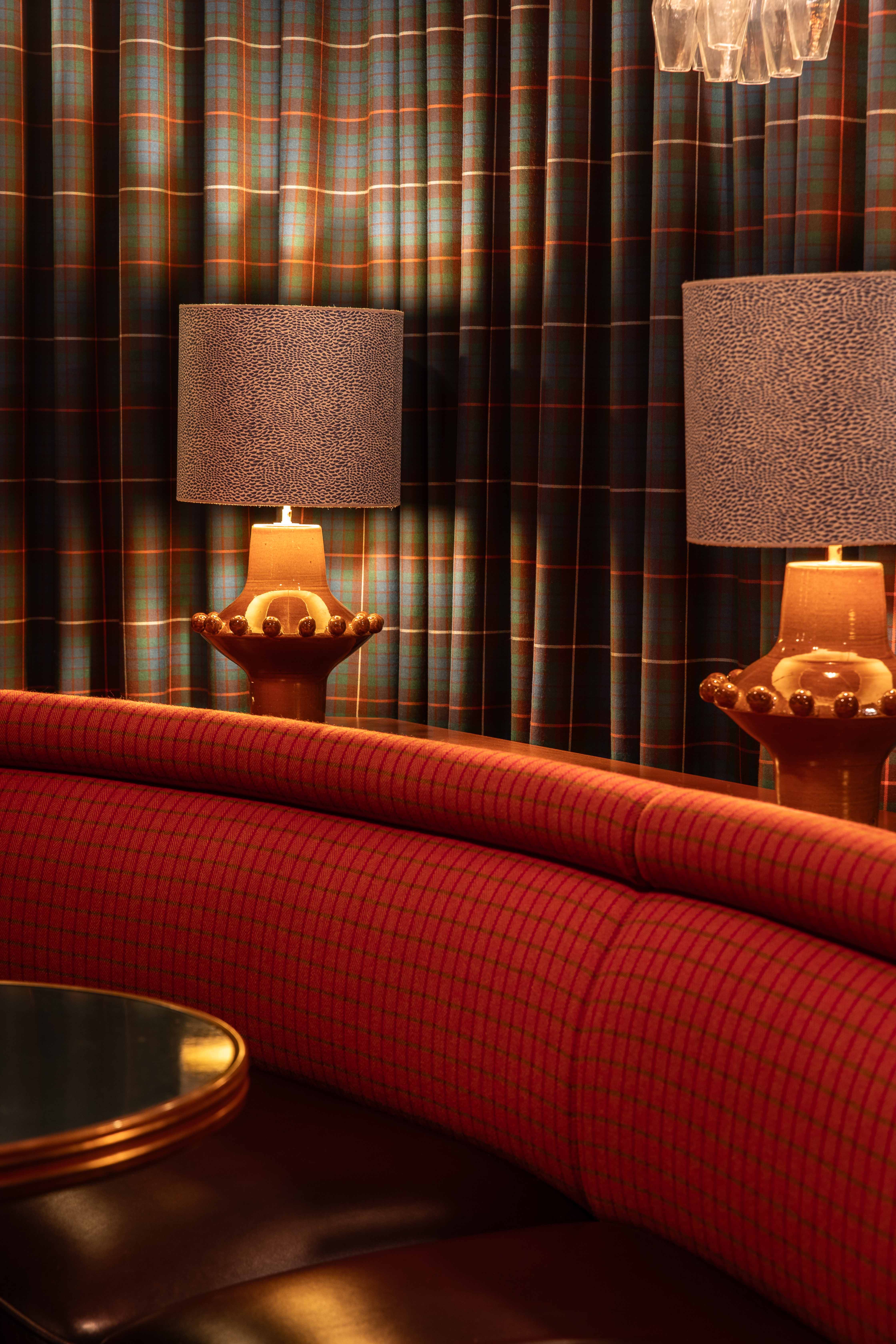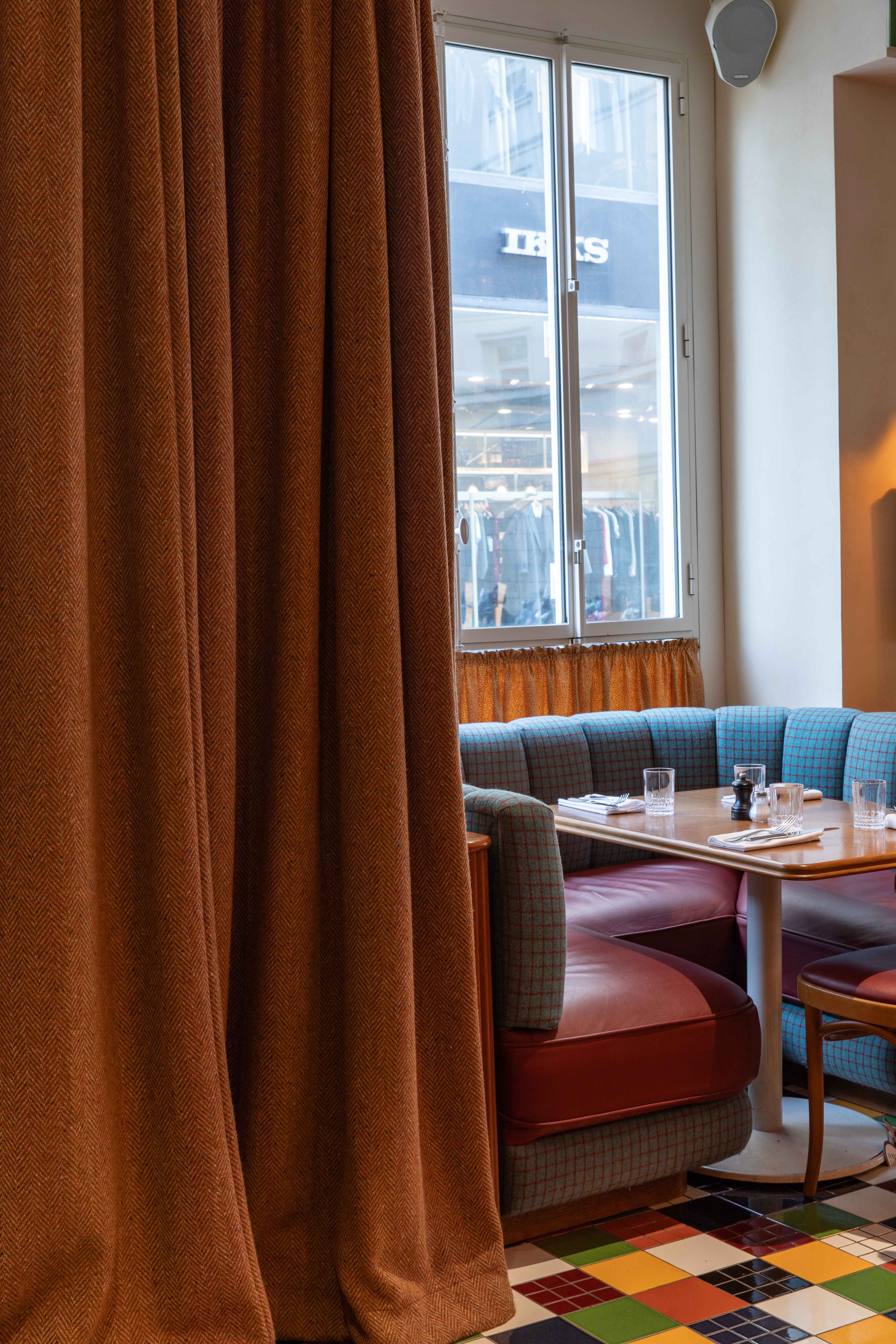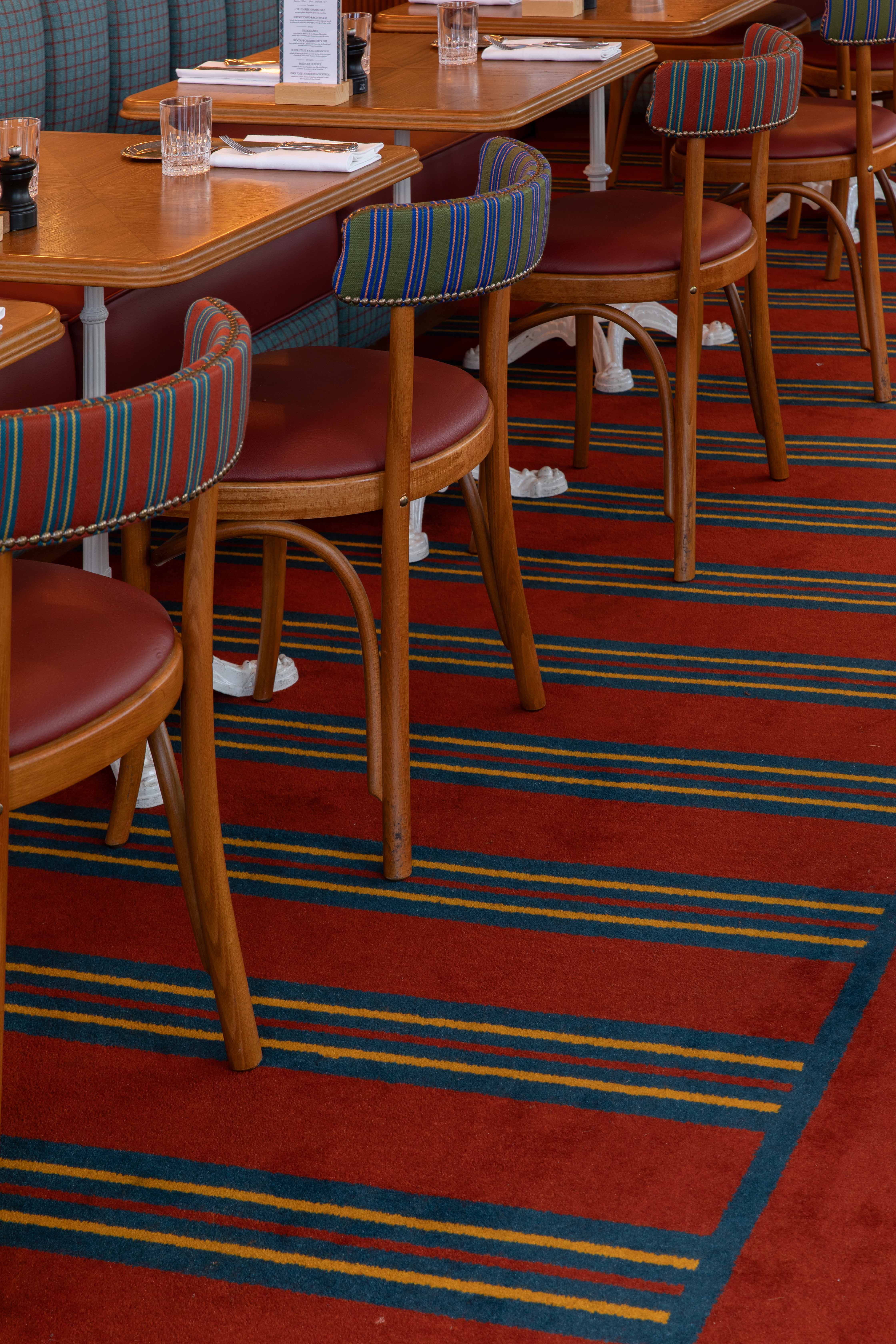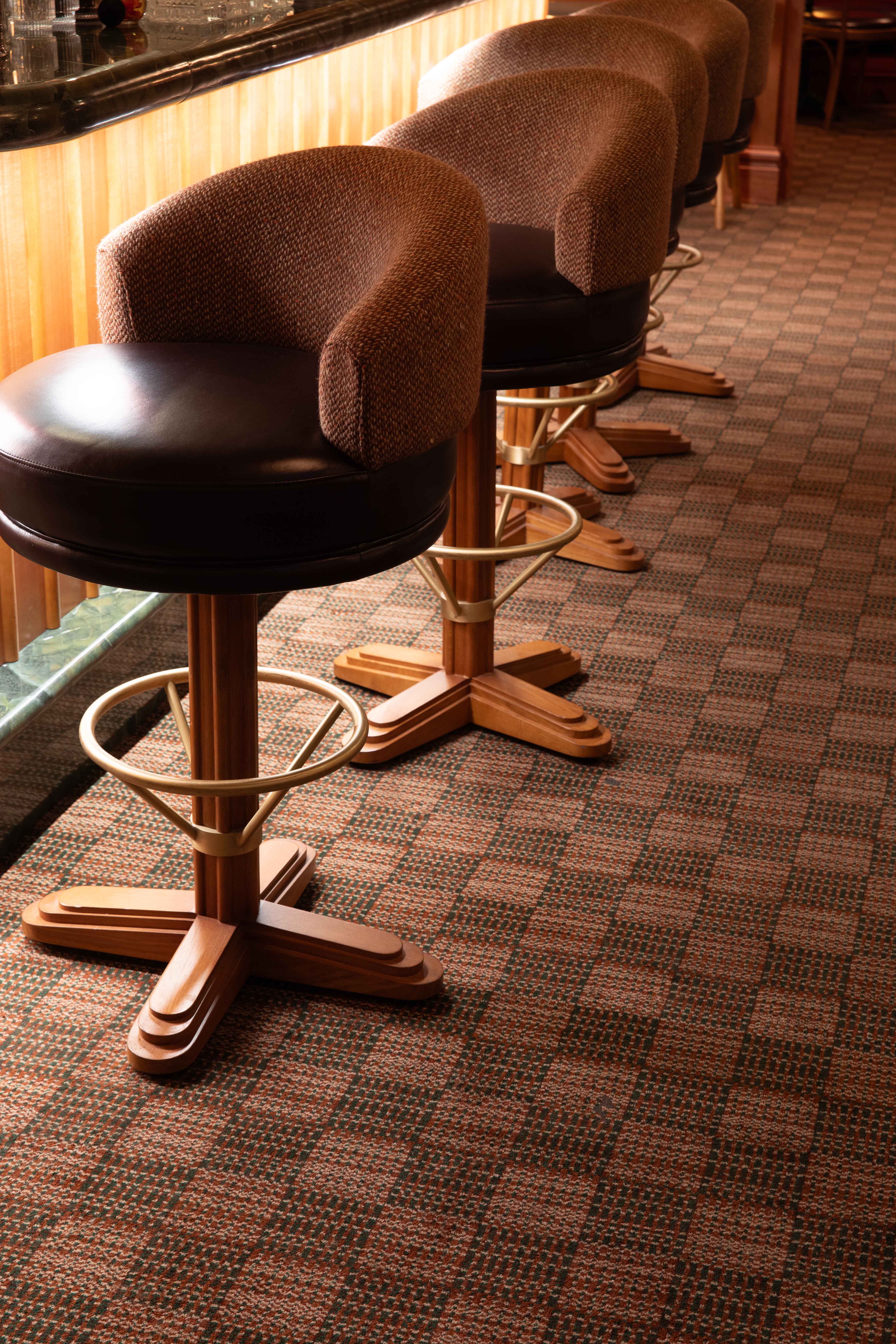 Au rez-de chaussée, les banquettes du restaurant sont habillées de la collection SEQUANA principalement composée de tissus en laine tissée dans le comté de Donegal, en Irlande. Cette collection s’intègre parfaitement dans ce projet à la fois grâce à ses caractéristiques techniques adaptées aux établissements à forte fréquentation, car la laine offre une grande résistance idéale pour les assises, mais aussi grâce à ses motifs tels que les rayures ou le tartan aux couleurs audacieuses. On retrouve le carreau signature GRETA et ses élégants chevrons. Les tabourets de bar sont quant à eux recouverts du motif Prince de Galles TERENCE en pure laine vierge avec un esprit « tartan ».