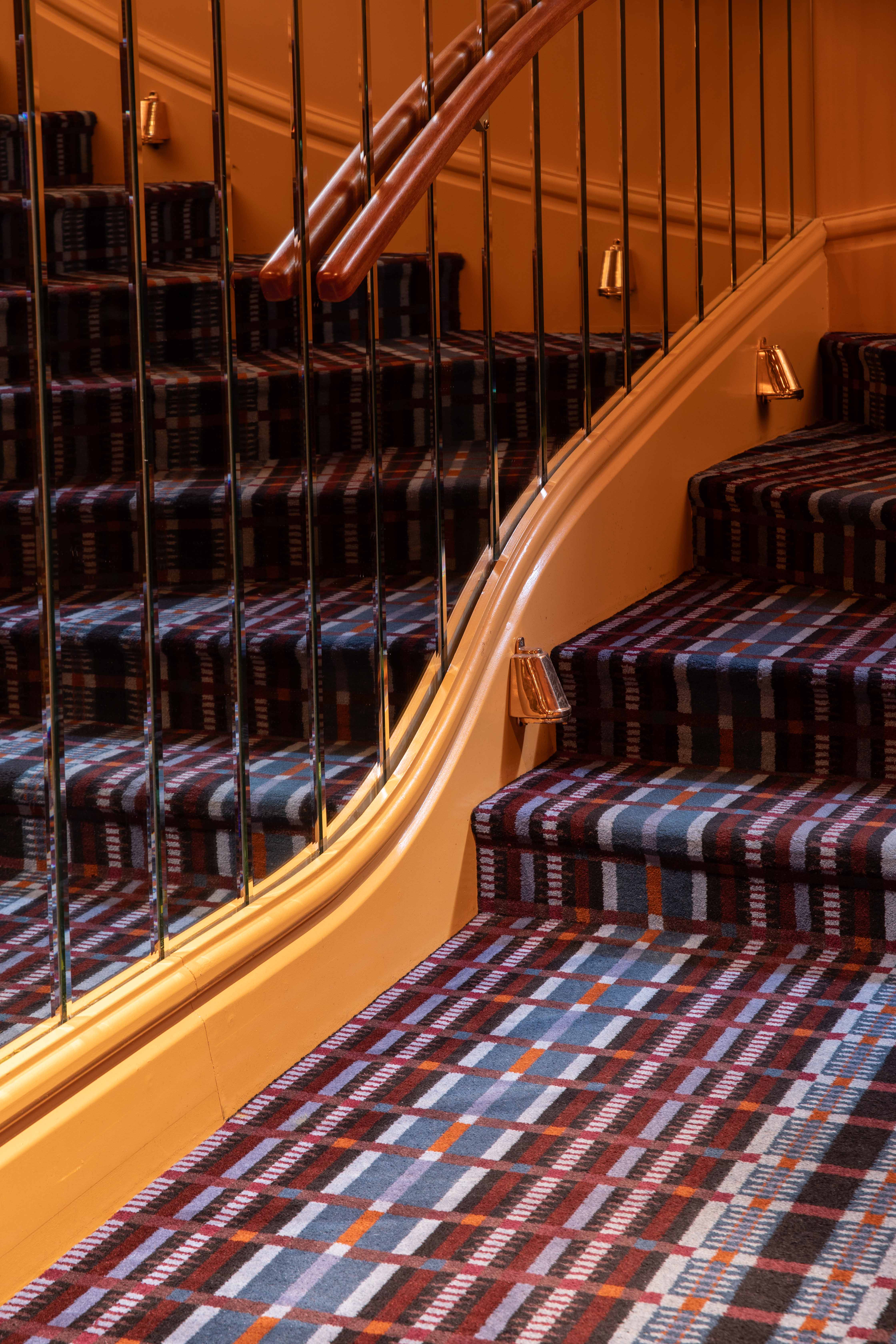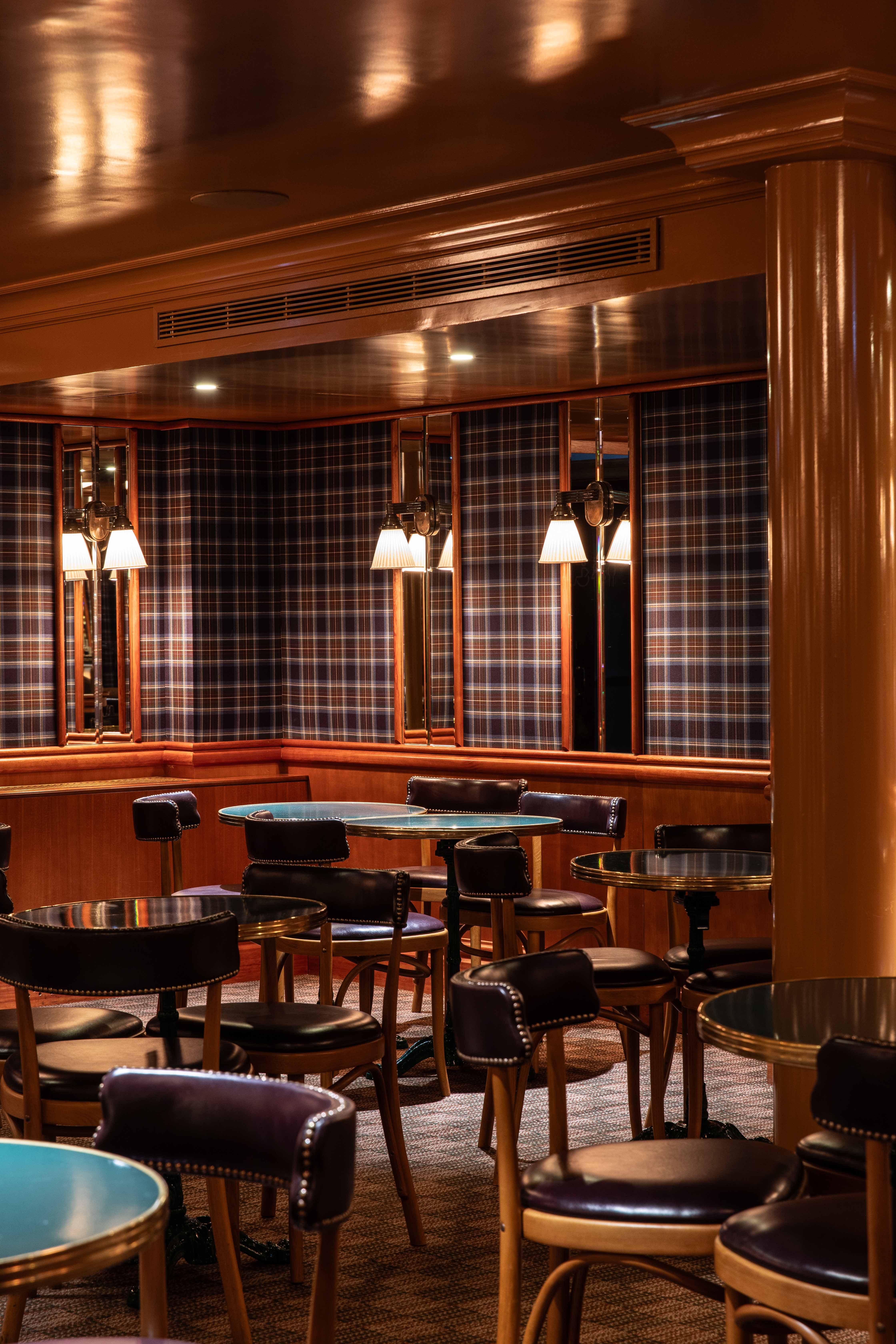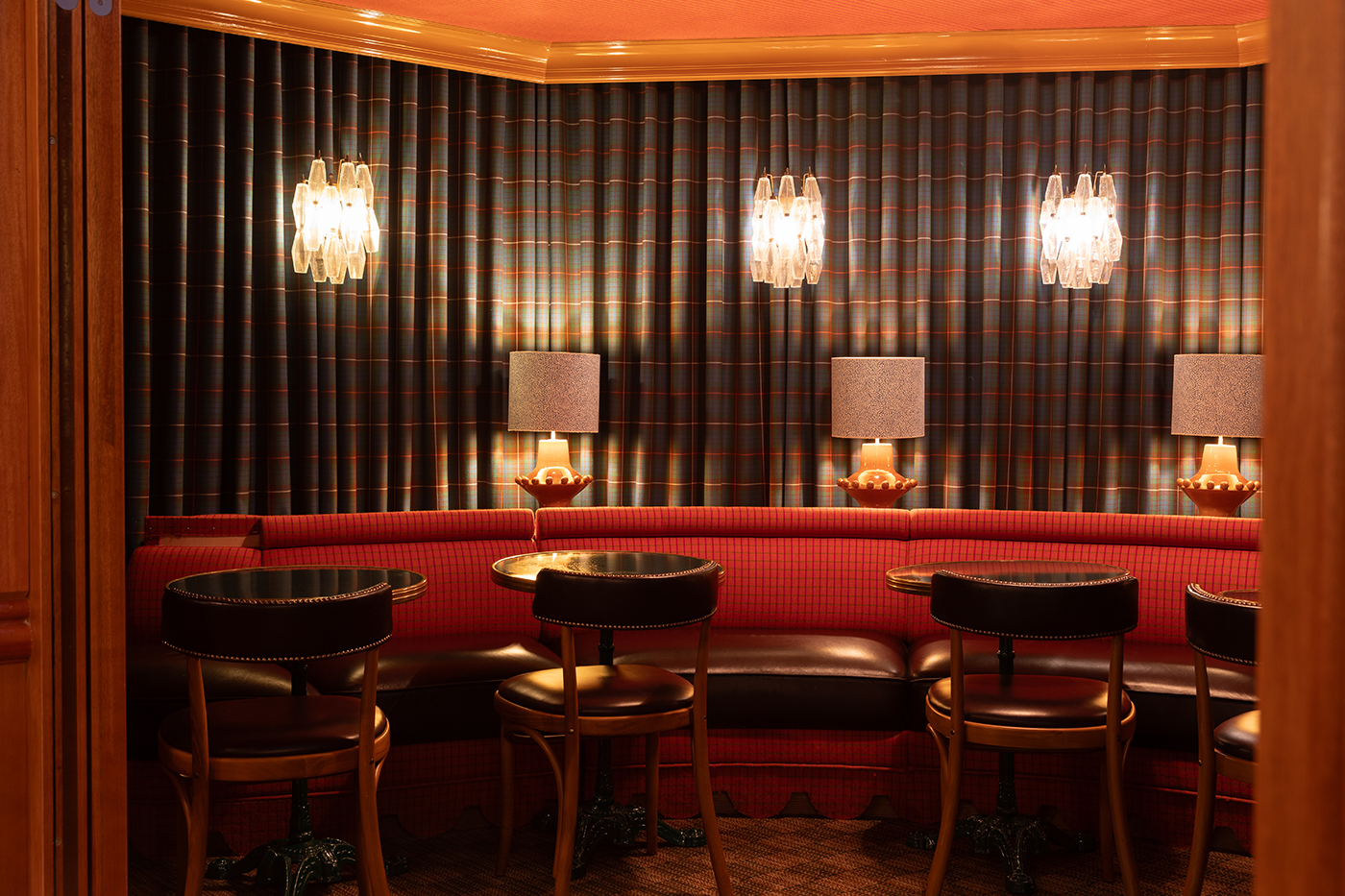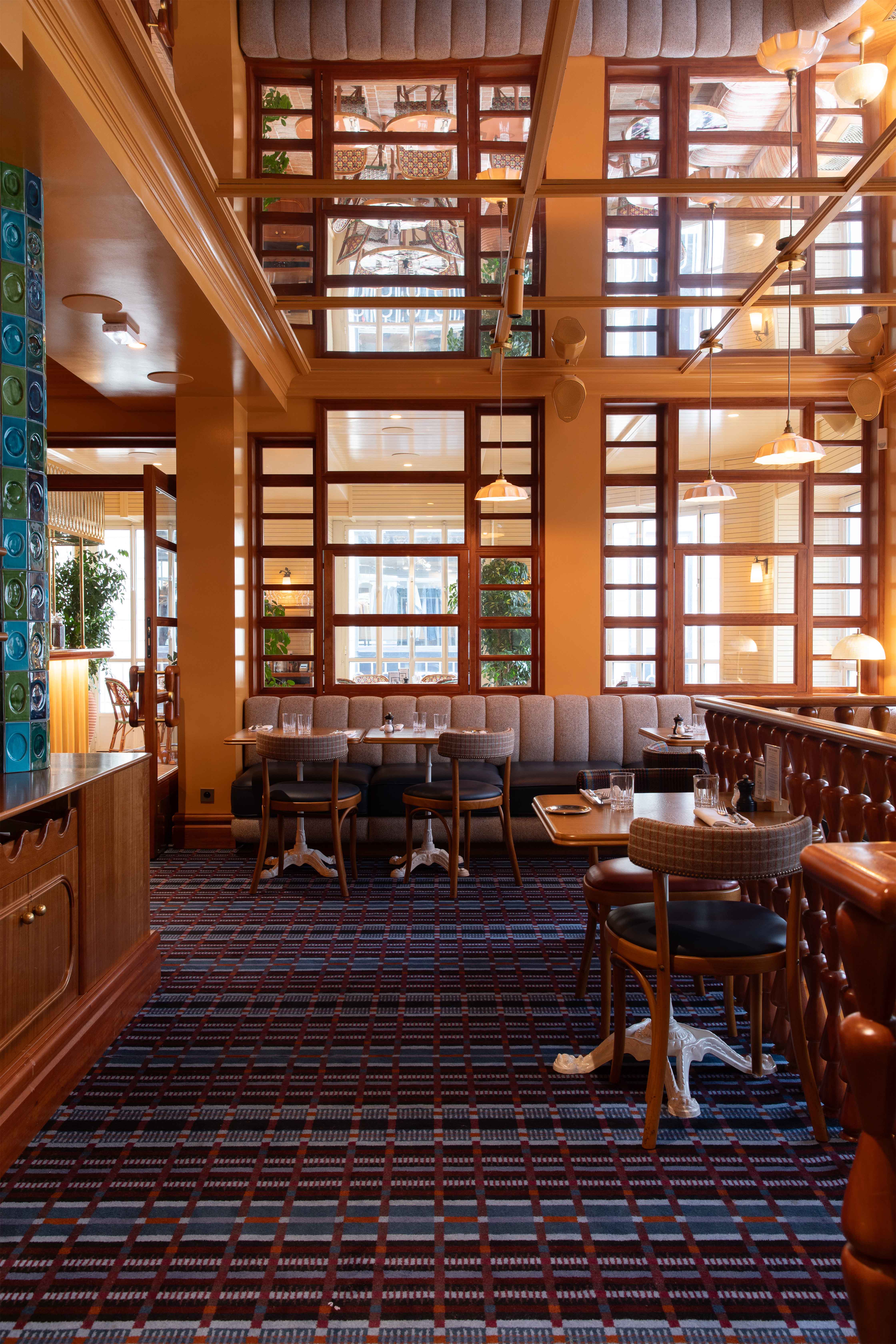 Au rez-de chaussée, les banquettes du restaurant sont habillées de la collection SEQUANA principalement composée de tissus en laine tissée dans le comté de Donegal, en Irlande. Cette collection s’intègre parfaitement dans ce projet à la fois grâce à ses caractéristiques techniques adaptées aux établissements à forte fréquentation, car la laine offre une grande résistance idéale pour les assises, mais aussi grâce à ses motifs tels que les rayures ou le tartan aux couleurs audacieuses. On retrouve le carreau signature GRETA et ses élégants chevrons. Les tabourets de bar sont quant à eux recouverts du motif Prince de Galles TERENCE en pure laine vierge avec un esprit « tartan ».