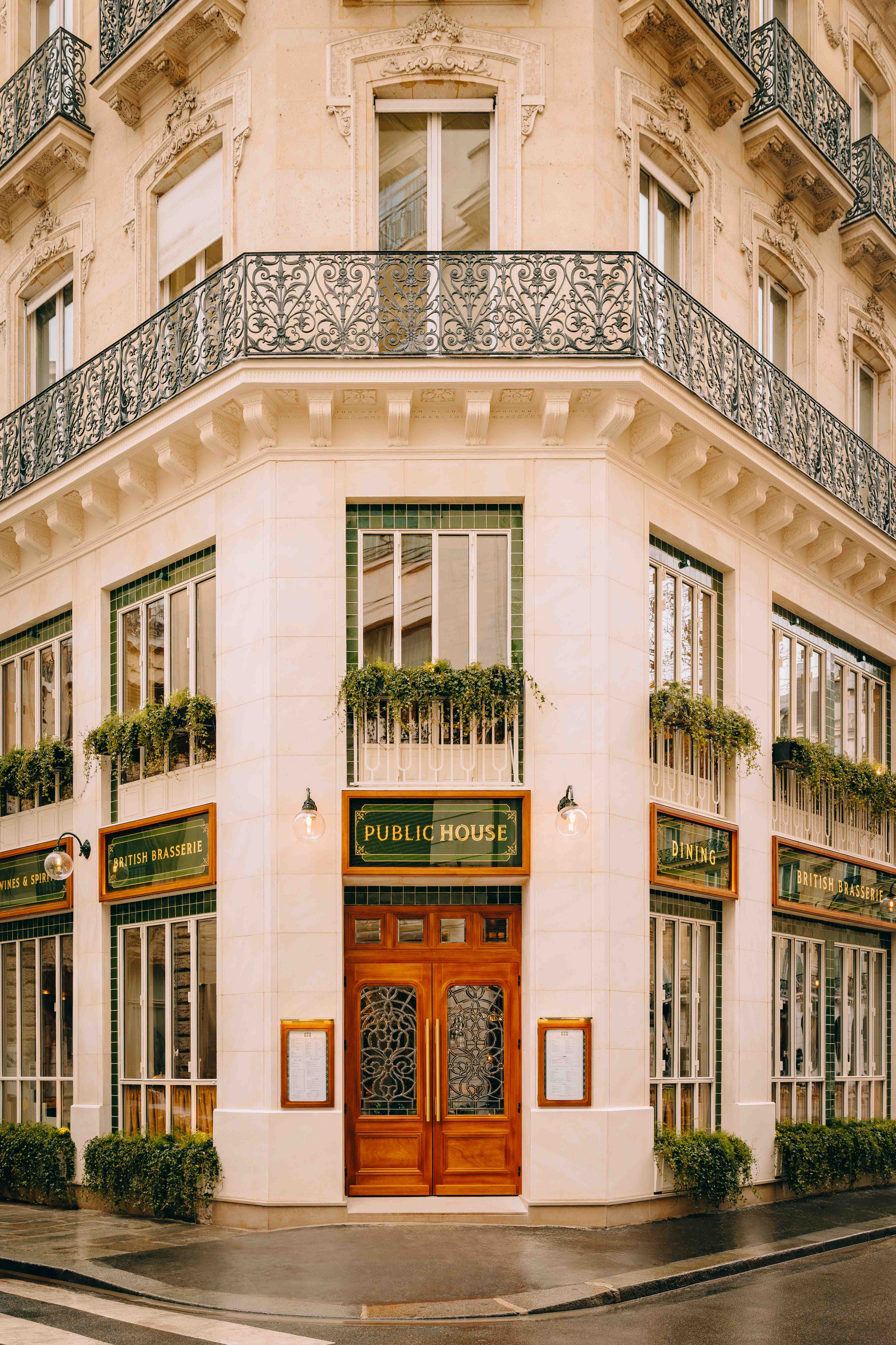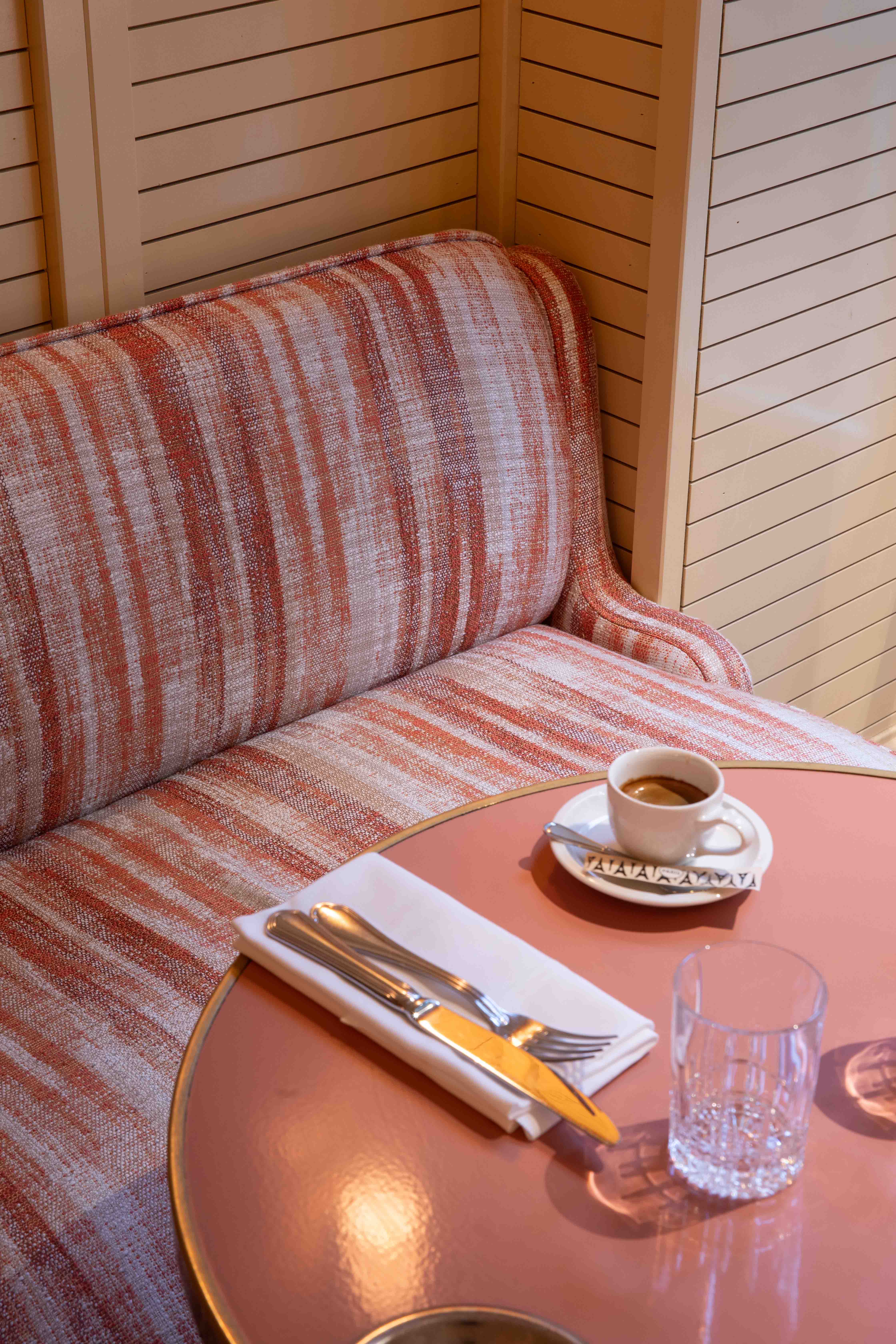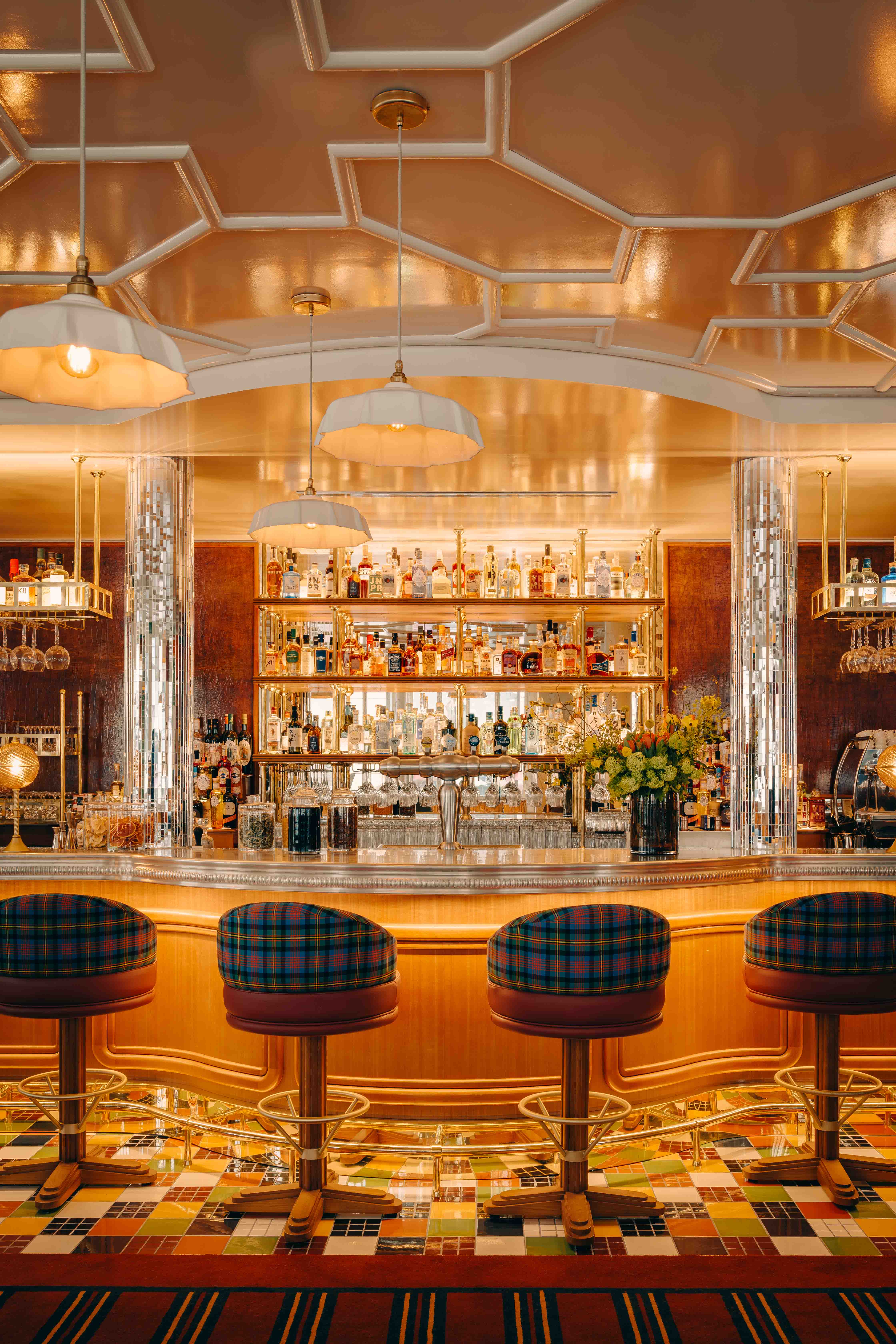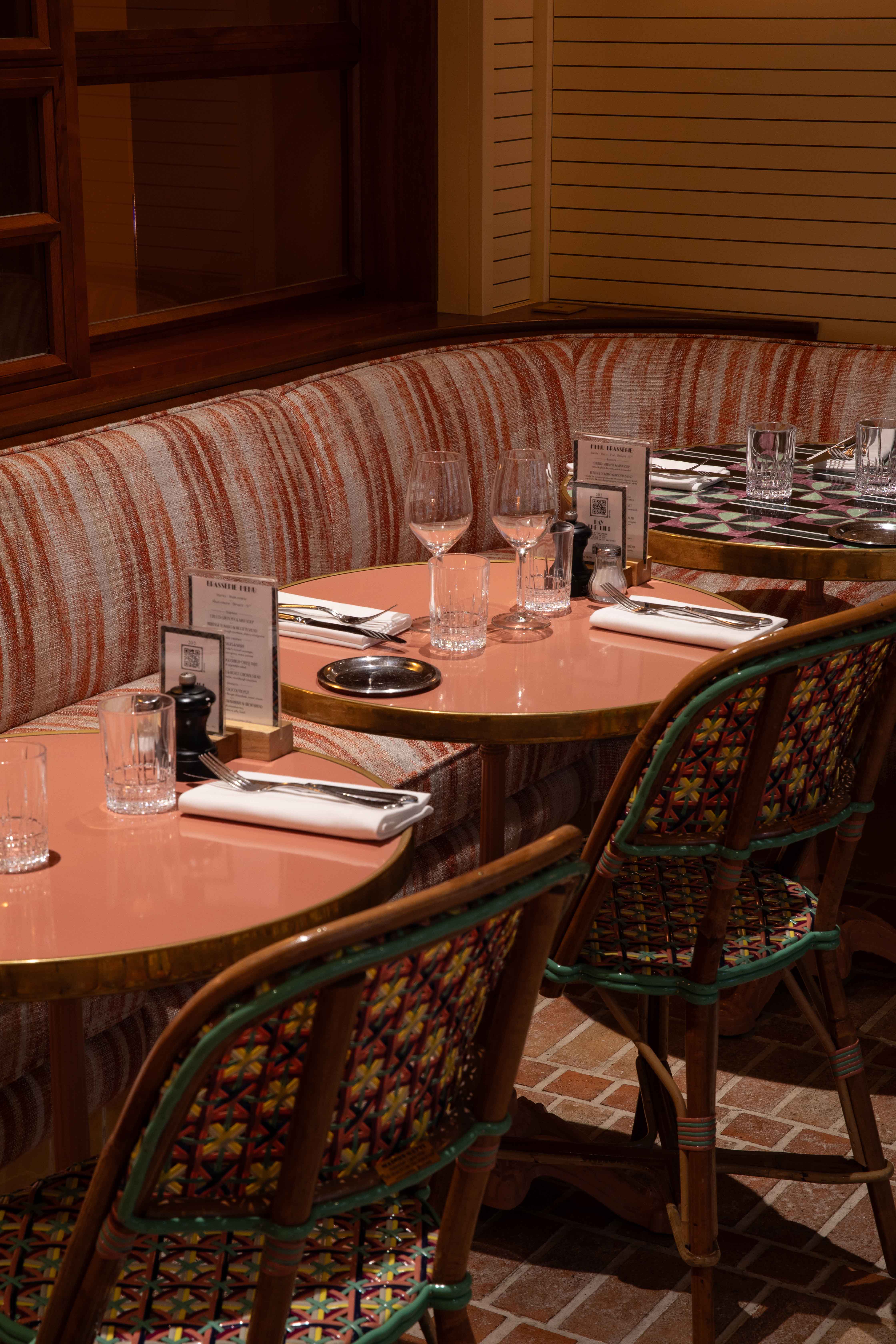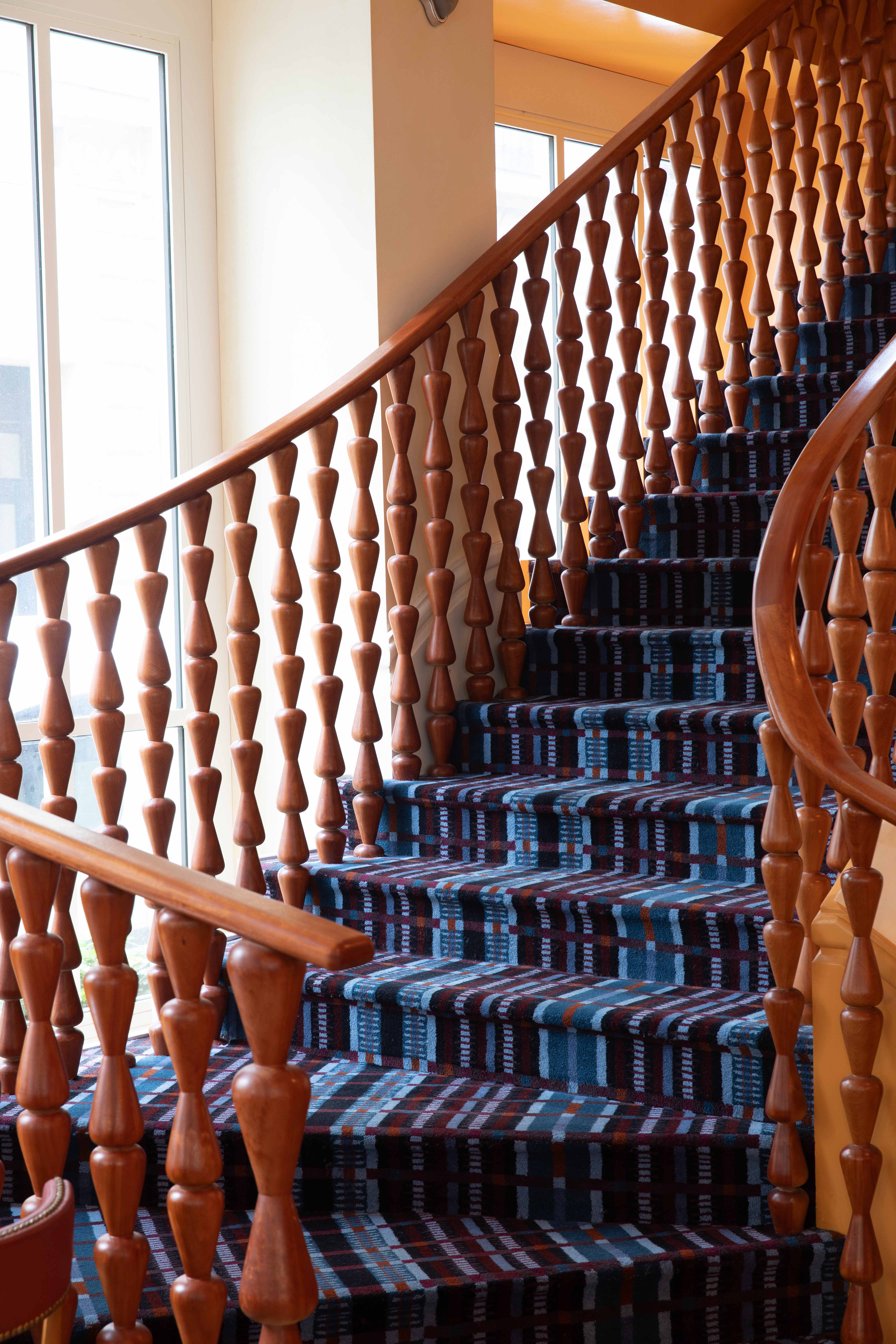 Au rez-de chaussée, les banquettes du restaurant sont habillées de la collection SEQUANA principalement composée de tissus en laine tissée dans le comté de Donegal, en Irlande. Cette collection s’intègre parfaitement dans ce projet à la fois grâce à ses caractéristiques techniques adaptées aux établissements à forte fréquentation, car la laine offre une grande résistance idéale pour les assises, mais aussi grâce à ses motifs tels que les rayures ou le tartan aux couleurs audacieuses. On retrouve le carreau signature GRETA et ses élégants chevrons. Les tabourets de bar sont quant à eux recouverts du motif Prince de Galles TERENCE en pure laine vierge avec un esprit « tartan ».