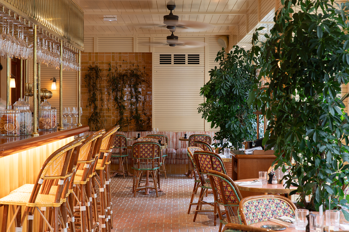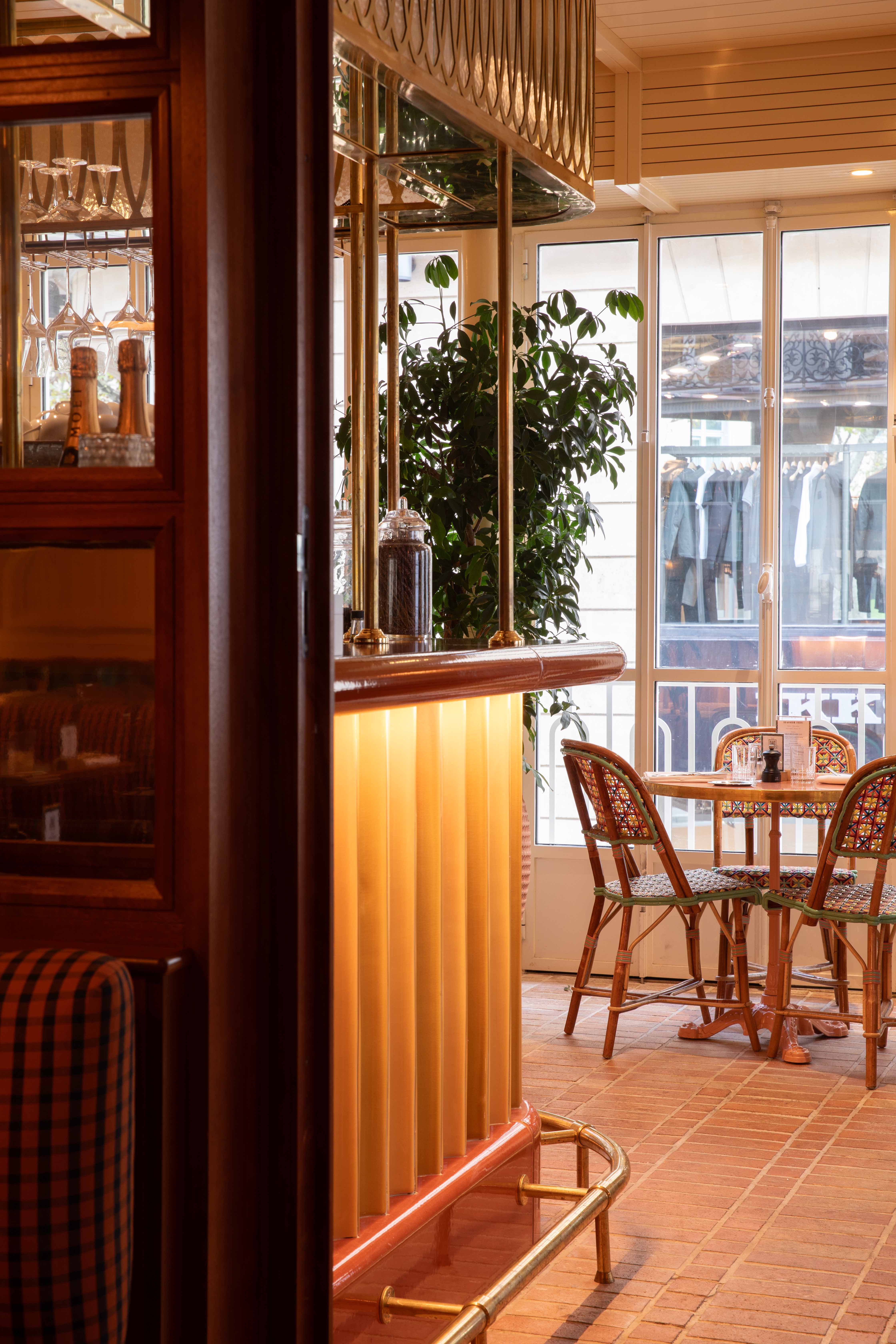 Le studio Pierre Frey a également conçu un tapis sur mesure à partir d’un design imaginé Pravda Arkitect - Laura Gonzalez et dont les couleurs s’accordent aux carreaux de céramique au sol, apportant chaleur et structure à l’espace. Élément central de la pièce, ce tapis délimite harmonieusement les différents espaces entre le bar et la partie dinatoire, se prolongeant ensuite en moquette.
