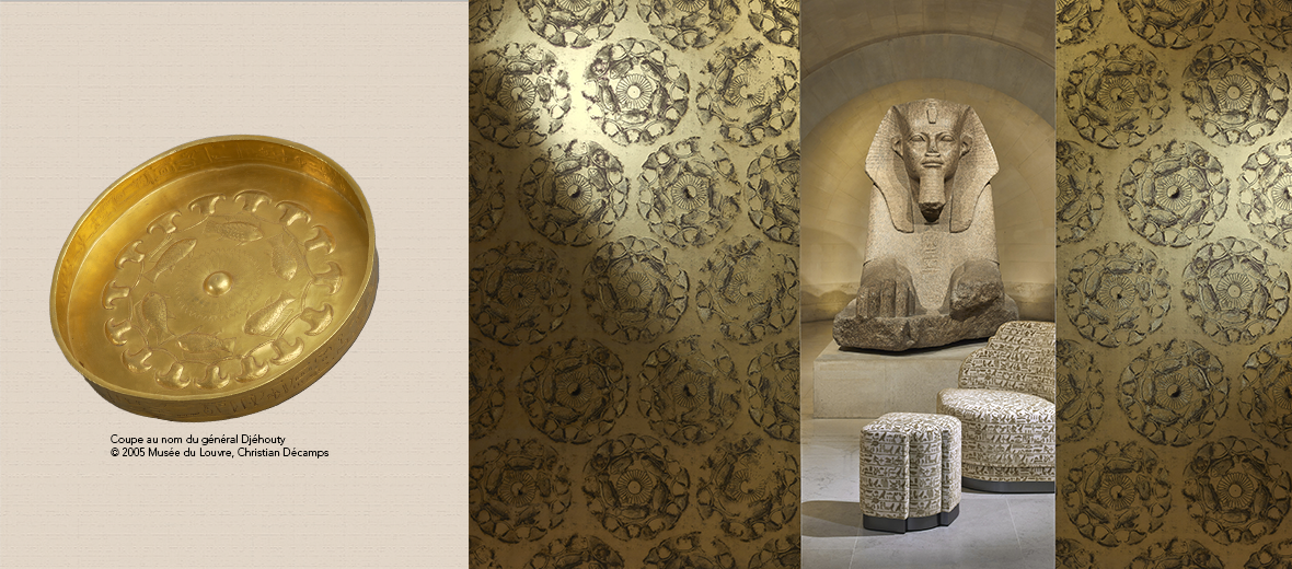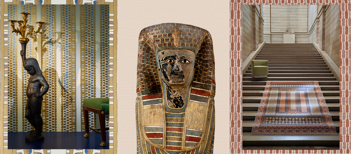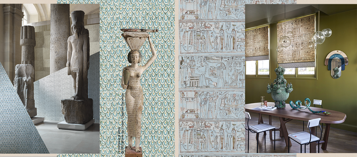A la suite d’un méticuleux travail de recherches, huit œuvres ont été sélectionnées parmi les sept mille exposées dans la galerie des Antiquités Egyptiennes. Entre reproductions fidèles et inspirations libres, l’équipe créative de la Maison Pierre Frey a tenu à respecter l’authenticité de ces œuvres tout en apportant une lecture contemporaine et graphique, guidée par trois aspects fondamentaux : la couleur, la matière et la géométrie.