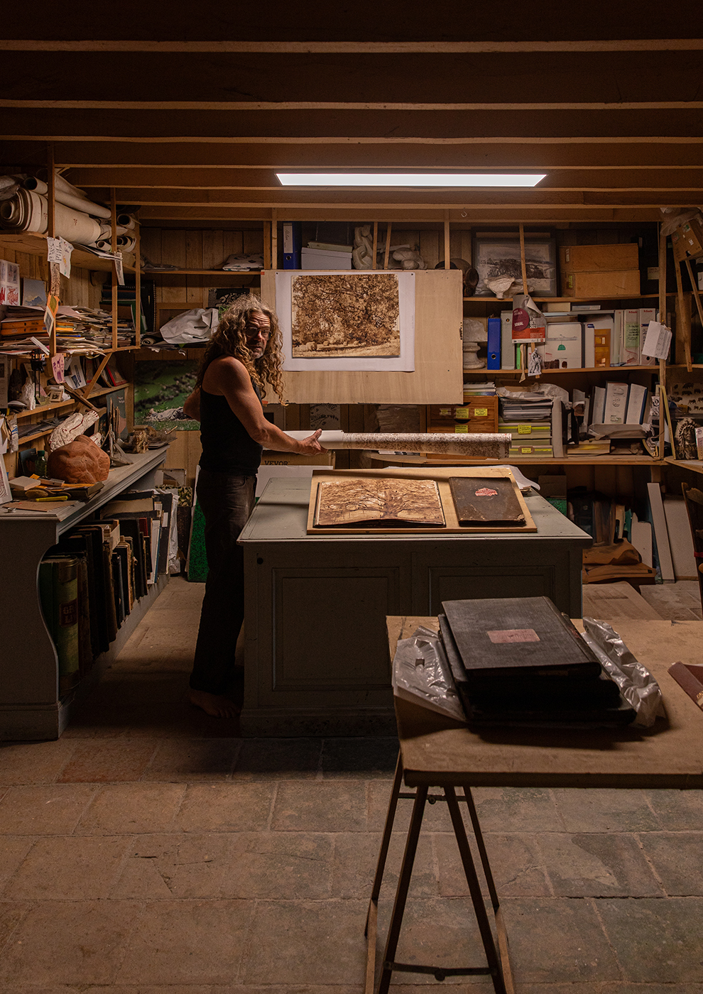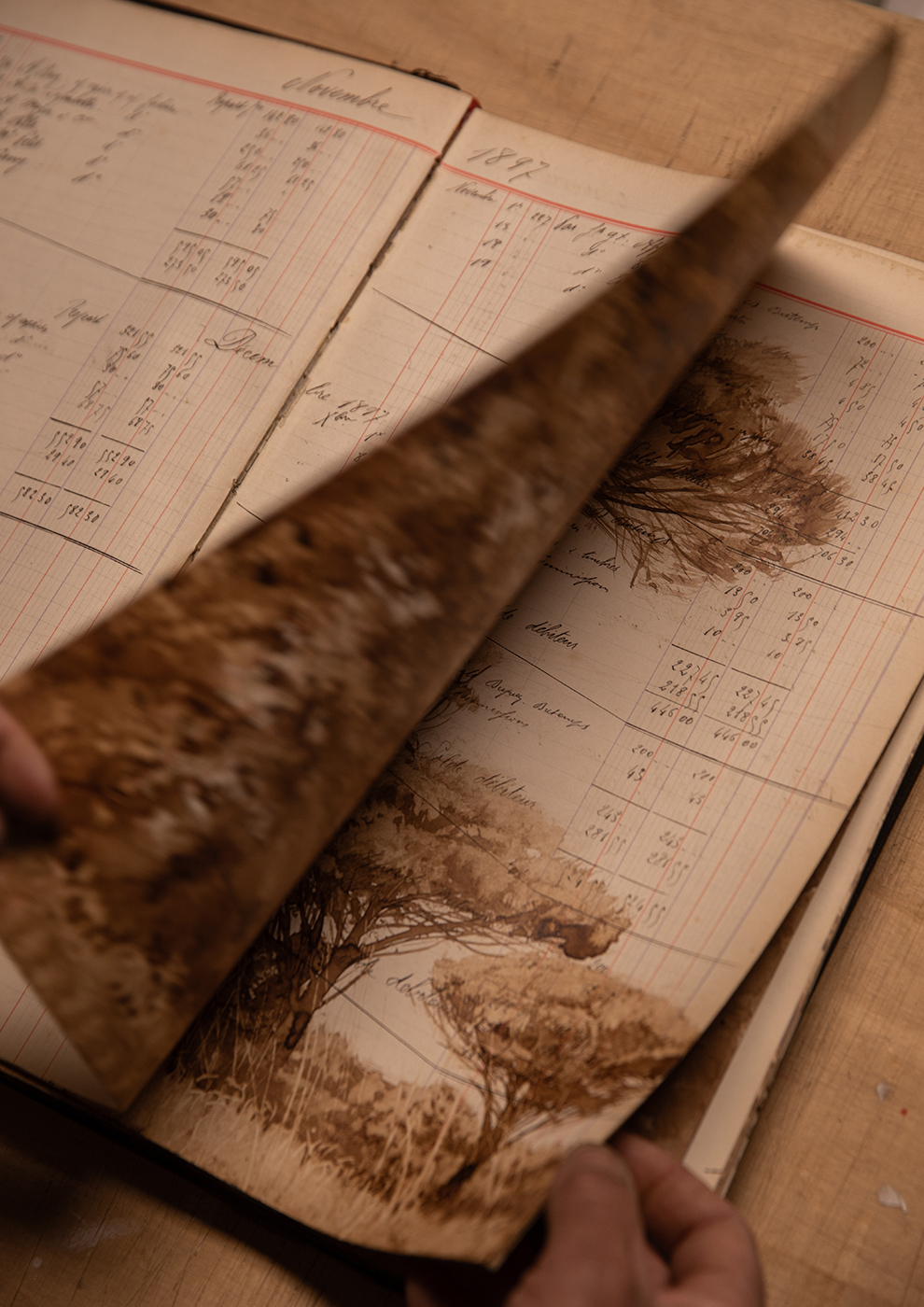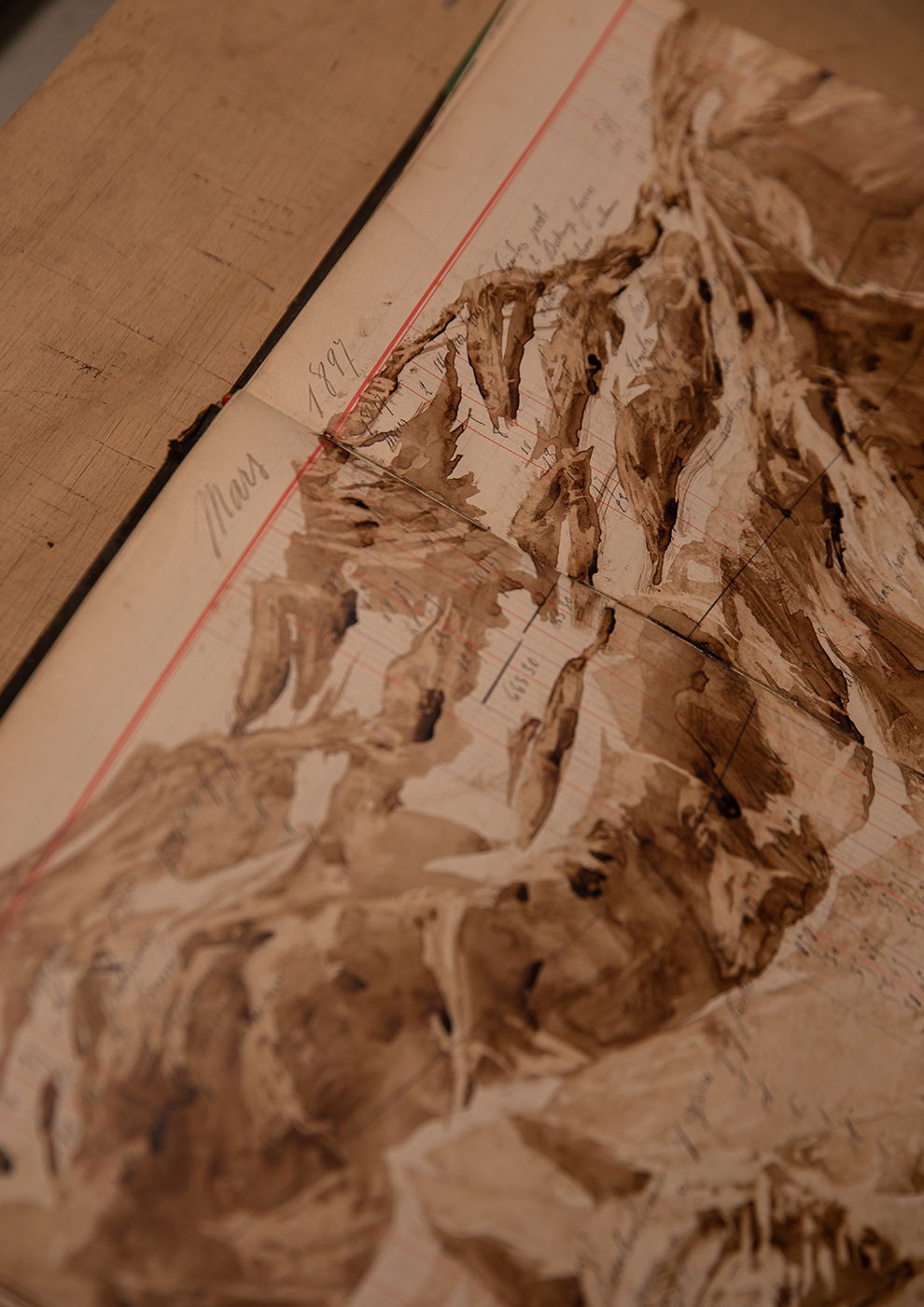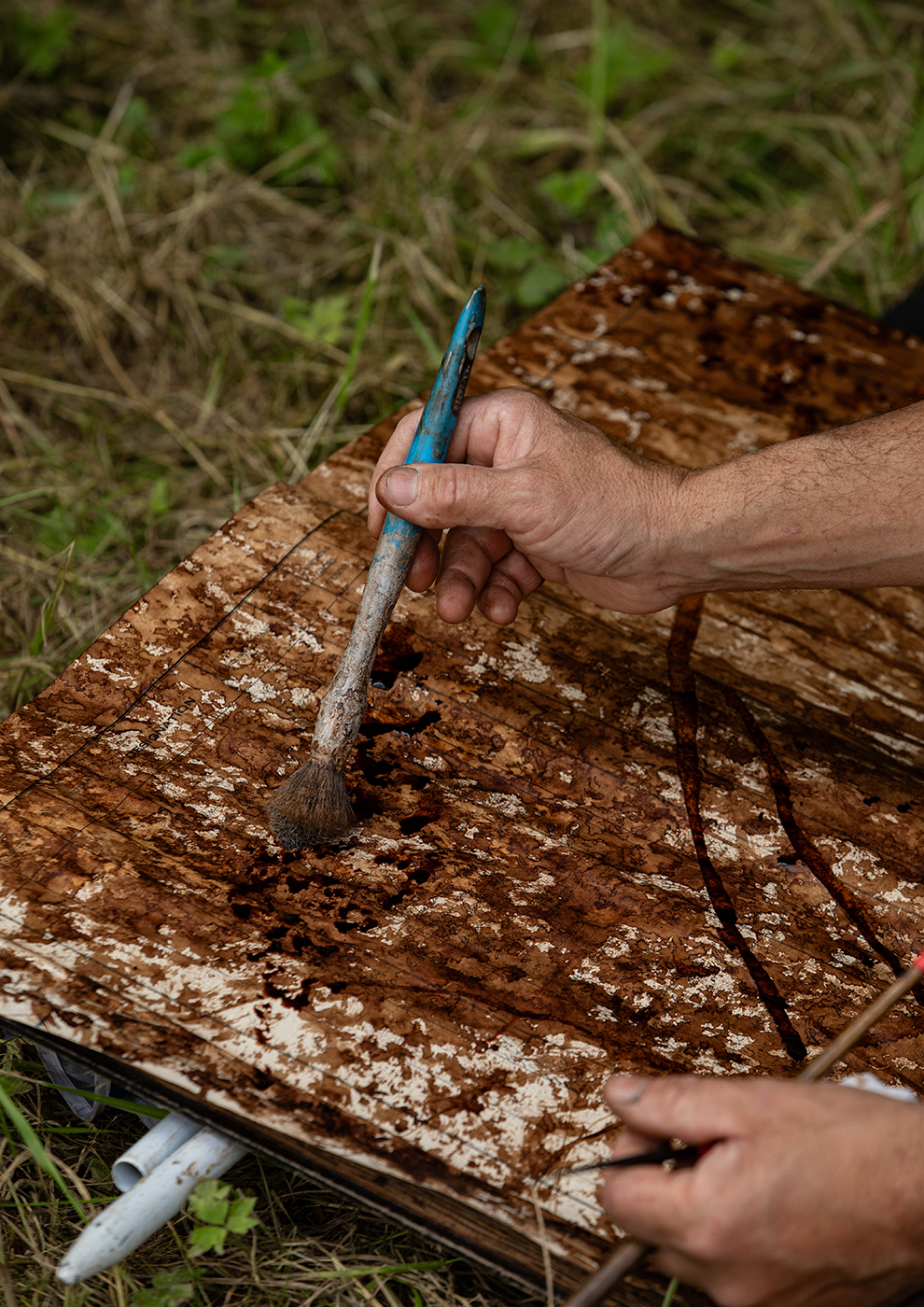 Favéro ne cherche pas à séduire, il trace, martèle, sculpte, grave, dessine. Il affectionne les supports inhabituels, notamment les vieux livres de comptes, patinés par le temps, dont les pages brunies, accueillent ses dessins au brou de noix d’une précision saisissante. Ses compositions naissent ainsi d’un dialogue entre le passé et le présent, entre la matière retrouvée et la lumière qu’il aime faire surgir.