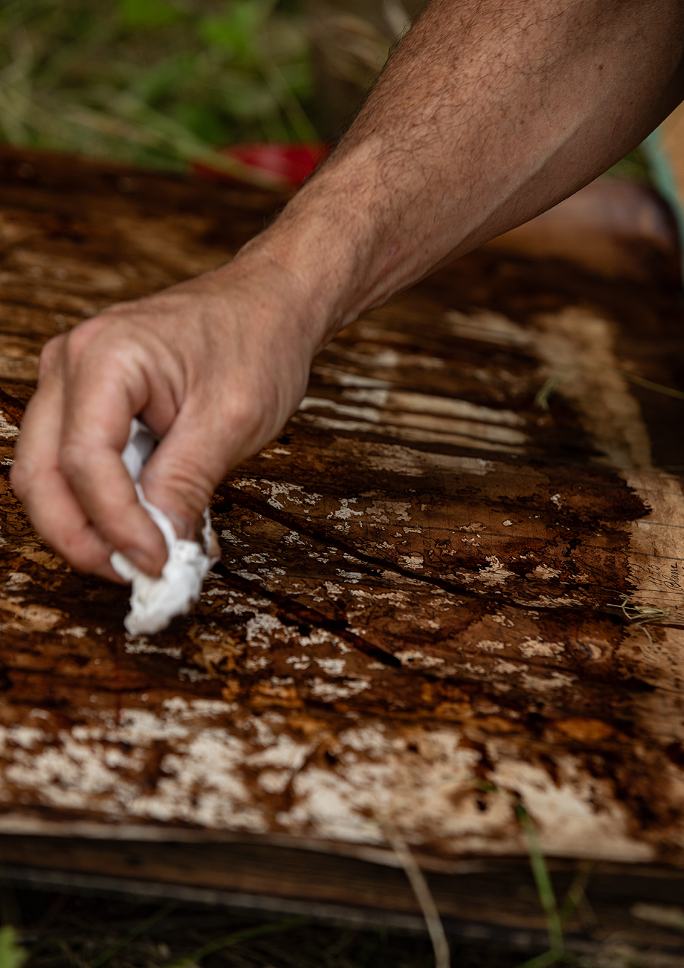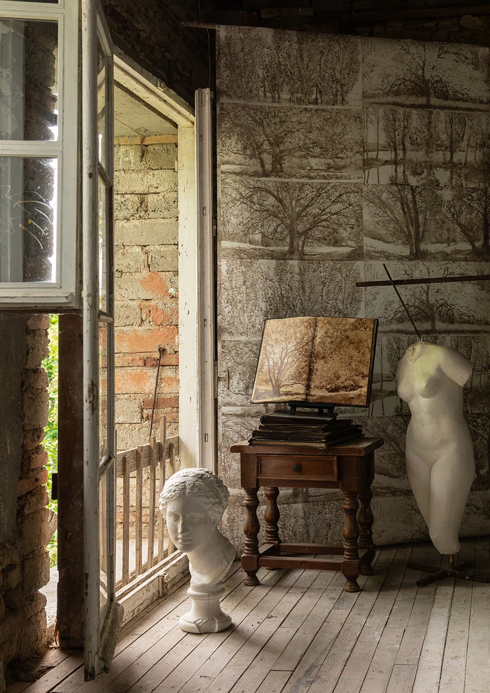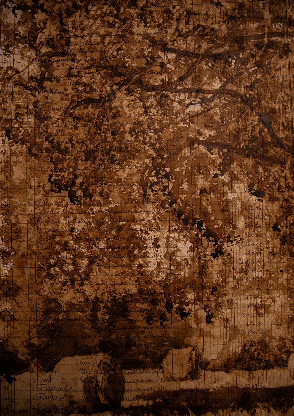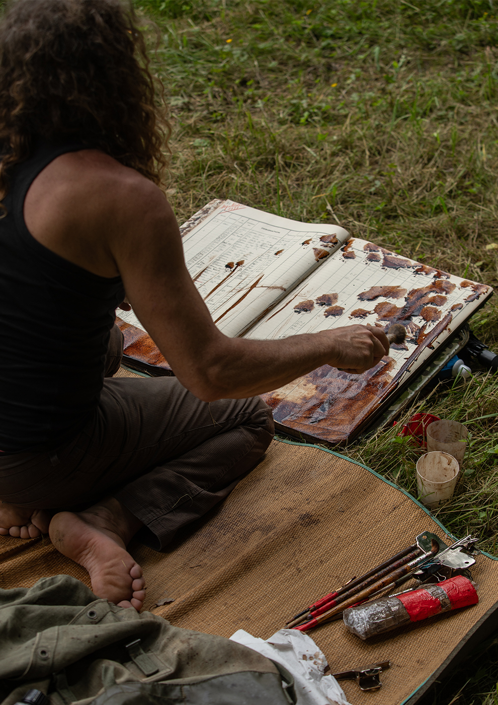Favéro ne cherche pas à séduire, il trace, martèle, sculpte, grave, dessine. Il affectionne les supports inhabituels, notamment les vieux livres de comptes, patinés par le temps, dont les pages brunies, accueillent ses dessins au brou de noix d’une précision saisissante. Ses compositions naissent ainsi d’un dialogue entre le passé et le présent, entre la matière retrouvée et la lumière qu’il aime faire surgir.