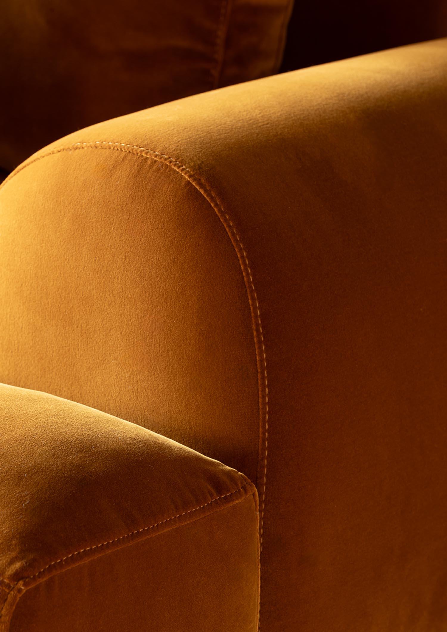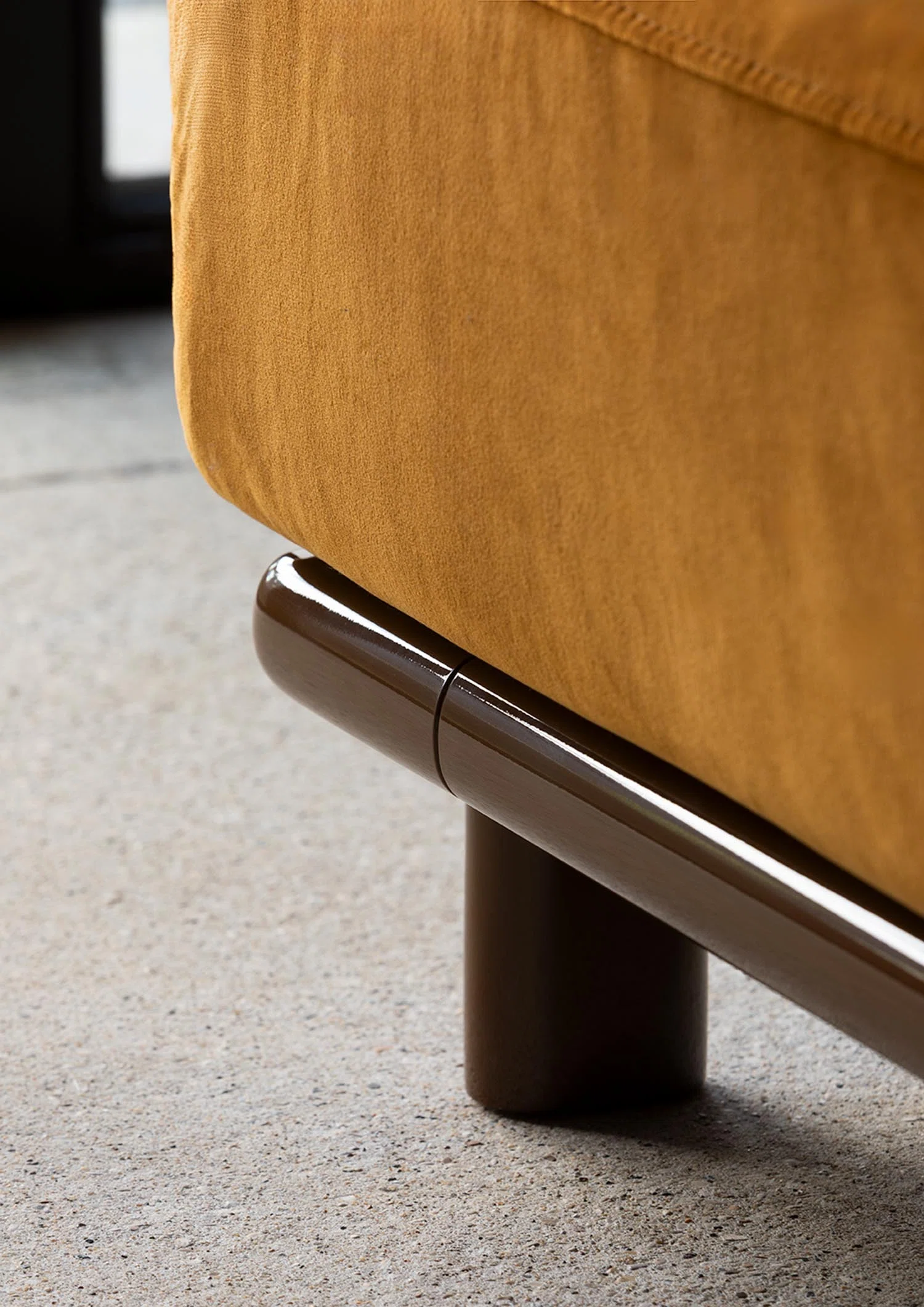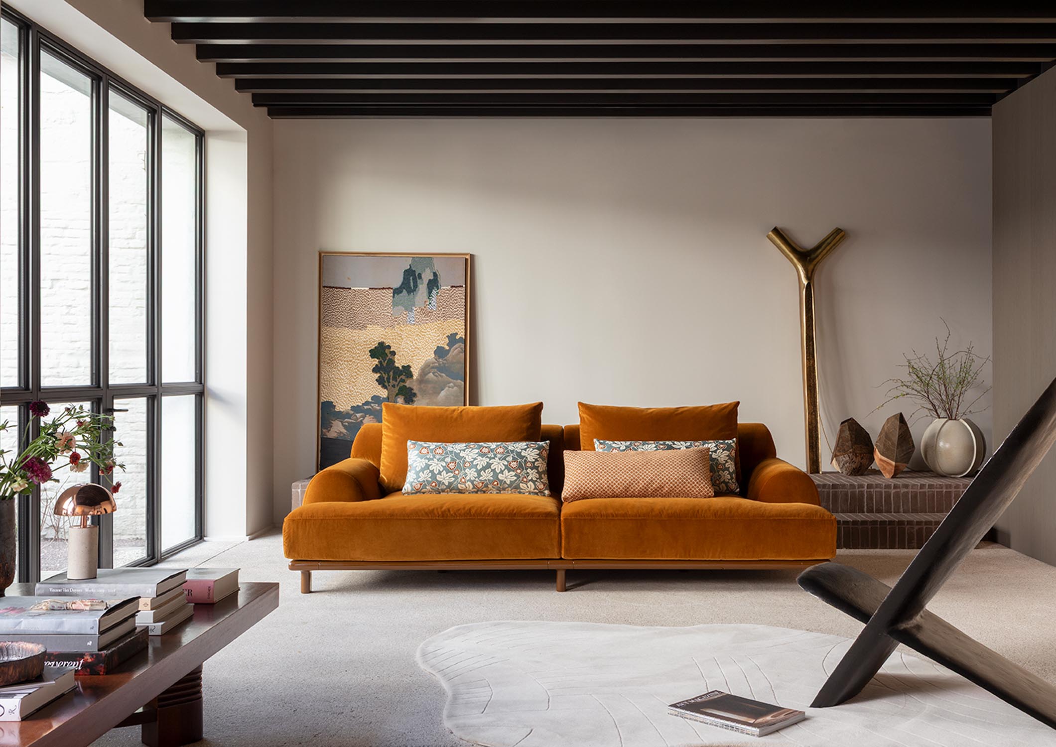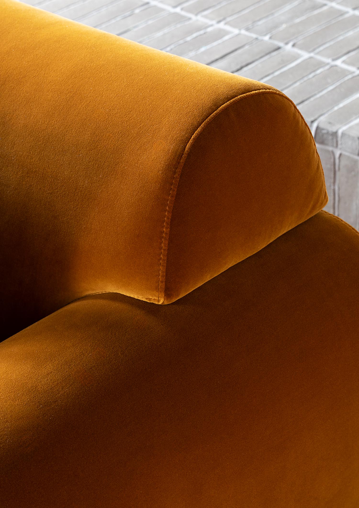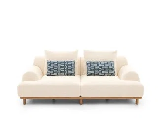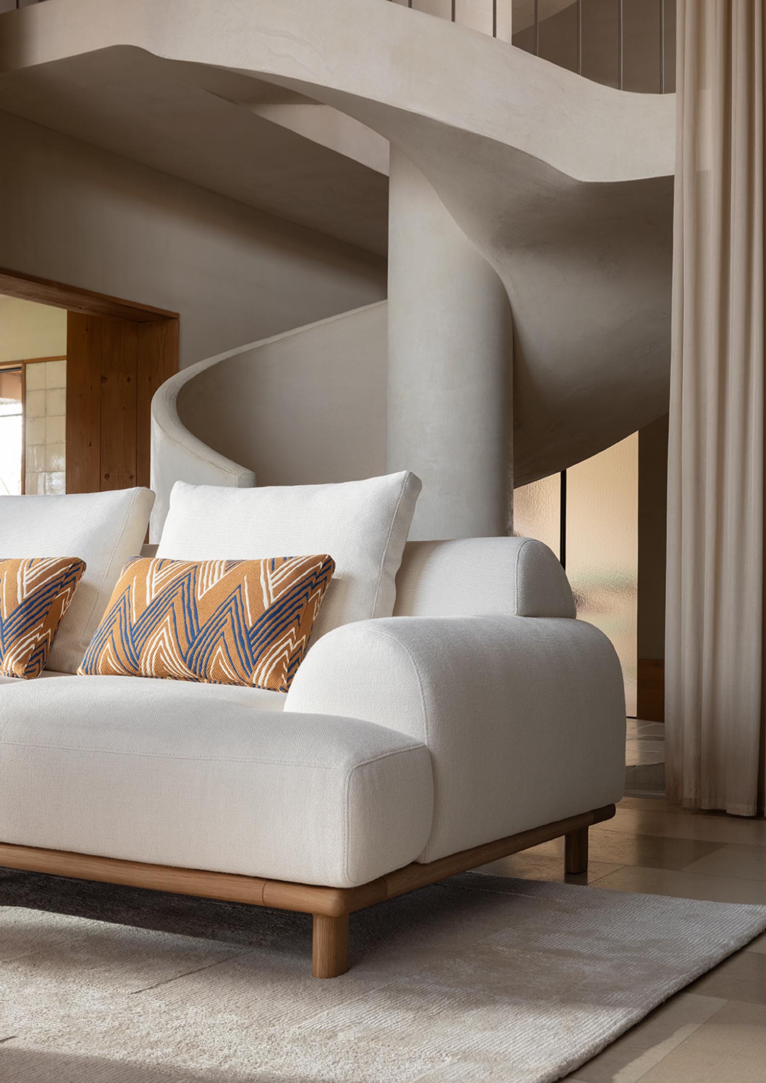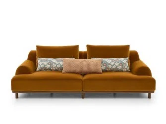 BELLPORT, dessiné par Christian Haas, évoque l’atmosphère feutrée d’un village de Long Island, entre simplicité élégante et art de vivre tourné vers le partage. Un lieu où le confort s’installe naturellement, sans ostentation. Ici, tout est pensé pour l’accueil. Les proportions sont amples, les lignes ouvertes, l’assise profonde. Le canapé invite à s’y installer, à s’y retrouver, à y rester. Le confort devient une forme. Les volumes, généreusement dessinés, expriment d’emblée une sensation de douceur. Le dossier et les accoudoirs, larges et continus, enveloppent le corps dans une silhouette calme et posée. Les coussins, garnis de duvet, offrent un accueil souple, presque fluide, qui accompagne les mouvements sans jamais les contraindre. Le tissu y trouve un terrain d’expression privilégié. Déployé sur ces surfaces pleines, il révèle toute sa richesse, sa texture, sa profondeur. La base, en bois massif, ancre l’ensemble. Elle peut se fondre dans le revêtement ou, au contraire, affirmer sa présence en laque, dans une teinte choisie, prolongeant ainsi la liberté de composition.