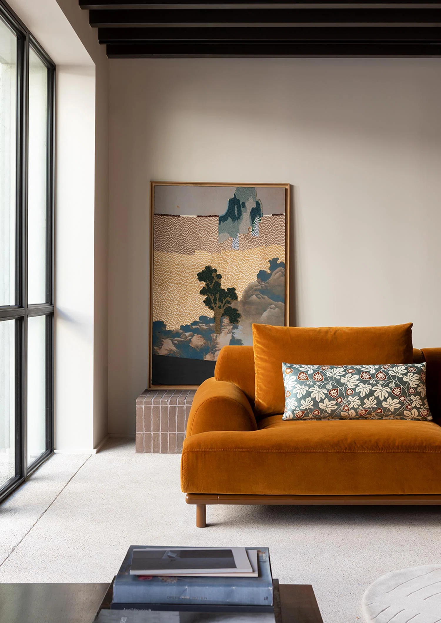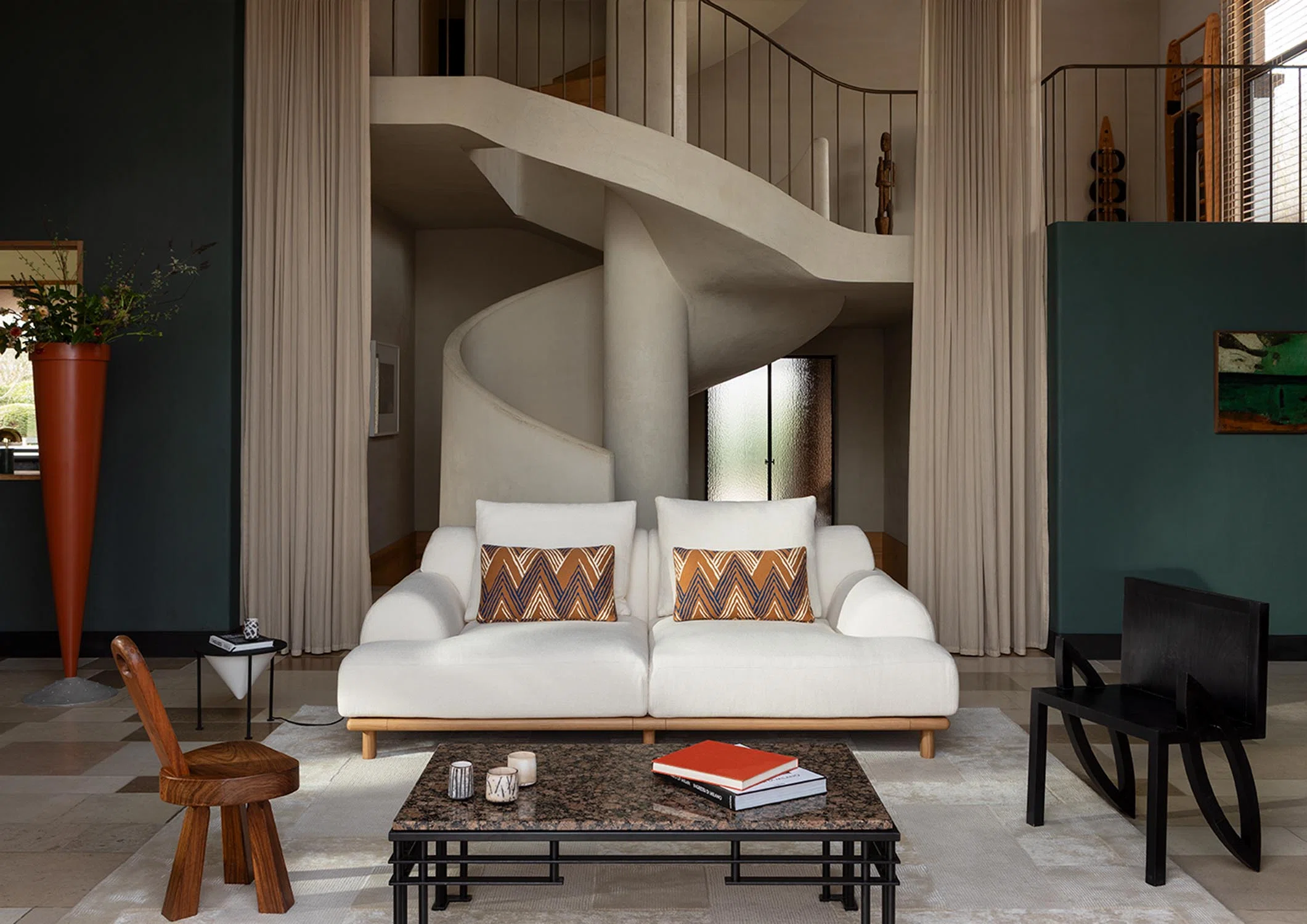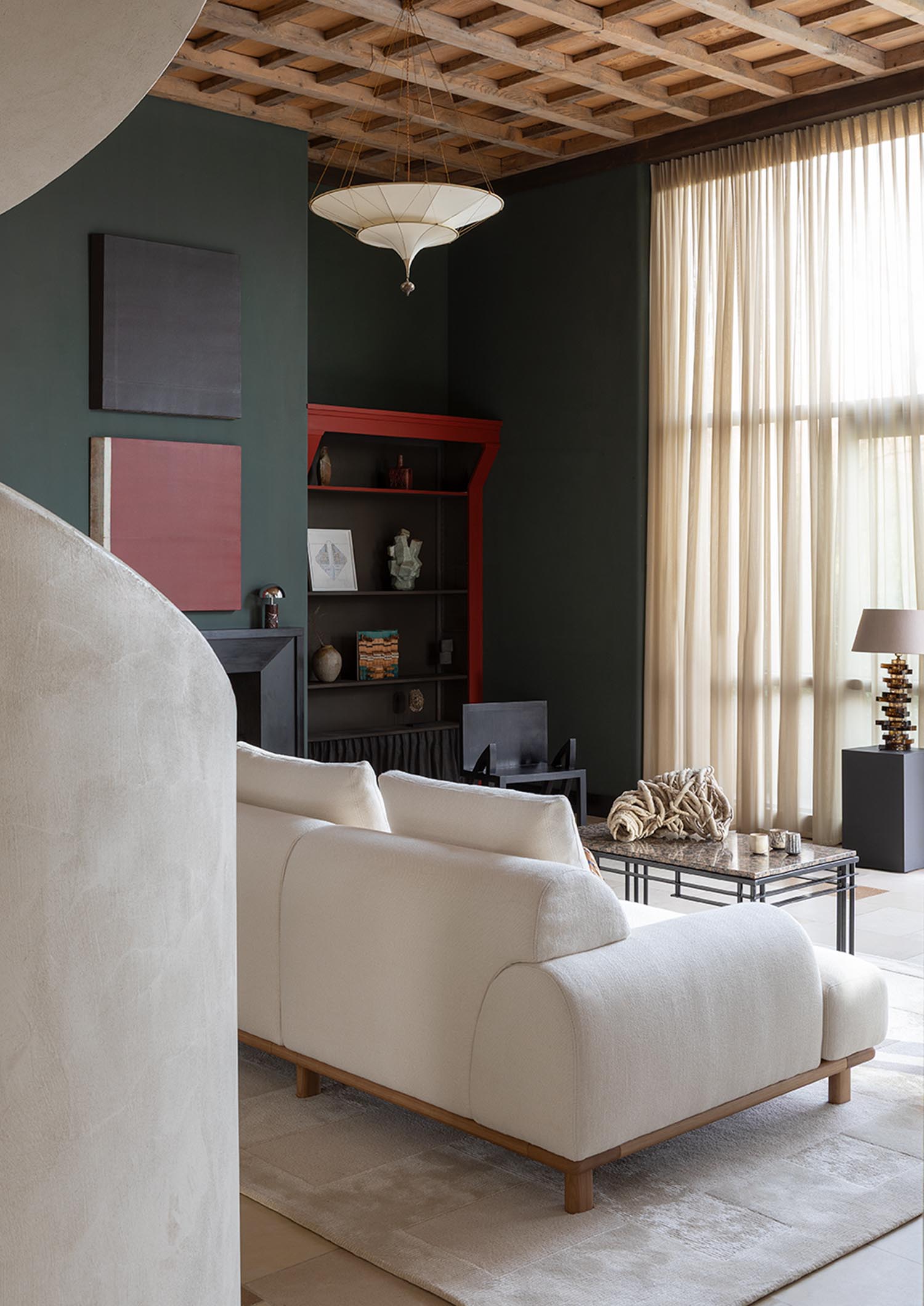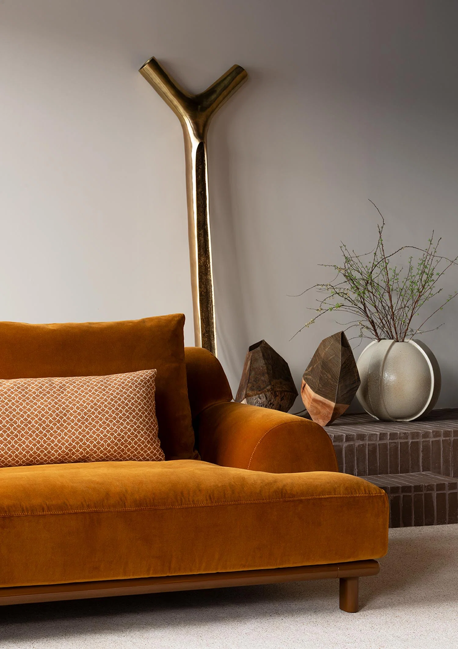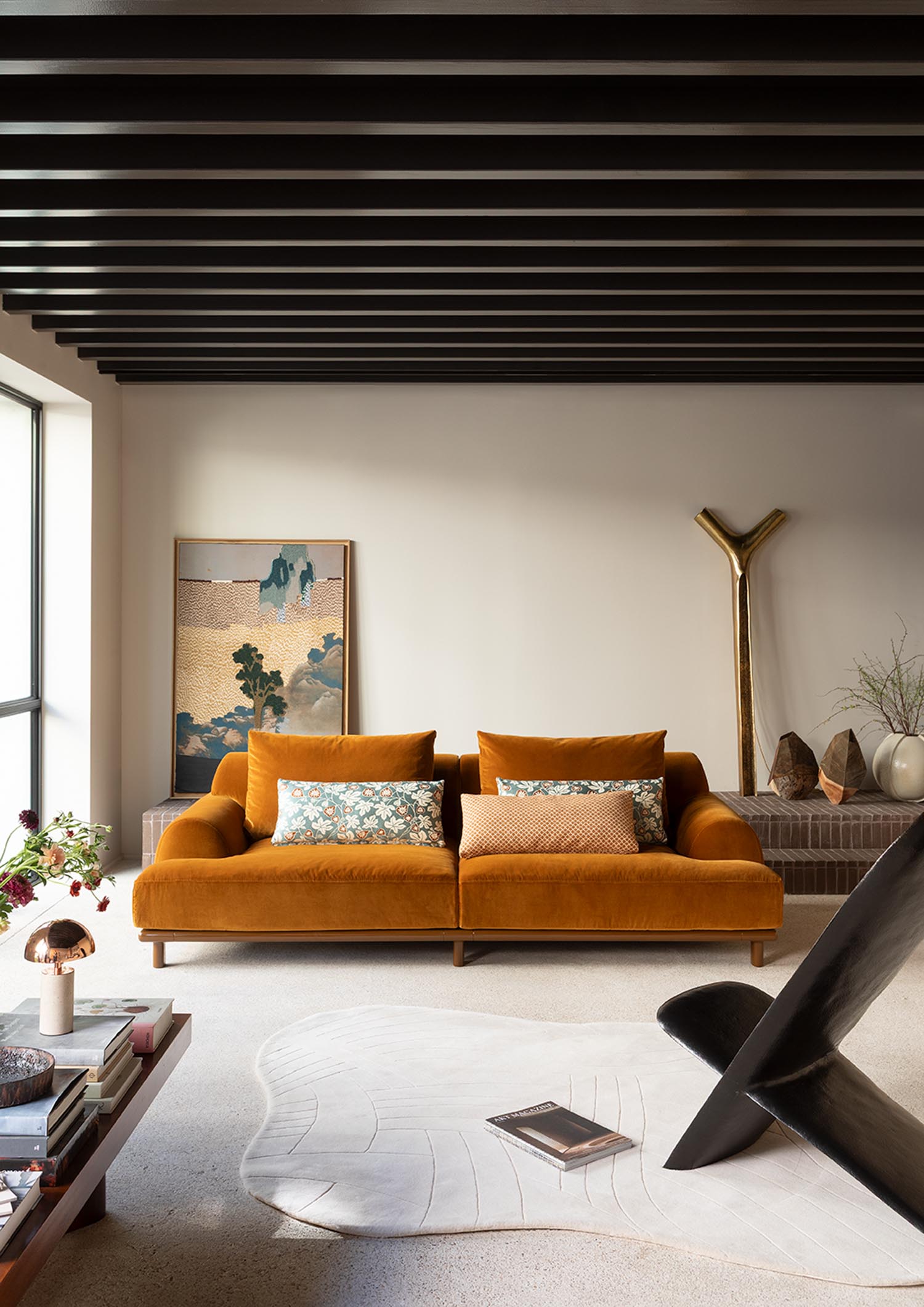 BELLPORT, dessiné par Christian Haas, évoque l’atmosphère feutrée d’un village de Long Island, entre simplicité élégante et art de vivre tourné vers le partage. Un lieu où le confort s’installe naturellement, sans ostentation. Ici, tout est pensé pour l’accueil. Les proportions sont amples, les lignes ouvertes, l’assise profonde. Le canapé invite à s’y installer, à s’y retrouver, à y rester. Le confort devient une forme. Les volumes, généreusement dessinés, expriment d’emblée une sensation de douceur. Le dossier et les accoudoirs, larges et continus, enveloppent le corps dans une silhouette calme et posée. Les coussins, garnis de duvet, offrent un accueil souple, presque fluide, qui accompagne les mouvements sans jamais les contraindre. Le tissu y trouve un terrain d’expression privilégié. Déployé sur ces surfaces pleines, il révèle toute sa richesse, sa texture, sa profondeur. La base, en bois massif, ancre l’ensemble. Elle peut se fondre dans le revêtement ou, au contraire, affirmer sa présence en laque, dans une teinte choisie, prolongeant ainsi la liberté de composition.