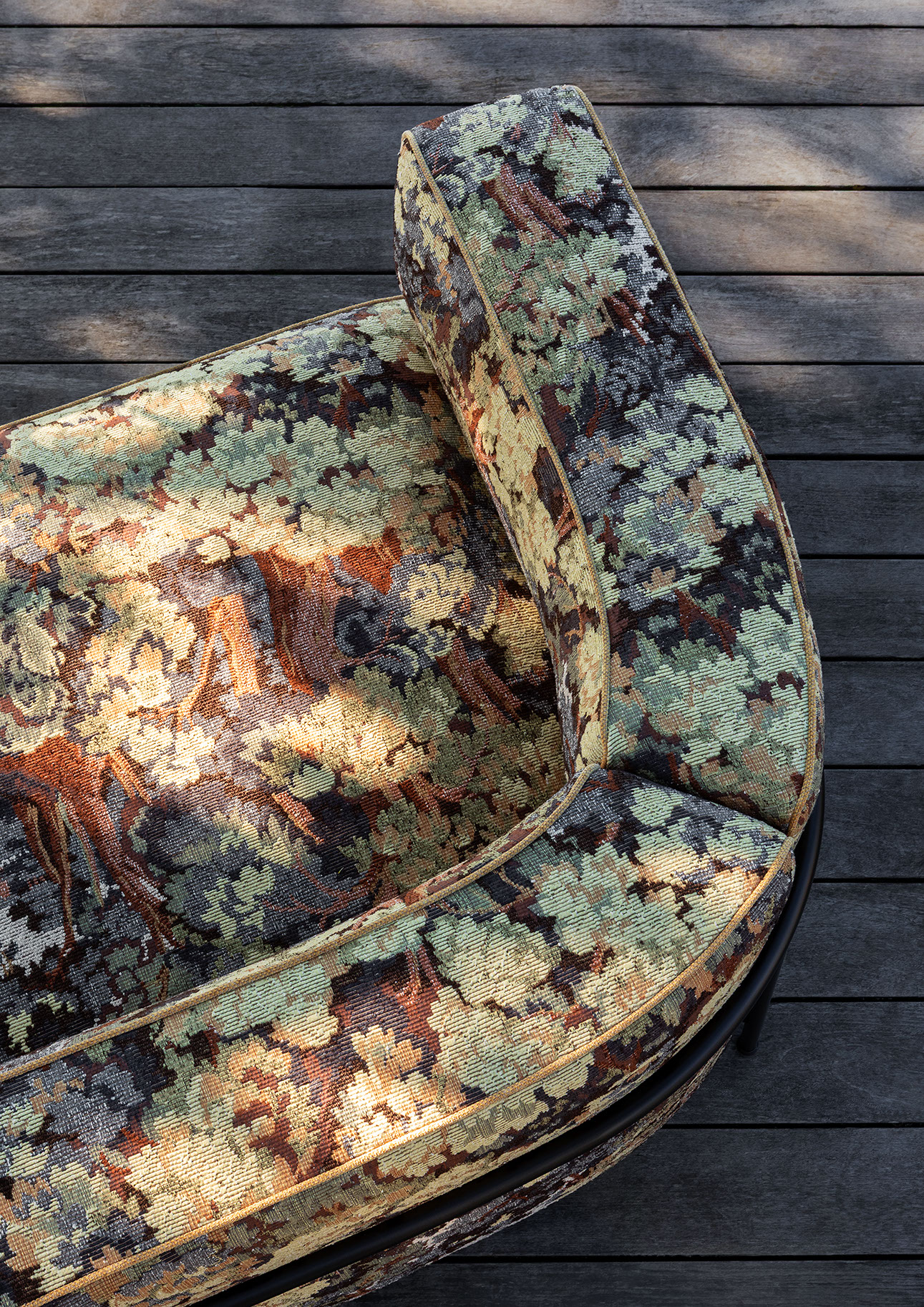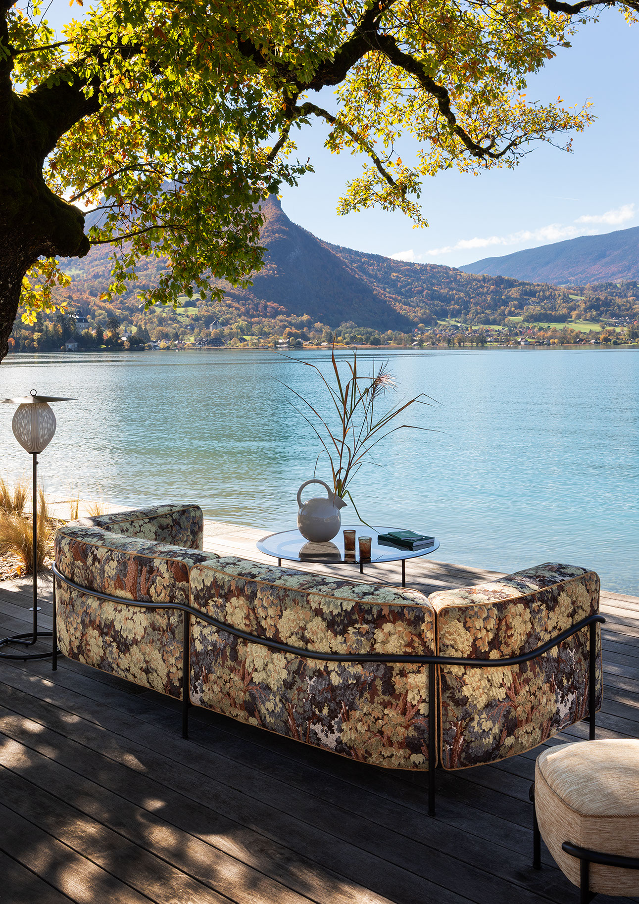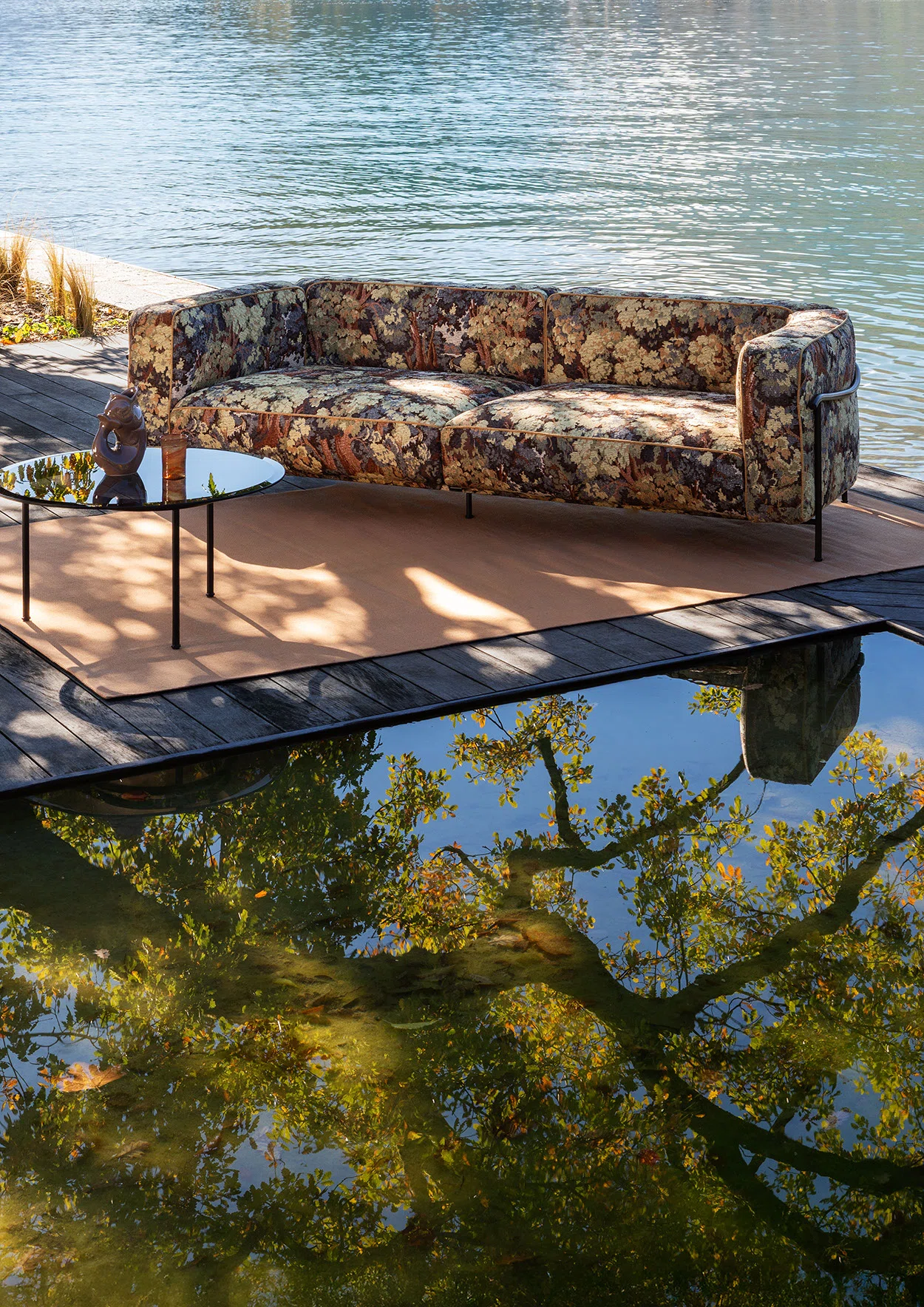 La ligne indoor et outdoor Mirage, nous ramène aux songes des nuits d'été. Elle célèbre l'attente de la saison estivale, les premiers rayons de soleil du printemps, qui apportent un sentiment de joie et d'euphorie. La générosité des coussins épouse les formes du corps et nous invite à nous détendre, en profitant du soleil. La structure métallique fine, sous forme de vagues, entoure les coussins et fait référence à un mirage, une illusion d'optique due à la réfraction inégale des rayons solaires.