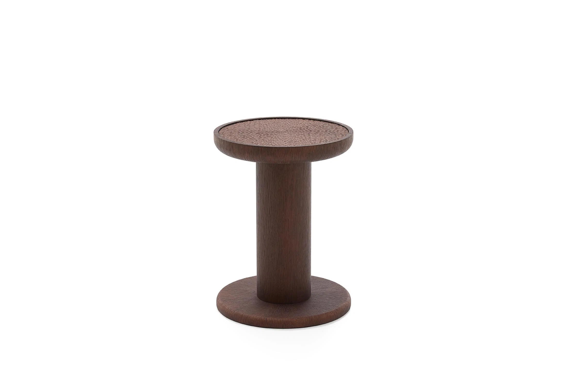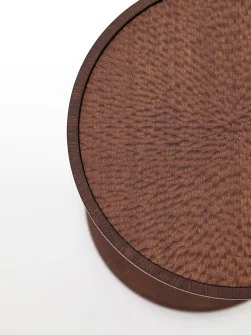 VESTA, dessinée par Garnier & Linker, est une ligne pensée comme un ensemble, où chaque pièce répond à l’autre dans un équilibre de formes et de proportions. Fauteuil, chaise, pouf et guéridons partagent une même écriture : des volumes pleins et arrondis, portés par un pied central en bois, signature à la fois structurelle et expressive. Son nom évoque Vesta, déesse romaine du foyer ; une présence silencieuse, liée à l’intimité, à la chaleur, à l’ancrage. Tout part de ce pied central. Un élément unique, travaillé dans le bois comme une matière vivante, capable de porter le dessin tout entier. De cette intuition initiale naît le fauteuil, puis, par glissement naturel, la ligne se déploie : les assises s’équilibrent, les guéridons prolongent le geste, dans un jeu de correspondances et de tensions maîtrisées. Le bois y tient un rôle essentiel. Les placages, souvent courbes, exigent une précision extrême et traduisent un savoir-faire où la complexité technique se met au service de la douceur des lignes et de la pérennité des formes. En regard, le gainage des tissus enveloppe les volumes, accentuant leur générosité et prolongeant ce dialogue entre structure et sensation. Les guéridons ouvrent enfin un territoire plus libre. Leurs inserts en laque artistique introduisent une dimension picturale et offrent un champ de personnalisation étendu, permettant à chaque pièce de trouver sa place dans des univers singuliers.