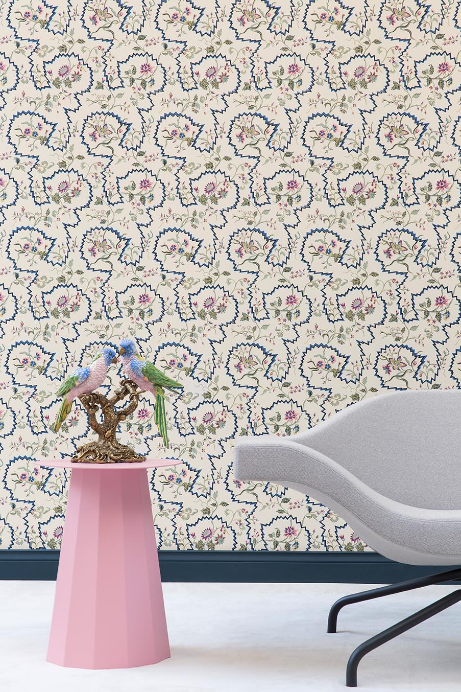 COMPAGNIE DES INDES est une ode à l’exotisme, thème majeur des arts décoratifs au XVIIIe siècle. Fleurs exotiques, ananas et chinoiseries témoignent de cet attrait pour l’ailleurs qui débute au XVIe siècle avec les importations de l’Empire Ottoman, de l’Inde, de la Perse et de la Chine. Ces contrées lointaines fascinent les européens qui se laissent séduire par ce rêve d’exotisme. Une grande sélection d'archives détenues par la Maison Pierre Frey sont ici réinterprétées, enjolivées et adaptées à la décoration murale.