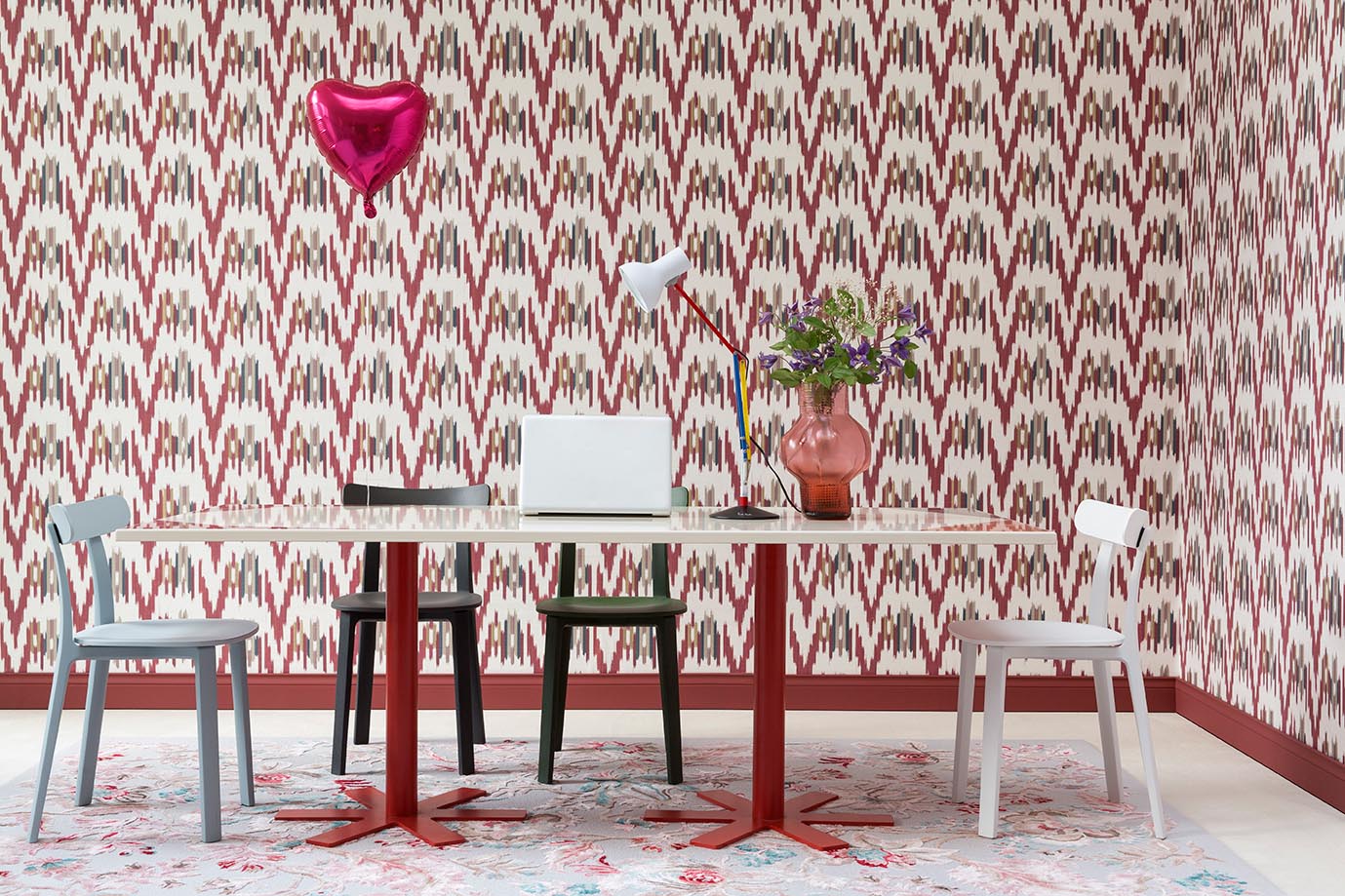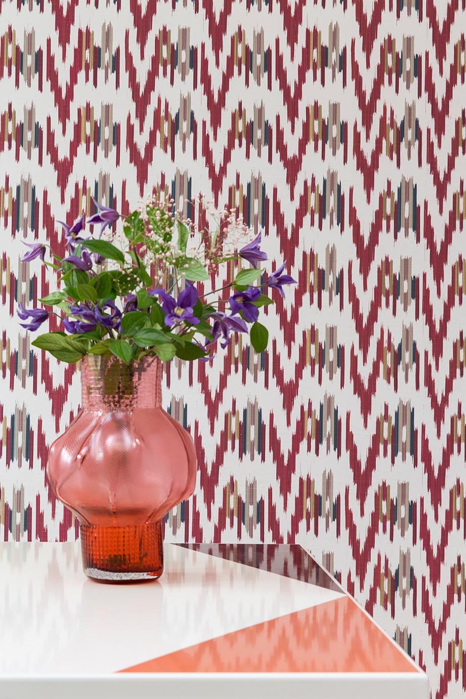 L’ODISSI s'inspire d'une impression sur chaîne du 19e siècle. Le document d'origine est conservé dans les archives de la Maison Pierre Frey. Papier peint imprimé sur soie contrecollée SHIVA BP334.