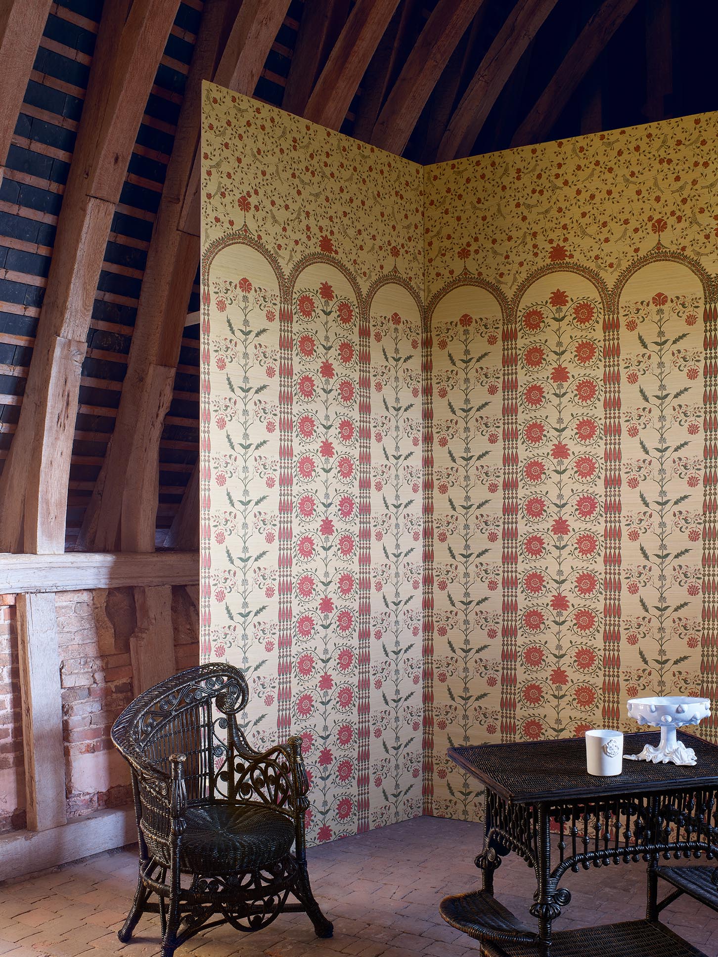 Célèbre document de la Maison Braquenié, LES ARCADES ALBERTINE reproduit un panneau indo-persan imprimé et peint à l’origine en Inde au XVIIIe siècle. Ce papier peint panoramique est imprimé sur une soie sauvage au tissage artisanal. Coordonné au papier peint BENGALI ALBERTINE BP347 et aux unis ALBERTINE F3278 et FP640.