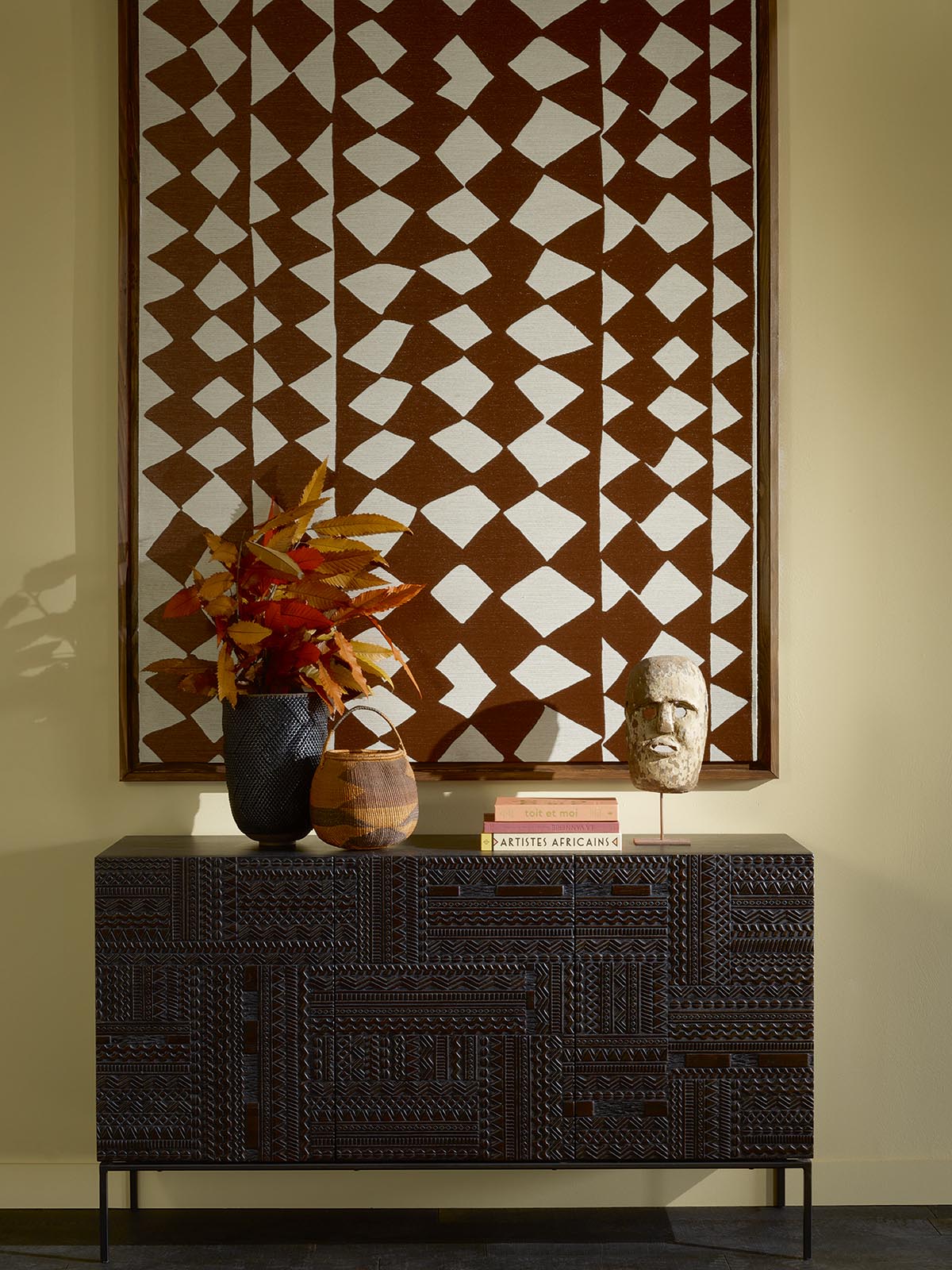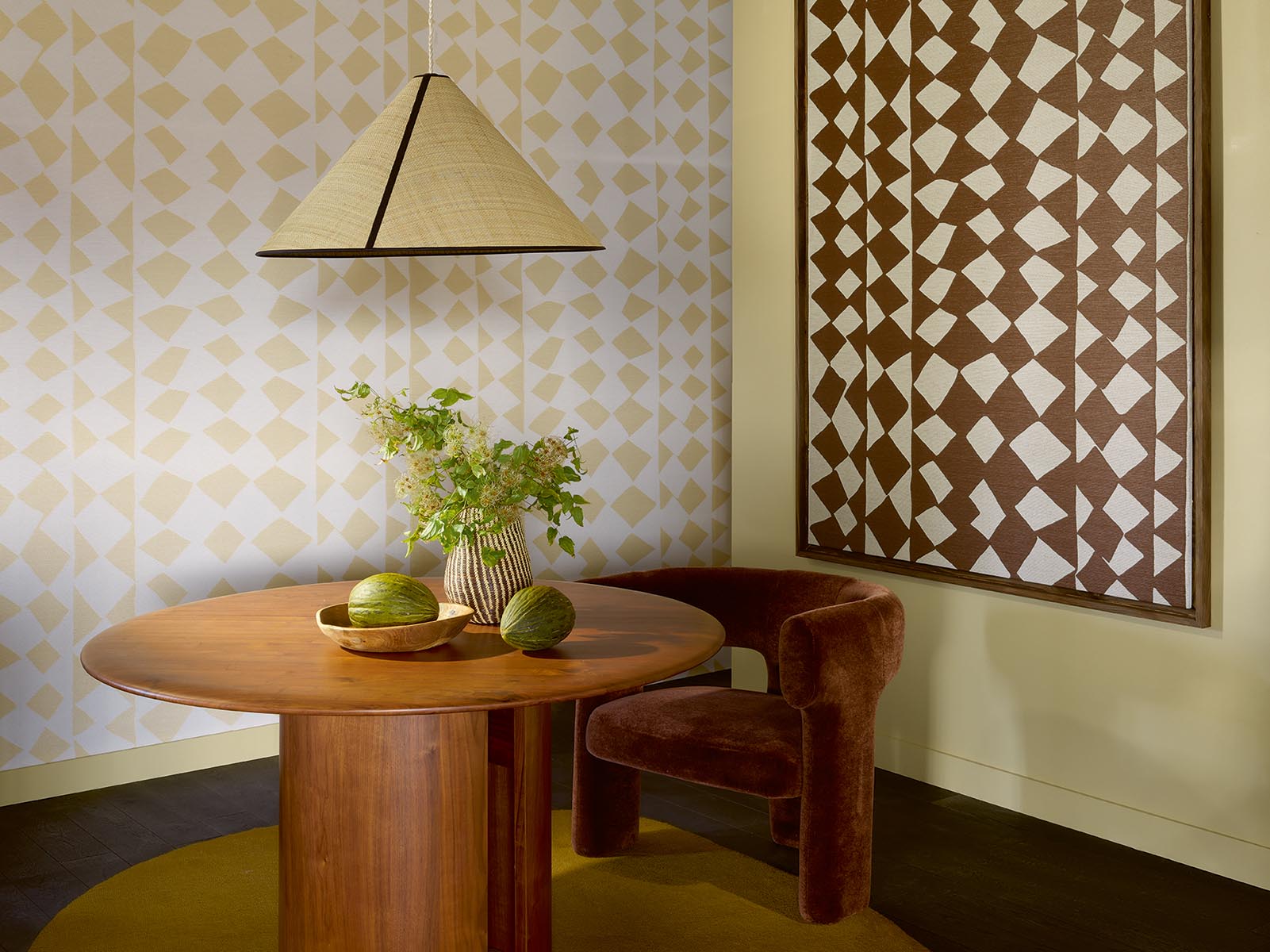 Les fils raphia et les armures de ce revêtement mural contrecollé sur intissé illustrent des losanges graphiques dont le dessin irrégulier rappelle les nombreuses décorations murales traditionnelles. Existe également en tissu sous la référence F3849.