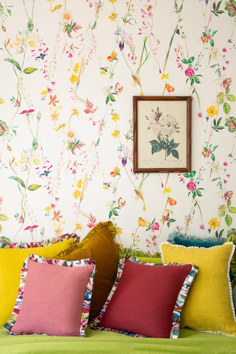 Fleurs champêtres et abeilles disposées sous la forme de treillage délicatement peint à la main à l’aquarelle par Charlotte Boutron. POLLEN est imprimé en grande largeur sur intissé.