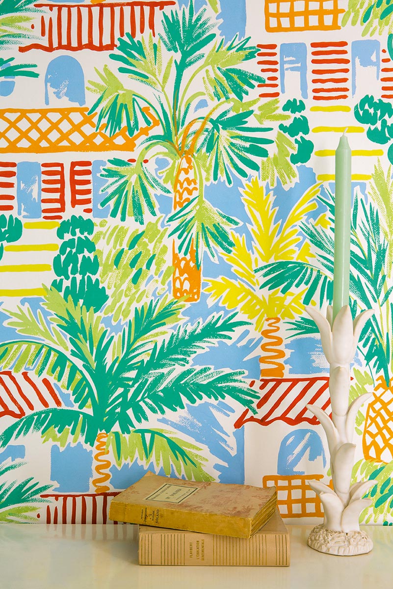Reproduction d’un motif de la Maison des années 1980 illustrant de manière naïve et colorée la végétation du célèbre village de Saint-Tropez. SAINT-TROP est imprimé en grande largeur sur intissé.
