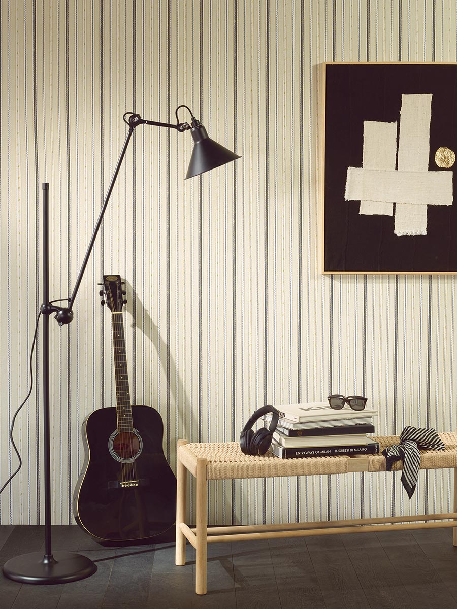Rayure fantaisie aux couleurs douces rehaussée par une encre métallisée. SEINE est une rayure simple et de caractère !