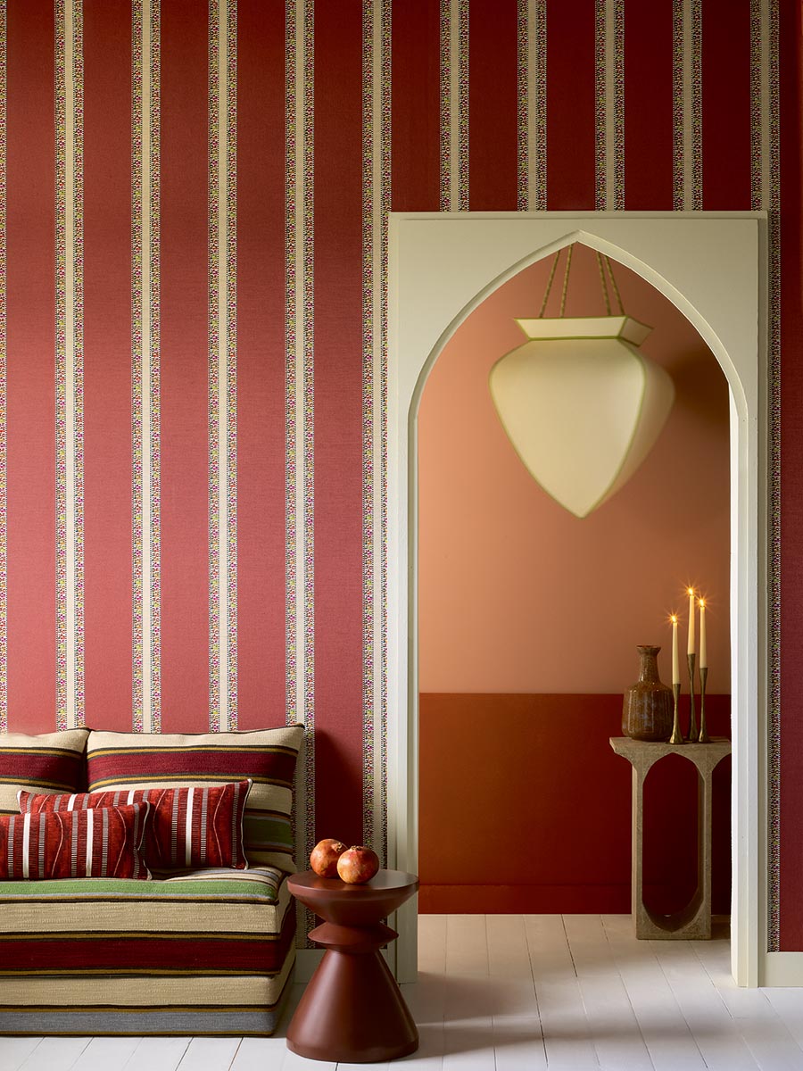 Cette rayure classique d’inspiration cachemire s’inspire d’une rayure en soie découverte dans un recueil d’échantillons conservés dans les archives de la Maison. BENIN est imprimé sur un support en lin contrecollé et rehaussé d’un vernis.