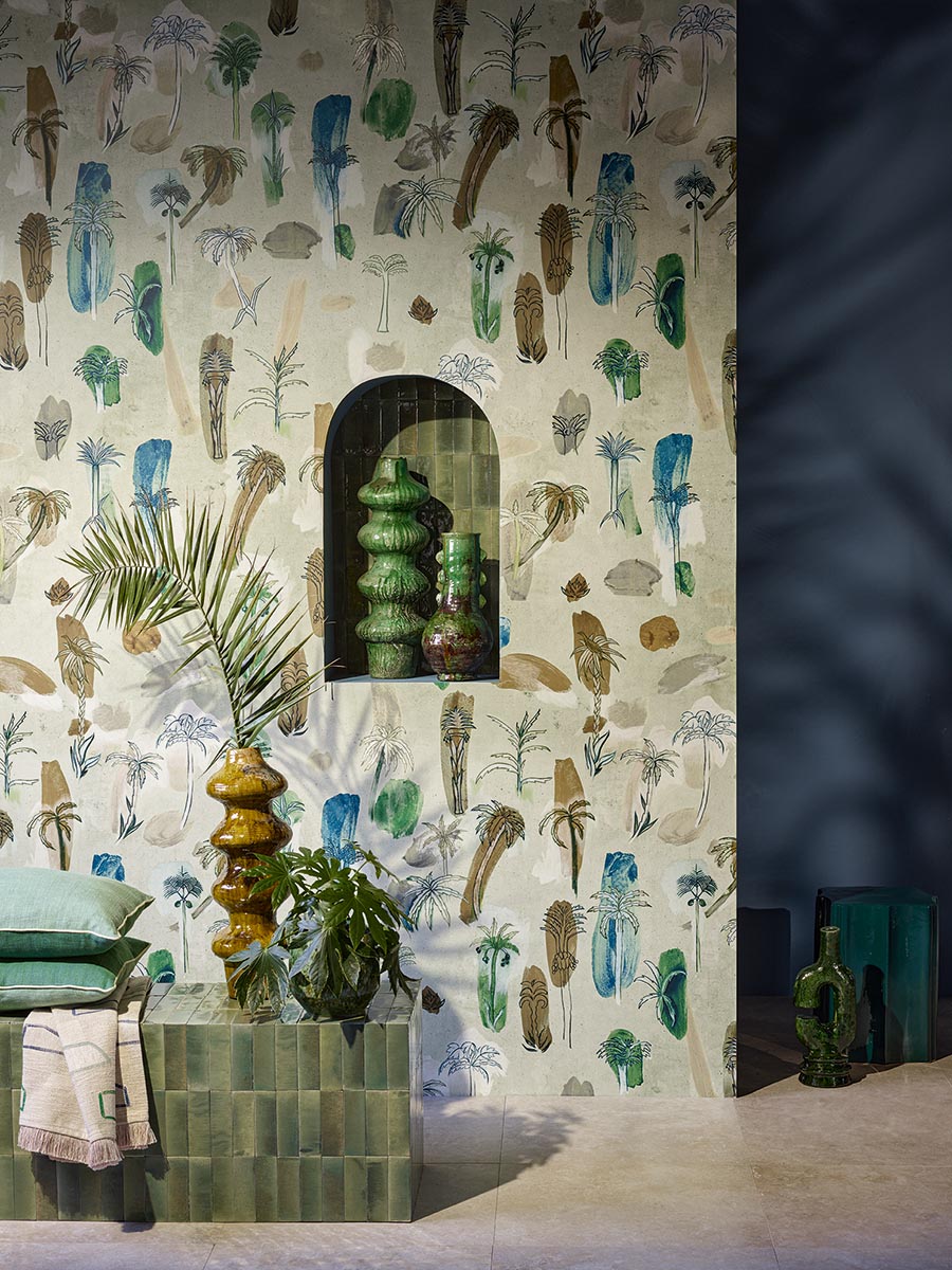 Ce papier peint évoque un rêve d'oasis entre palmiers et taches colorées. Il se décline en deux tons: teintes chaudes, ensoleillées ou verts rafraîchissants. Un tissu du même motif est également proposé.