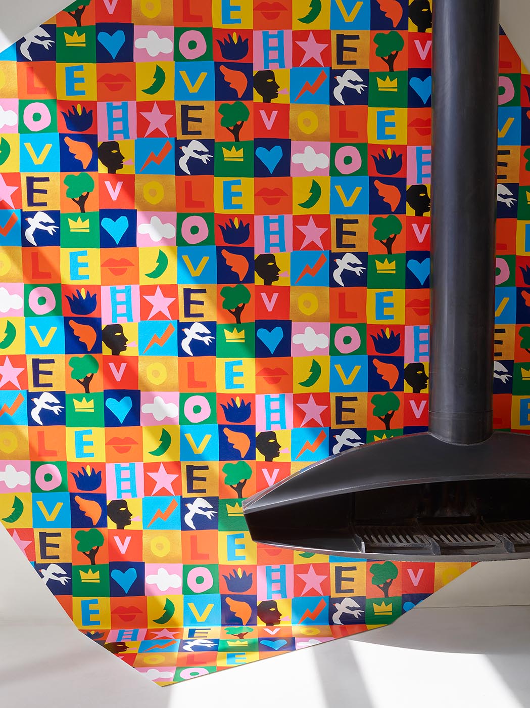 Le plus beau jeu, comme un langage universel, où lettres et symboles, couleurs et géométrie coexistent en un héraldique pop et contemporain, cristallisant l’univers joyeux de JCC+. Dessin du drapeau de cette collection : collage et blason, imprimé en encres mattes et mica donnant un jeu de lumière singulier au mur.