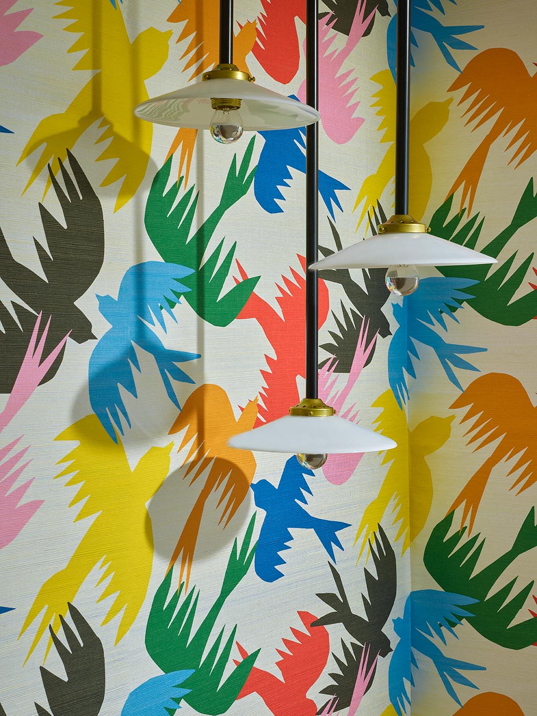 Après la pluie, les oiseaux de paradis plongent dans l’arc-en-ciel pour choisir la couleur de leur robe, avant de danser au rythme du vent. L’impression sur un support sisal aux reflets argentés apporte rythme et poésie au dessin.