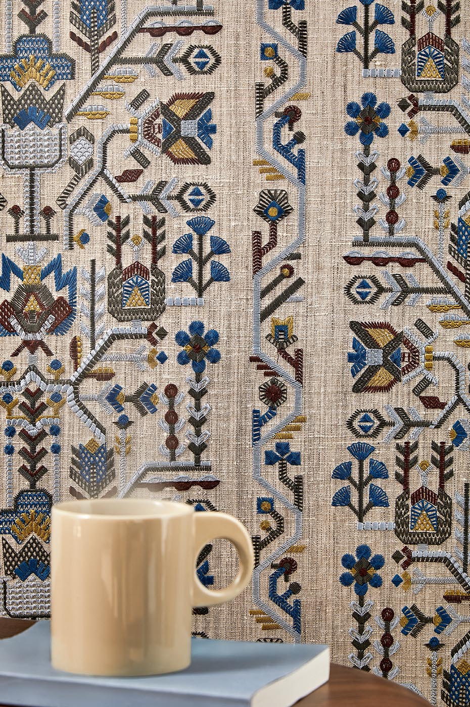 Inspiré des boiseries scandinaves peintes, ce motif, construit sous forme de larges bordures, est brodé sur un support contenant majoritairement de la soie.