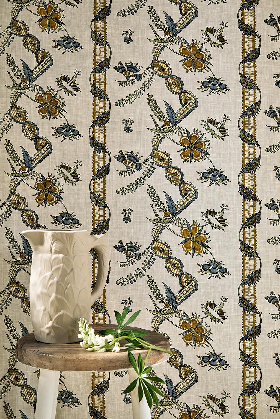 Ce motif floral reproduit une charmante toile de coton imprimée à la planche de bois en France durant la seconde moitié du XVIIIe siècle, conservée dans les archives de la Maison. On retrouve la même délicatesse dans les imprimés scandinaves de cette époque, utilisés dans la mode ou l’ameublement.
