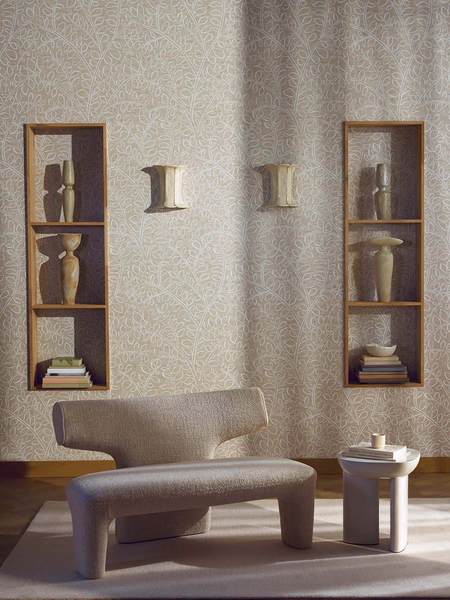 Grand motif végétal imprimé en encre 3D sur un support en lin naturel contrecollé sur intissé. Les feuilles de cette grande branche dessinée à la main semblent danser sur le mur.