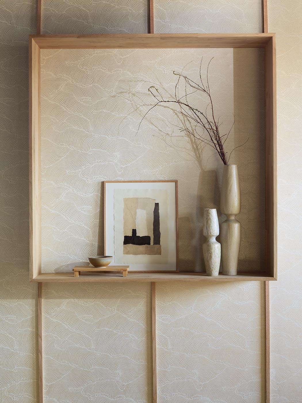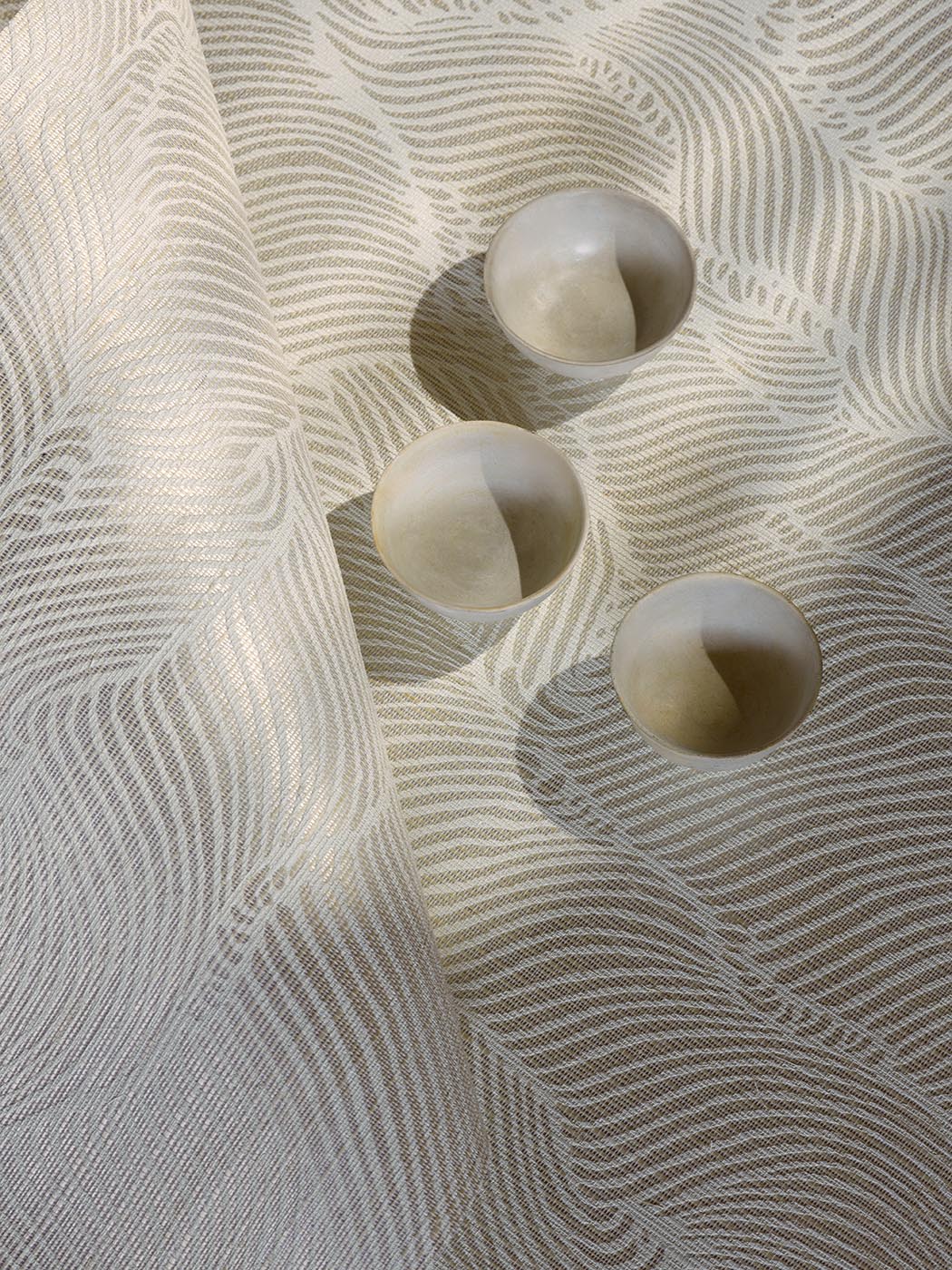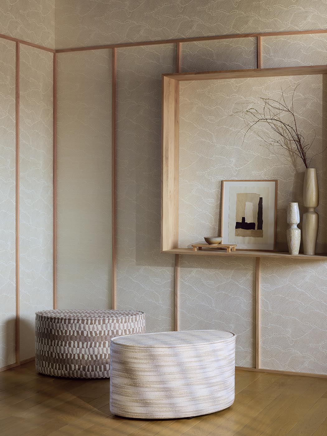 Le désert de Mongolie est ici évoqué par un trait simplifié et abstrait. LA VALLÉE DES DRAGONS est imprimée en encre 3D sur un sisal contrecollé sur intissé au coloris naturel, ce qui lui confère un volume et un reflet de lumière singuliers. Existe en tissu coordonné.