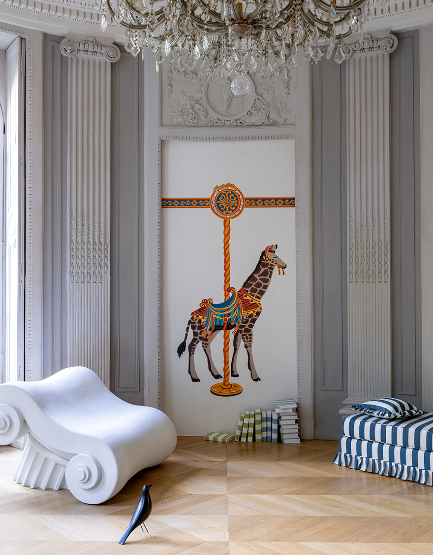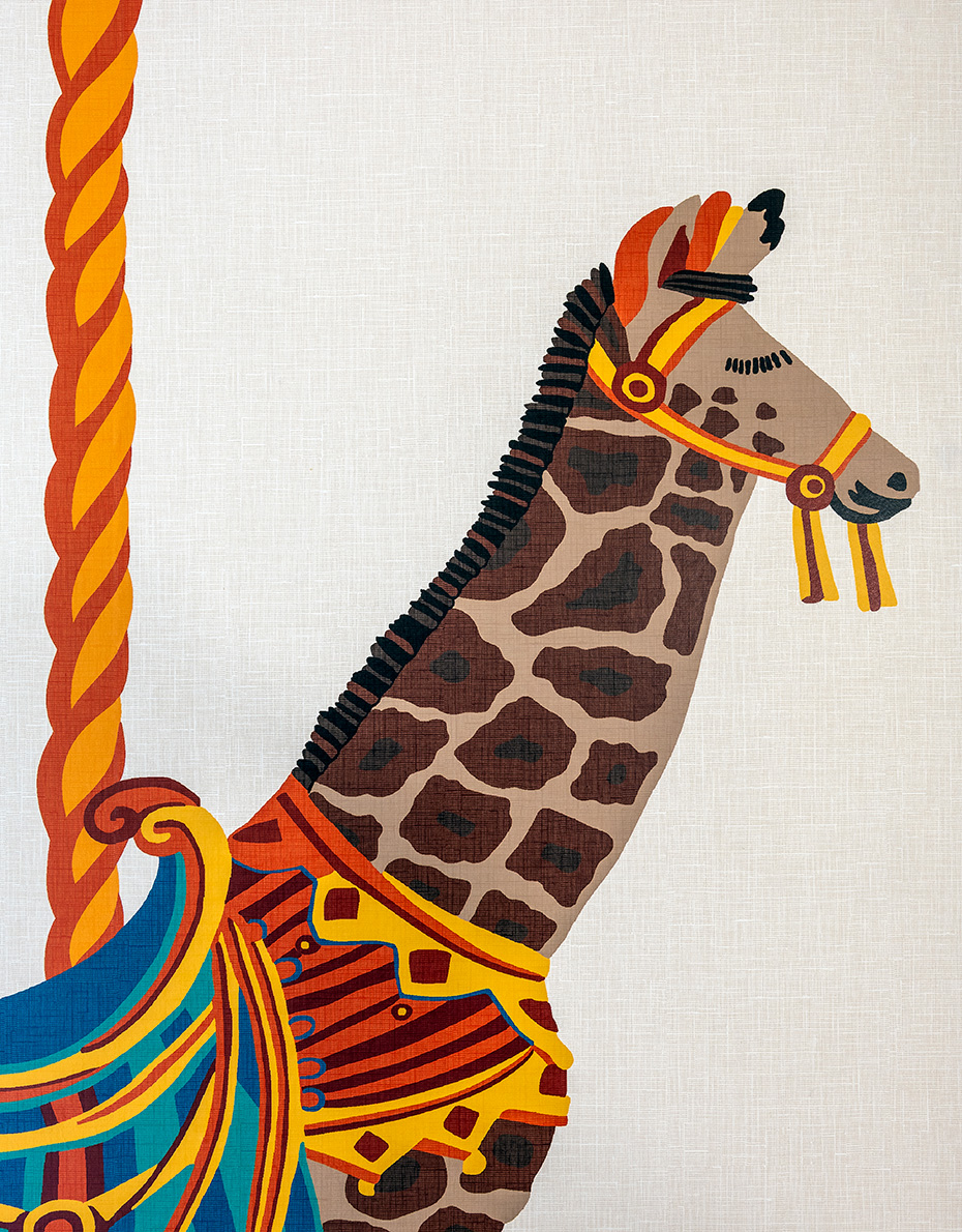 En écho au majestueux panneau brodé en textile, LA GIRAFE DU CARROUSEL, imaginée par la Maison Caspari, se décline en une version panoramique de 3 mètres de haut sur 140 cm de large. Imprimée sur une fine texture de lin en trompe-l’œil, LA GIRAFE DU CARROUSEL est raccordable à souhait.