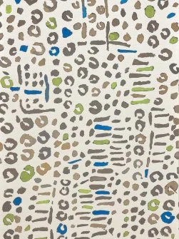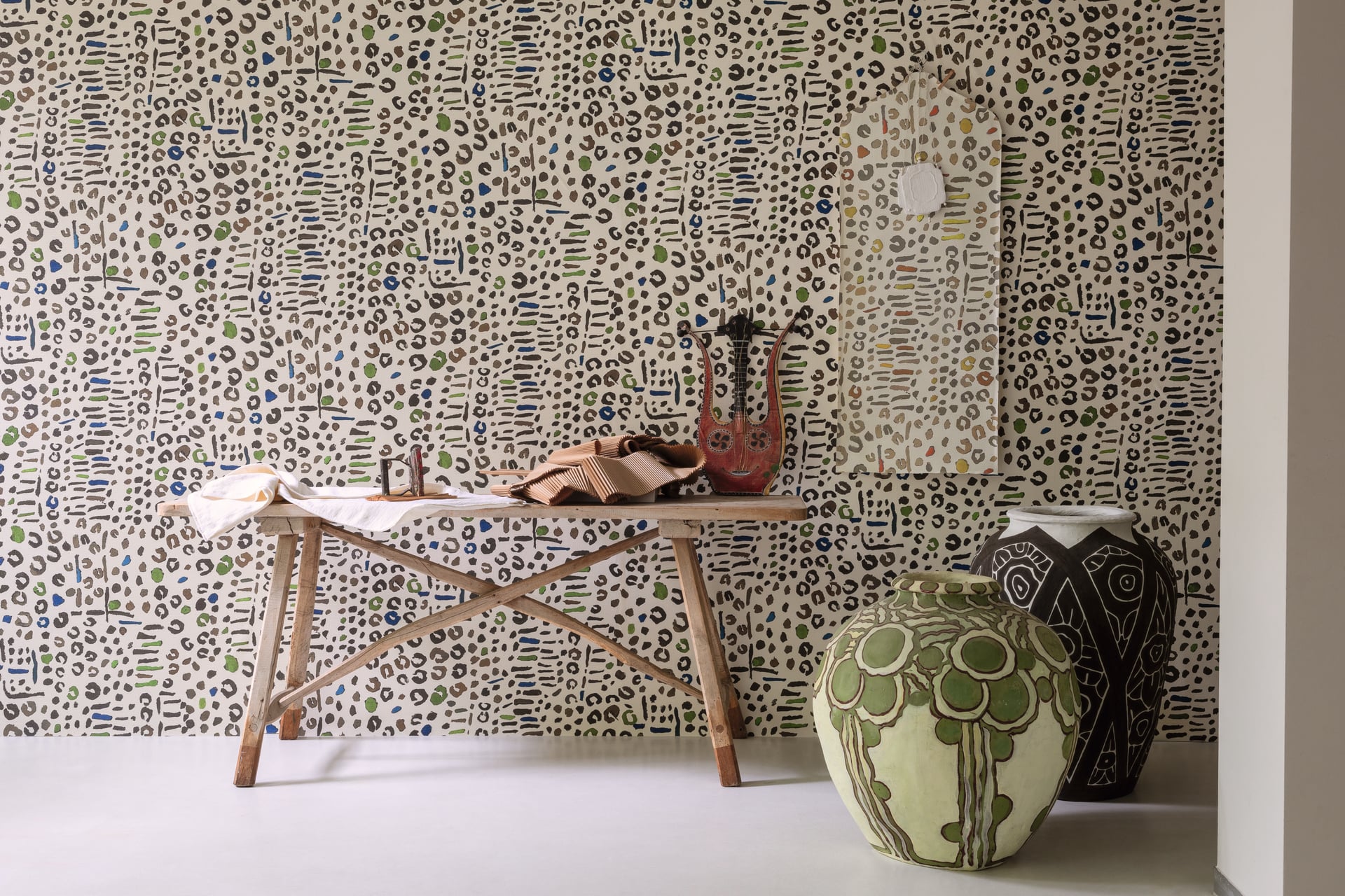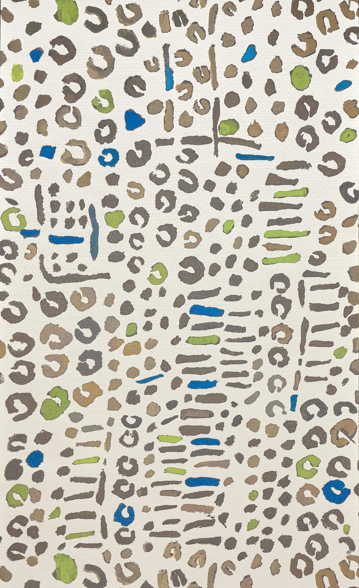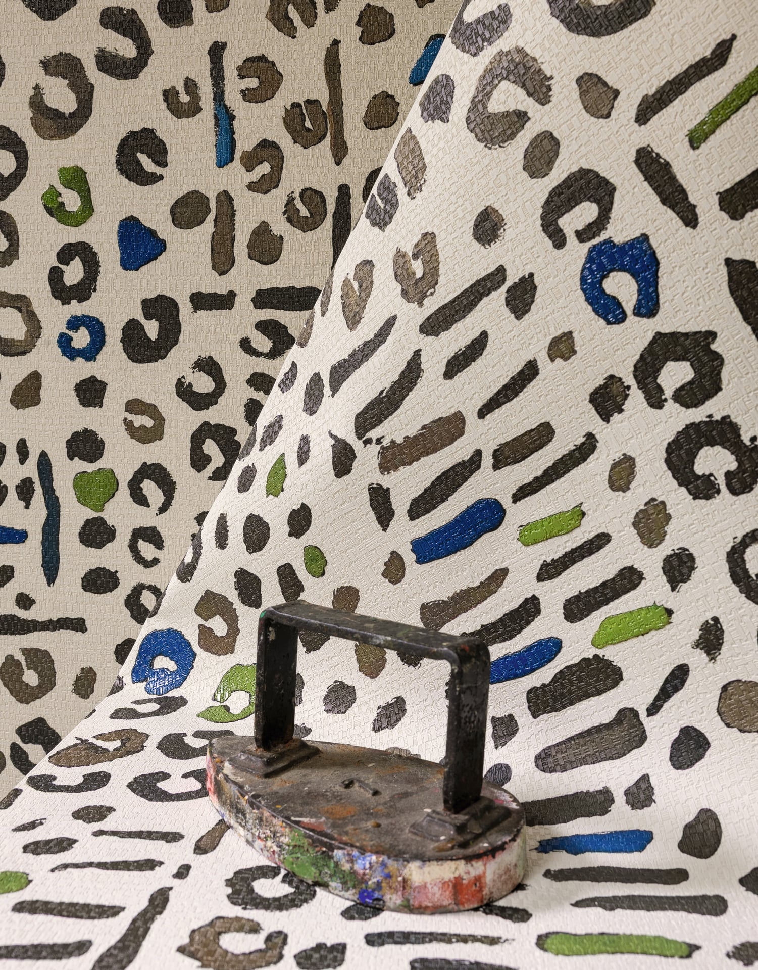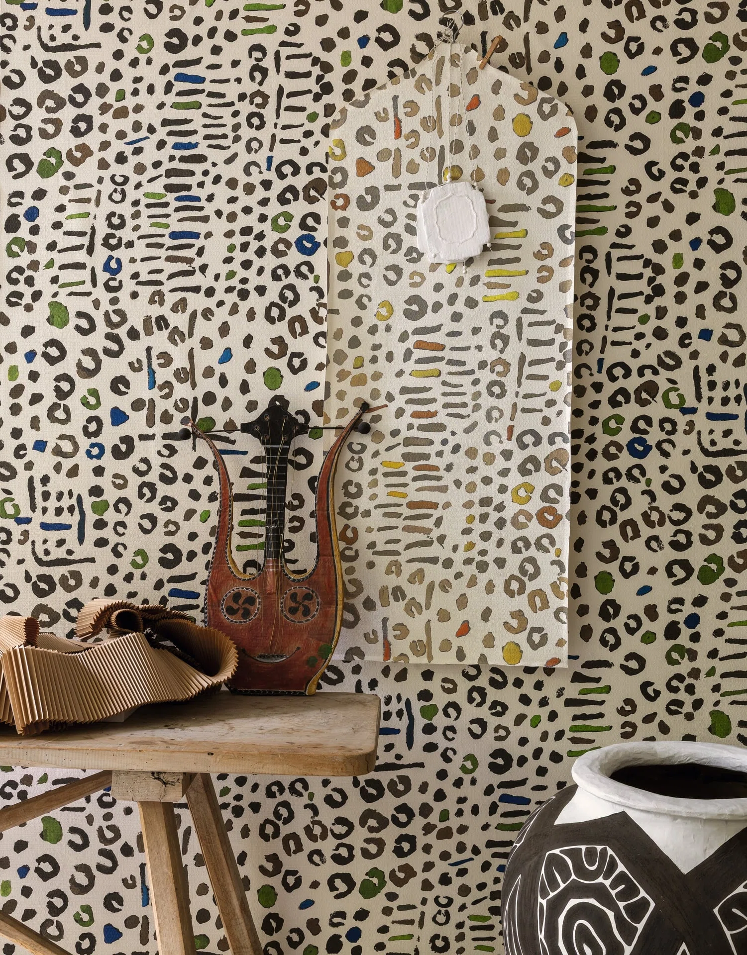 Isabelle ne copie pas l’Afrique, elle la ressent. Elle capte les rythmes, les silences et les forces. Ces symboles primitifs rappellent les tissus, les peintures murales ou les empreintes dans la boue et le sable. Le papier devient un espace pour faire vibrer les cultures avec élégance et respect. Impression digitale sur vinyle au gaufrage natté.
