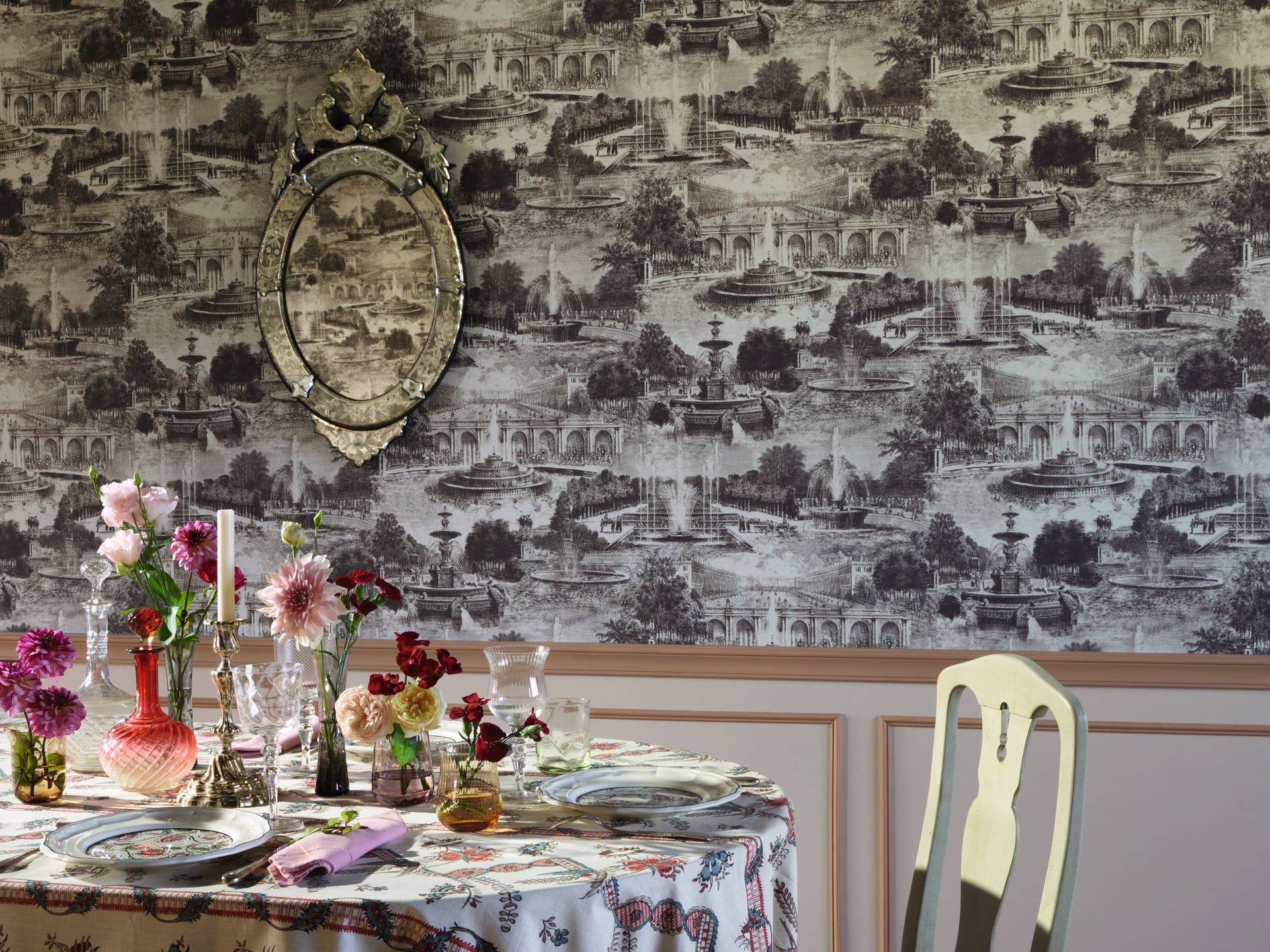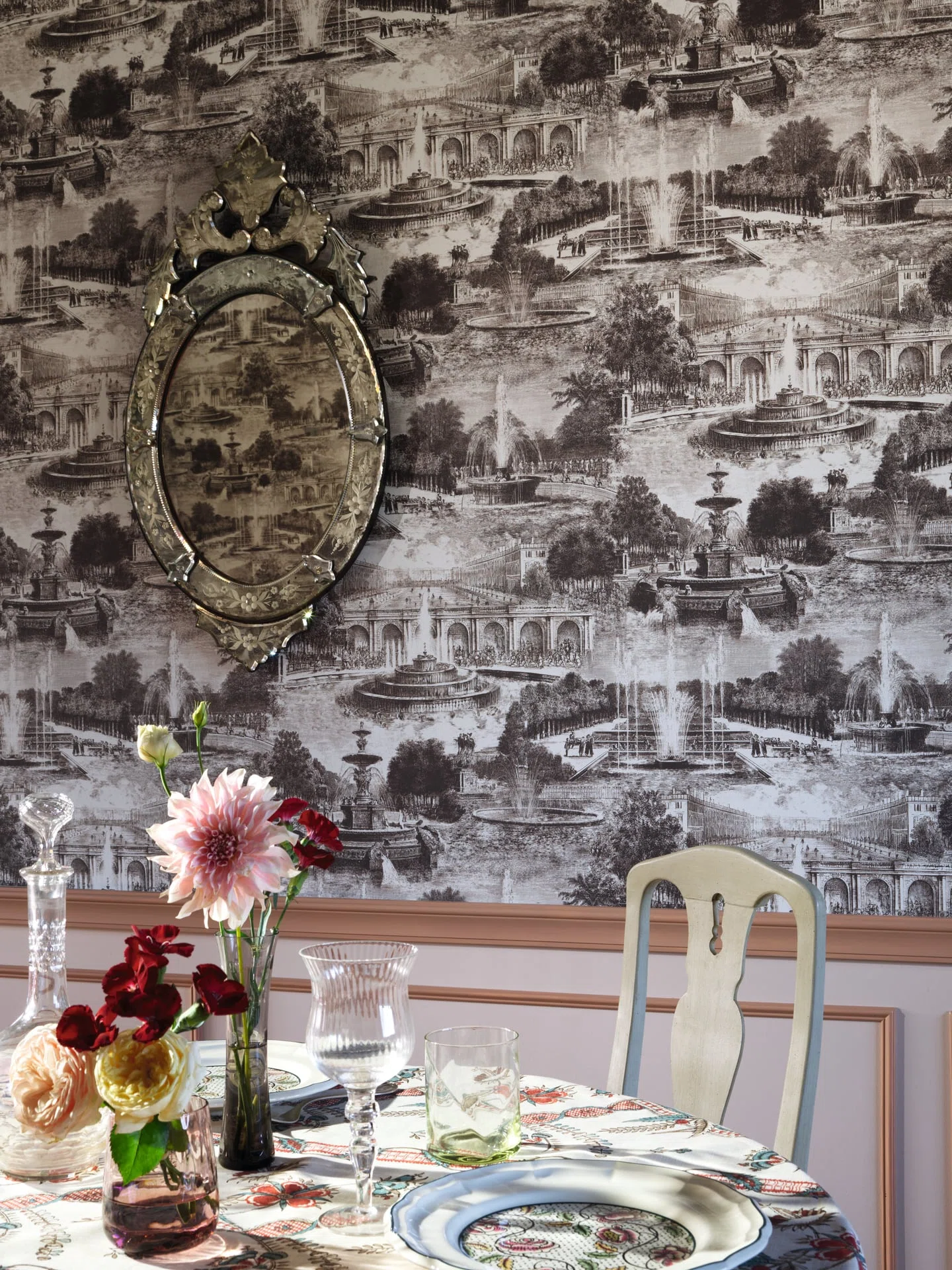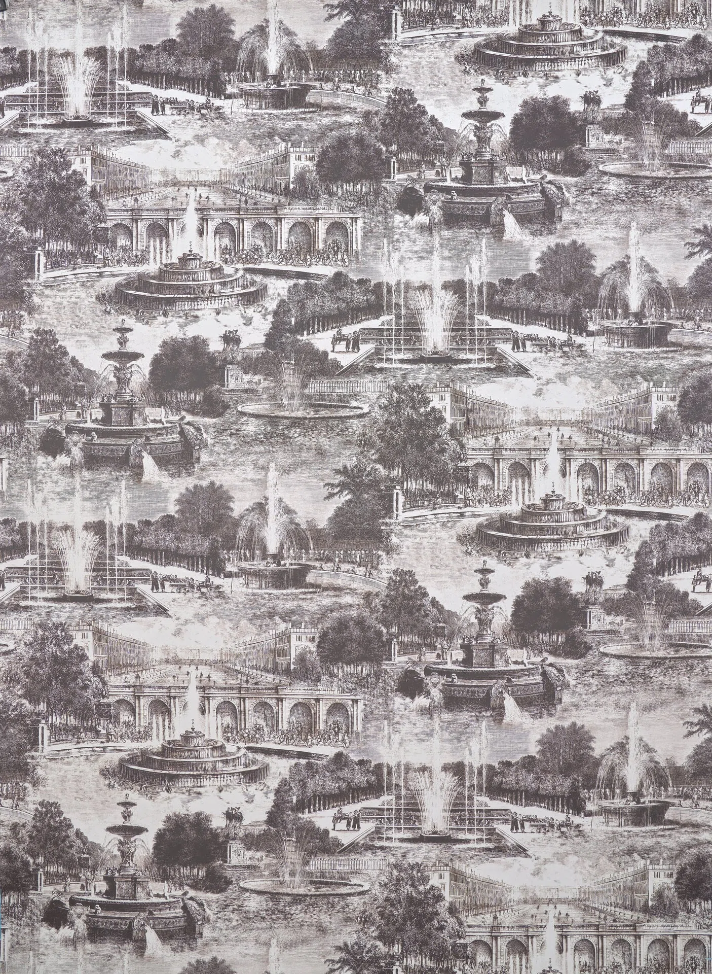 L’eau est l’ornement central des jardins français, surpassant même l’architecture végétale et les bosquets. On la retrouve sous diverses formes : en cascades dans certains bosquets, jaillissante des fontaines, ou paisiblement étendue en vastes nappes comme les bassins, où miroitent le ciel et la lumière. Les Fontainiers est un joli dessin imprimé sur un intissé fibreux en grande largeur, exprimant le foisonnement créatif de l’époque.