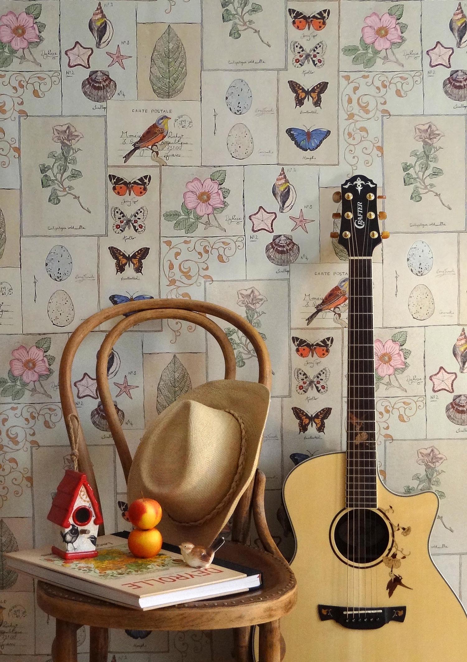 A la façon d'un pèle-mêle, des cartes postales et des planches de botanistes présentant des coquillages ou des feuilles, des papillons sont délicateme...