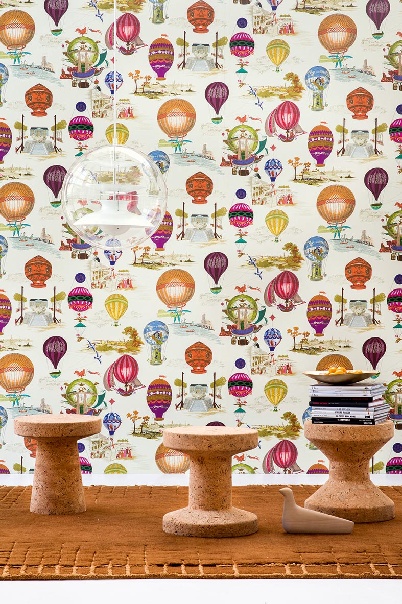 Ce papier peint met en scène un ensemble d'aéronefs tirés de gravures françaises datant des années 1770. Il évoque les premiers envols de ballons. Support intissé. Papier peint non émargé vendu au mètre. Ce dessin se décline égalemment en tissu : F2134.