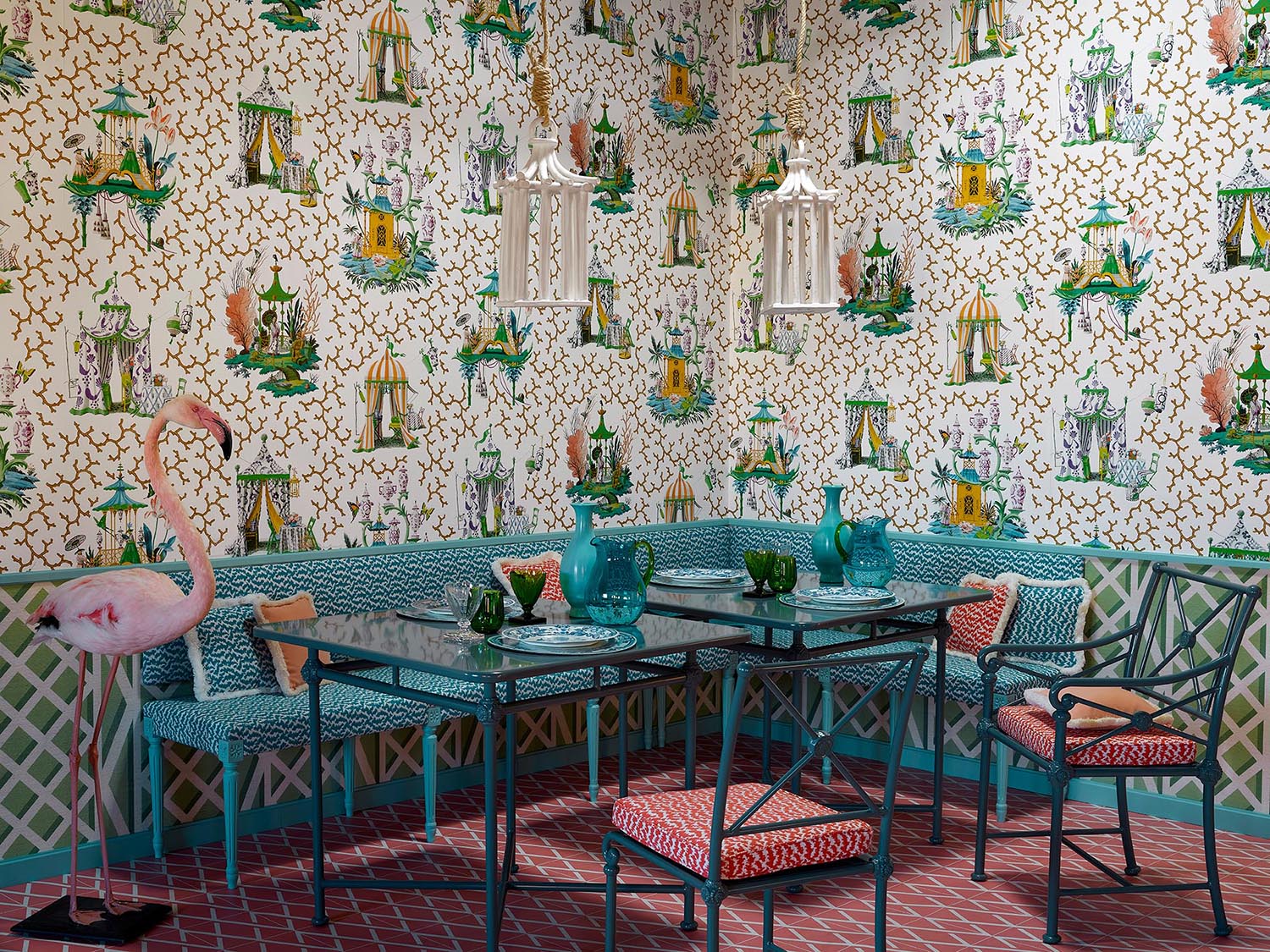 On y retrouve le goût pour la célébration, l’amour des jardins et un subtil classicisme recoloré dans des tonalités vives pour une décoration sophistiquée et élégante.