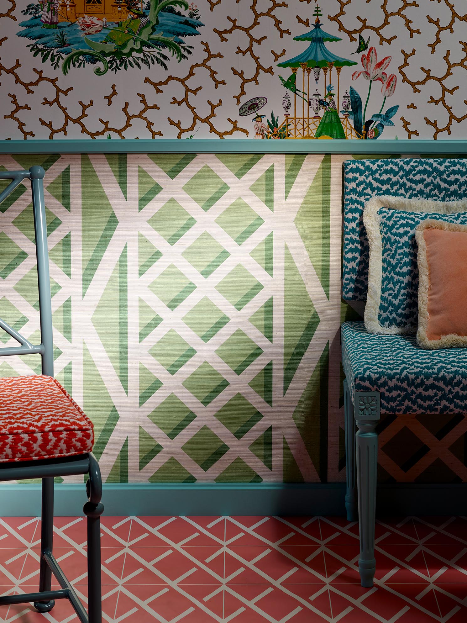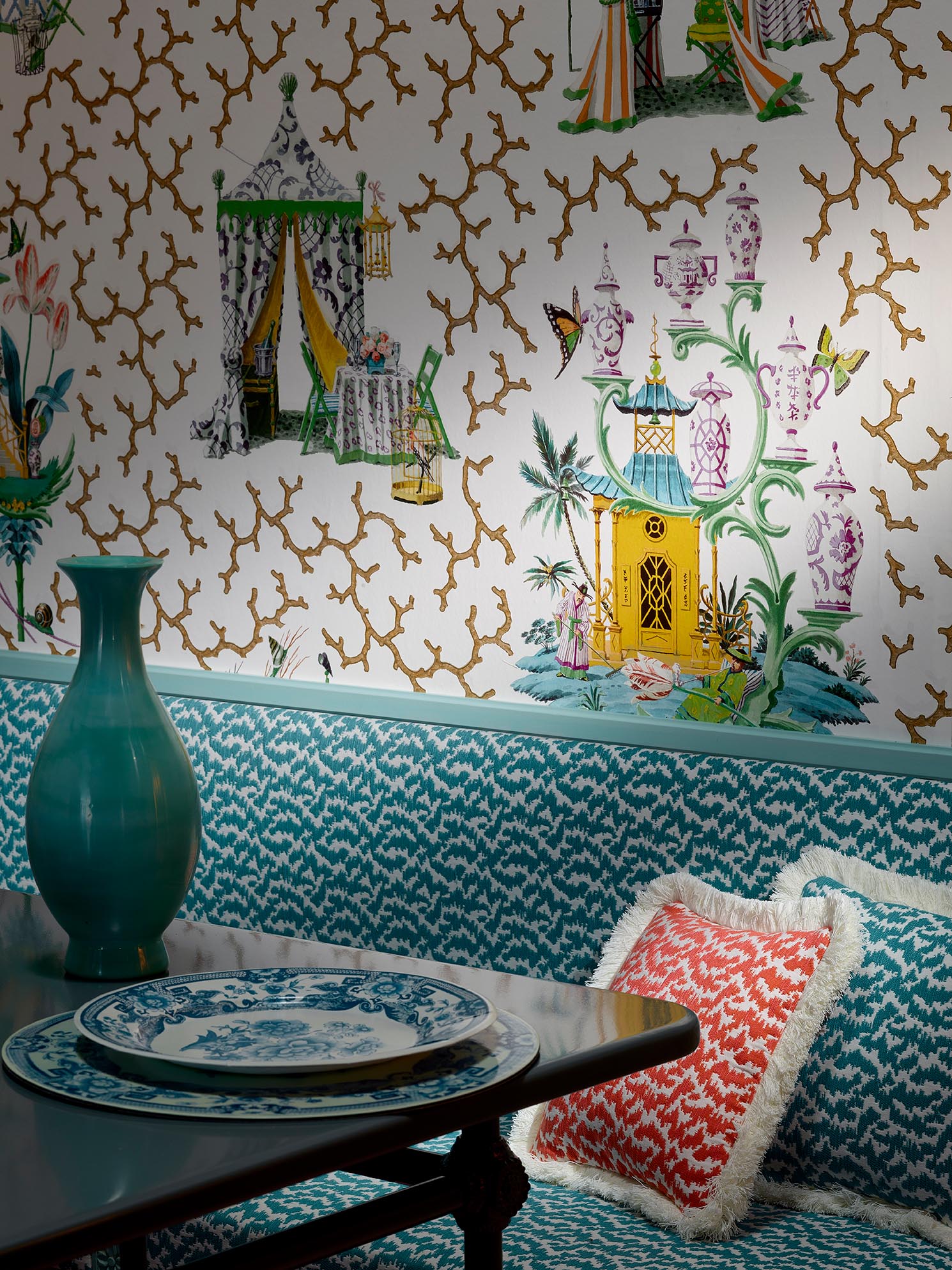 L'artiste Harrison Howard a créé différentes scènes mêlant des folies spectaculaires du XVIIIe siècle et des chinoiseries inspirées de Pillement avec une touche contemporaine. Le studio de la Maison Pierre Frey a décidé de les associer avec un motif classique de corail provenant d'un textile vintage rappelant les gorgones conservées dans un cabinet de curiosités. Une composition splendide comme un bijou. Imprimé en grande largeur sur intissé glacé.