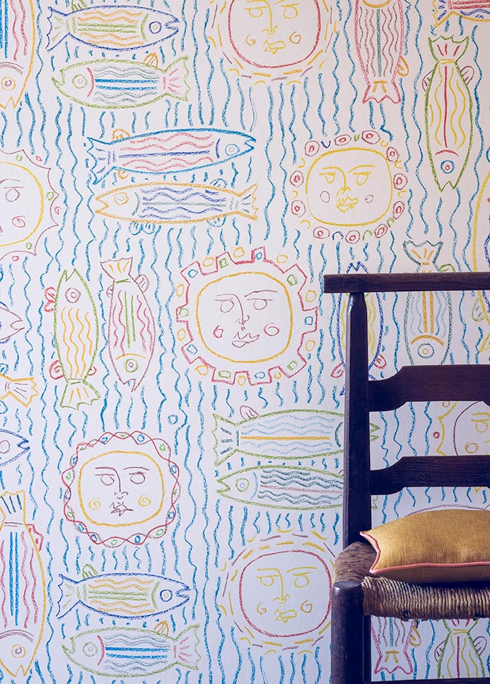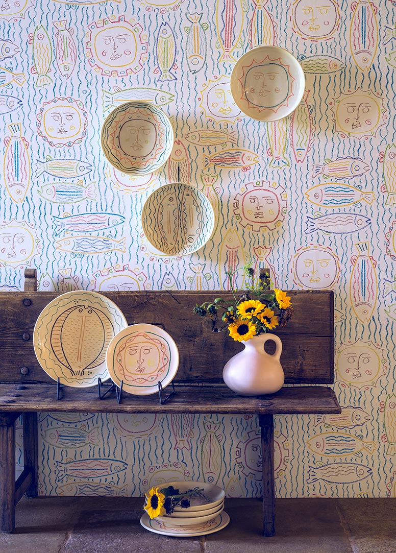 L'imprimé CALANQUES dessiné à quatre mains par les céramistes de l'Atelier Buffile exprime leur vision personnelle et artistique de la Côte d'Azur. Le graphisme des motifs aux traits légers spontanés et colorés n'est pas sans évoquer le travail de leur aïeul créateur de l'atelier dans les années 50.