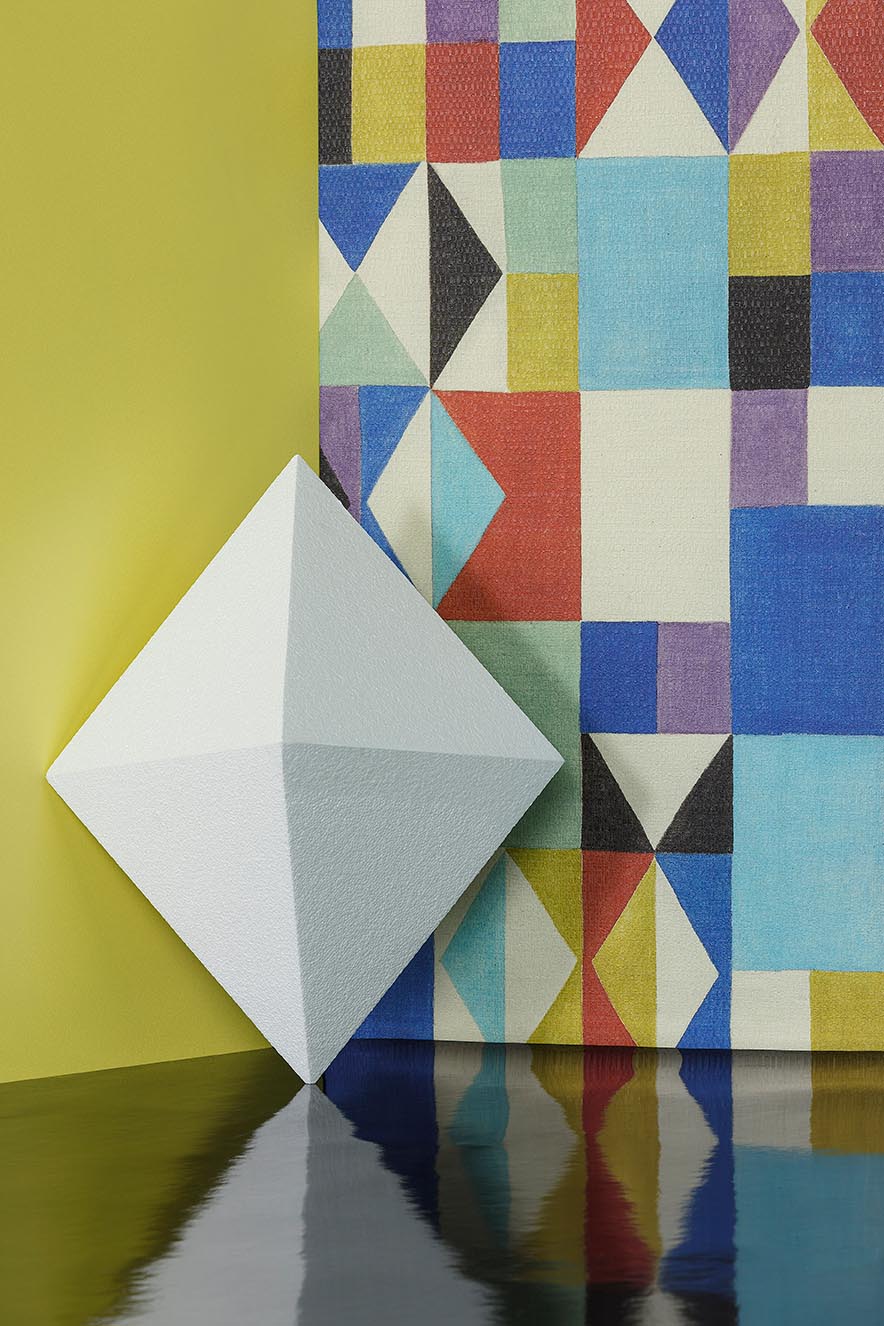 Composition géométrique peinte à la brosse évoquant les costumes colorés du personnage d’Arlequin. Impression sur vinyle à l’aspect de natte artisanale et à la finition mate.
